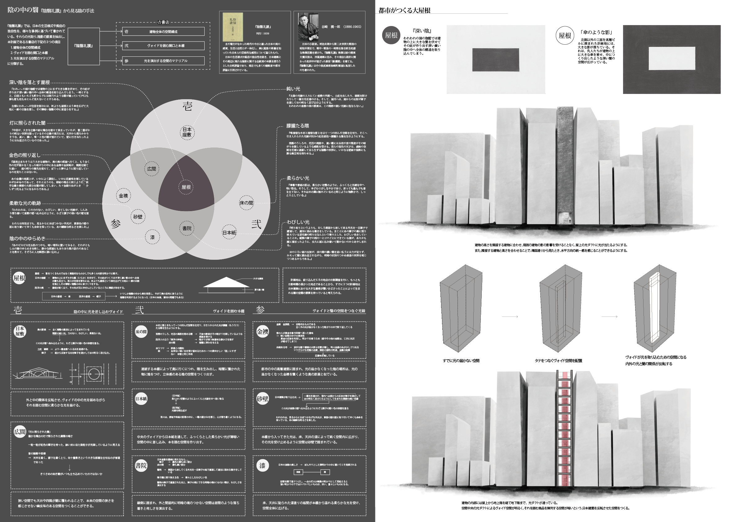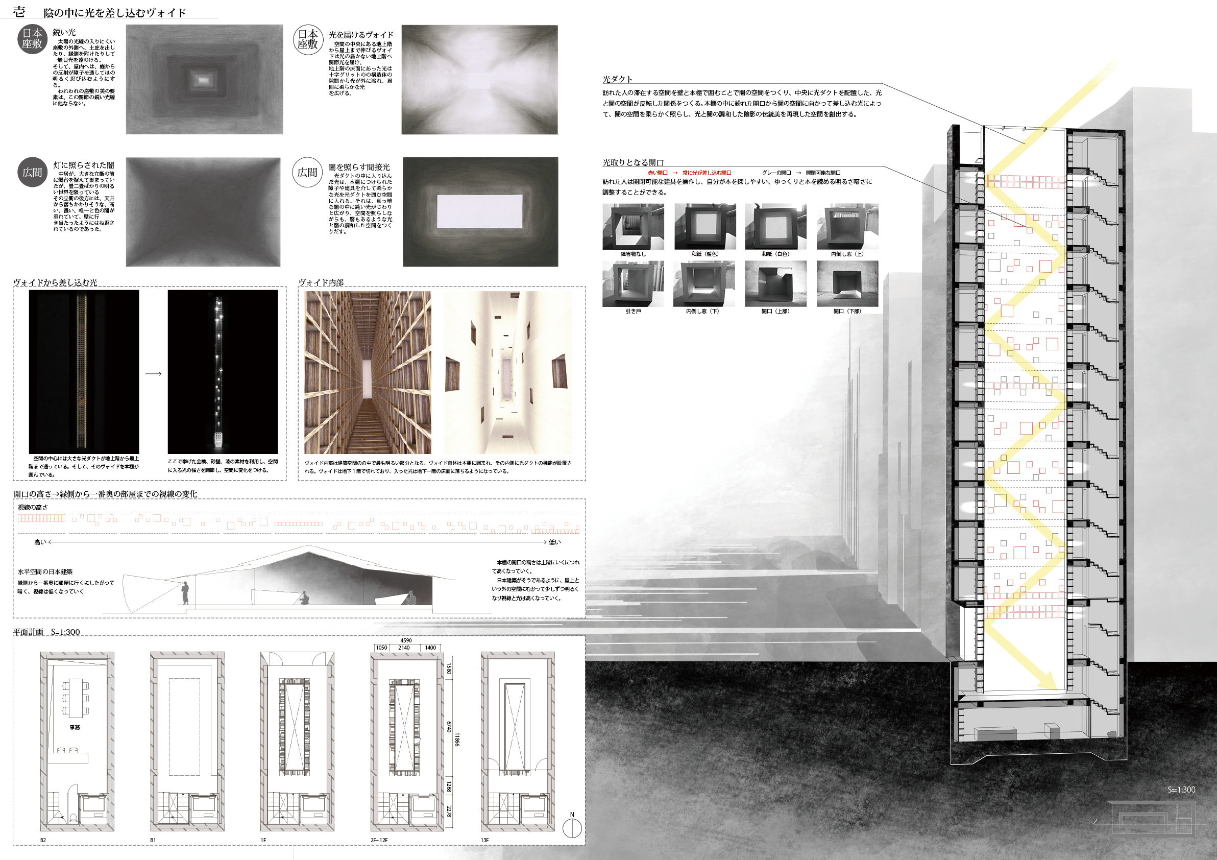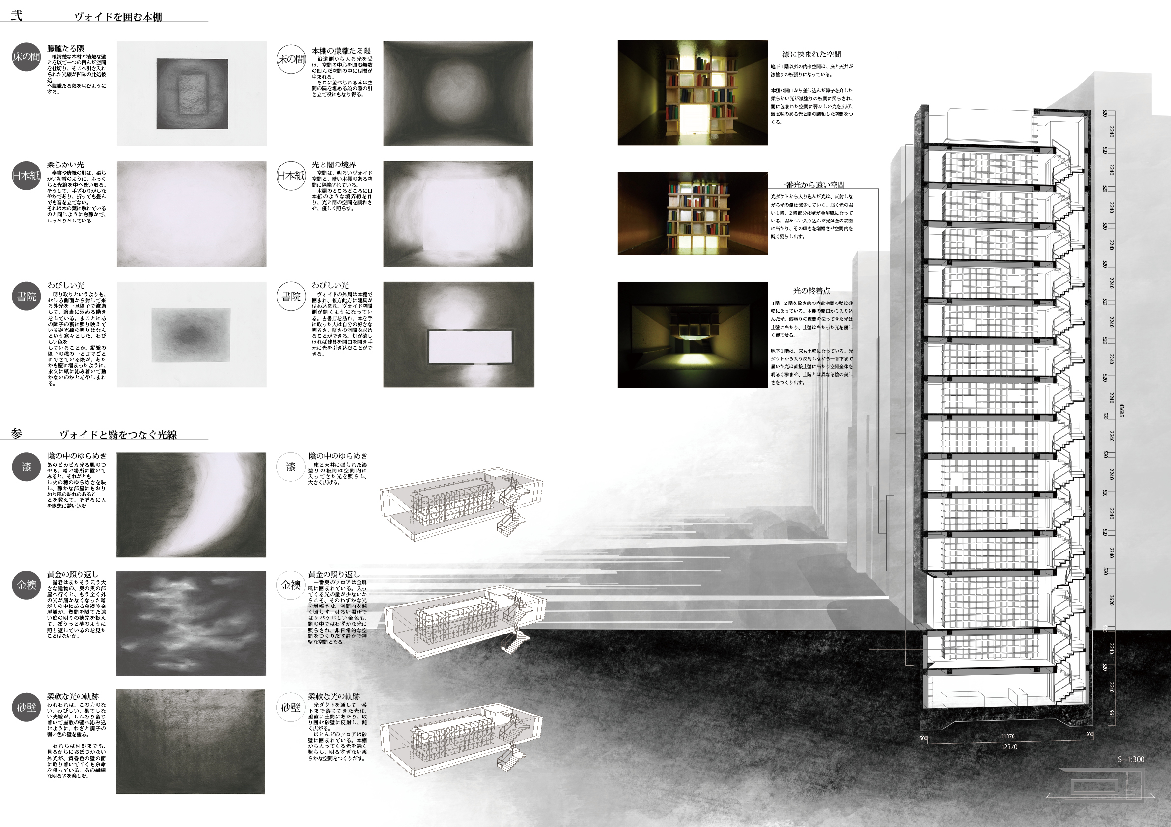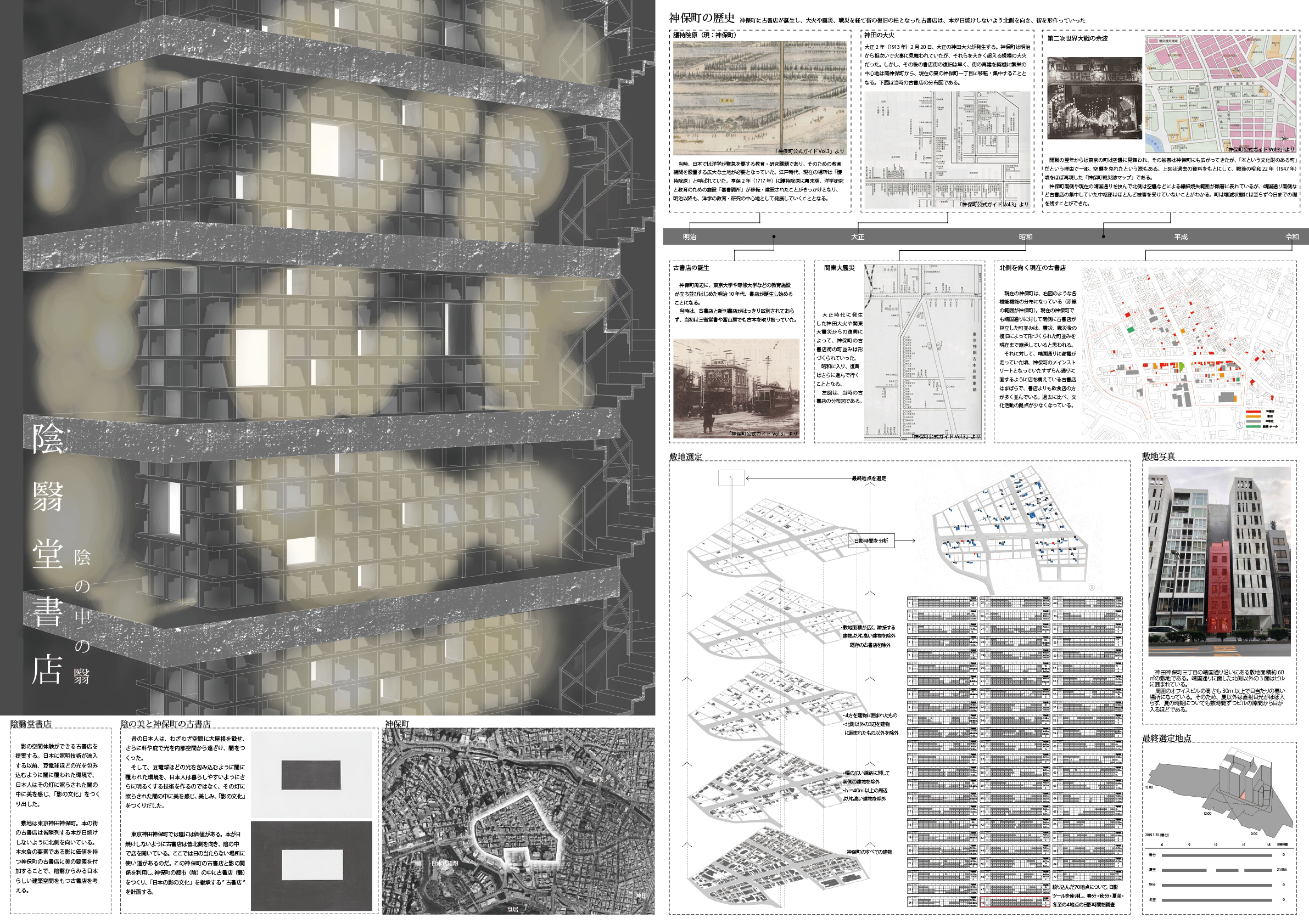 この神保町の古書店と影の関係を利用し、神保町の都市(陰)の中に古書店(翳)をつくり、現在は忘れられた「影の文化」を現代の東京の都市に提案する。