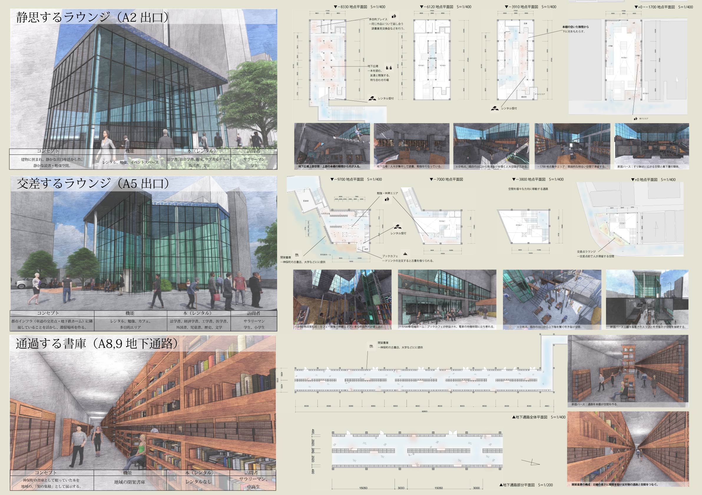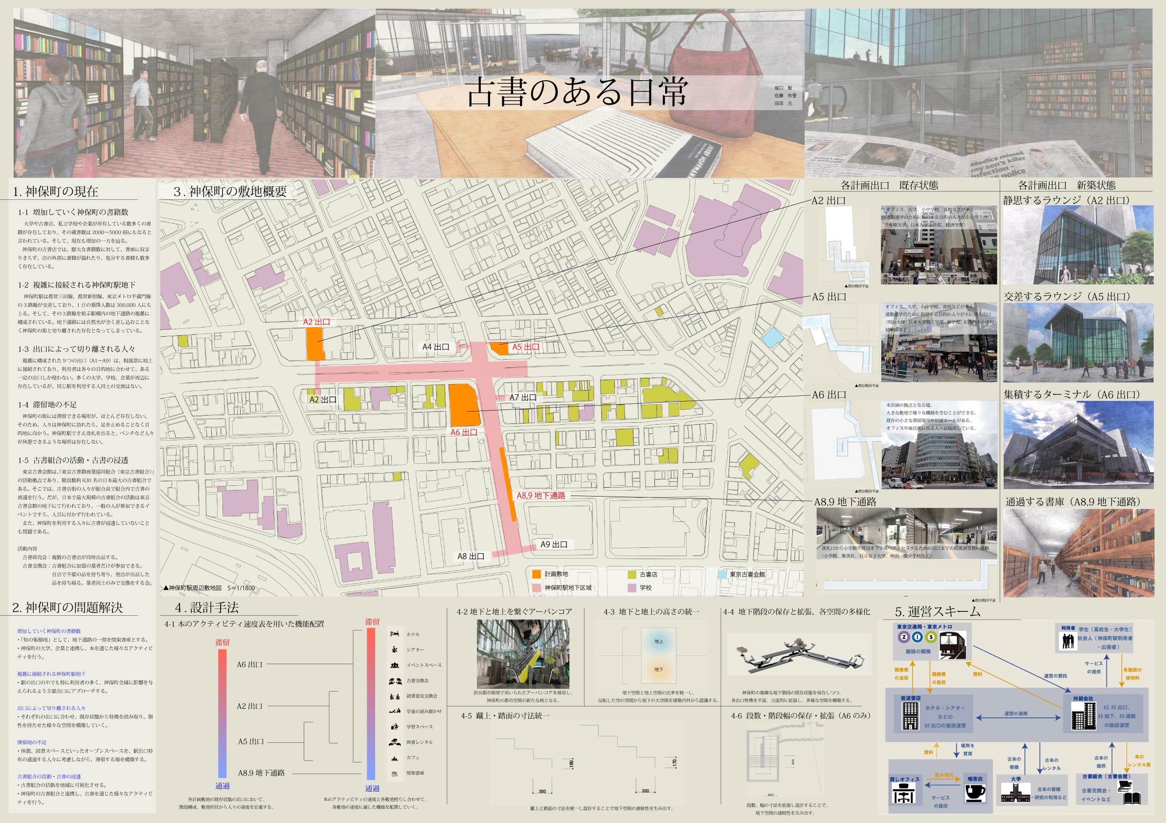 この提案では、古書組合・教育機関・神保町駅の利用者を結びつけるため、神保町駅の出口の中から3つの出口と1つの通路にアプローチする。