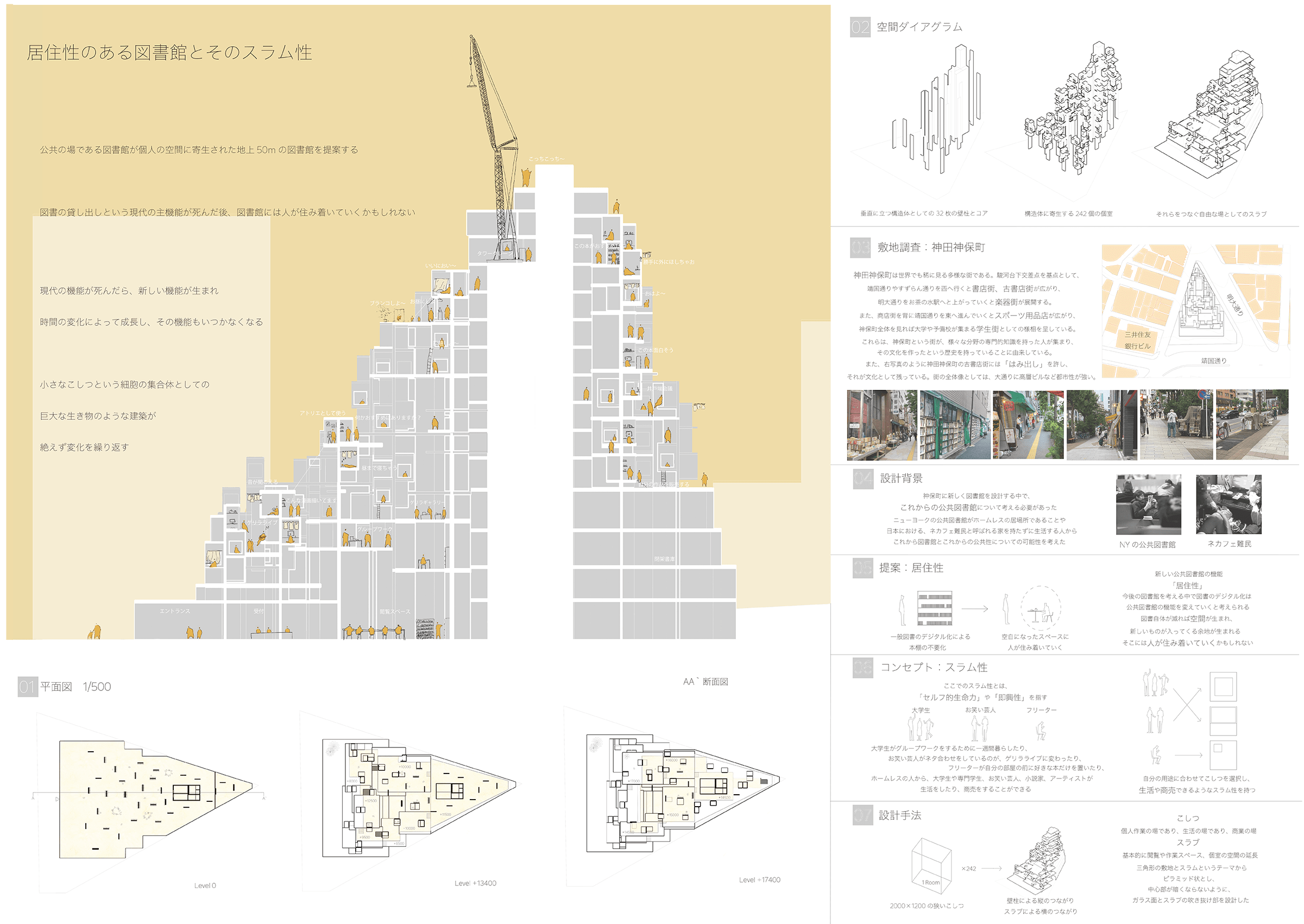 公共空間に人が住み着き、新しい図書館を作り上げていく住人のセルフ的生命力や即興的な振る舞いなどをスラム性と表現し、生活から商売まで自由に行う場としての公共図書館を提案する。神保町は世界でも稀に見る多様なでまちである。駿河台下交差点を起点として、靖国通りやすずらん通りを西へ行くと書店街、古書店街が広がり、明大通りを御茶ノ水駅へと上がっていくと楽器街が展開する。また、商店街を背に靖国通りを東に進んでいくとスポーツ用品店が広がり、神保町全体を見れば大学や予備校が集まる学生街としての様相を呈している。これらは、神保町というまちが、様々な分野の専門的知識を持った人が集まり、その文化を作ったという歴史を持っていることに由来する。このような神保町に新しく図書館を設計する中で、これからの図書館であったり、公共性というものについて、N Yの公共図書館におけるホームレスの問題や東京のネカフェ難民などの問題を背景に、大学生や専門学生、お笑い芸人、小説家、アーティストなどが生活・作業・商売を行える場を設計した。