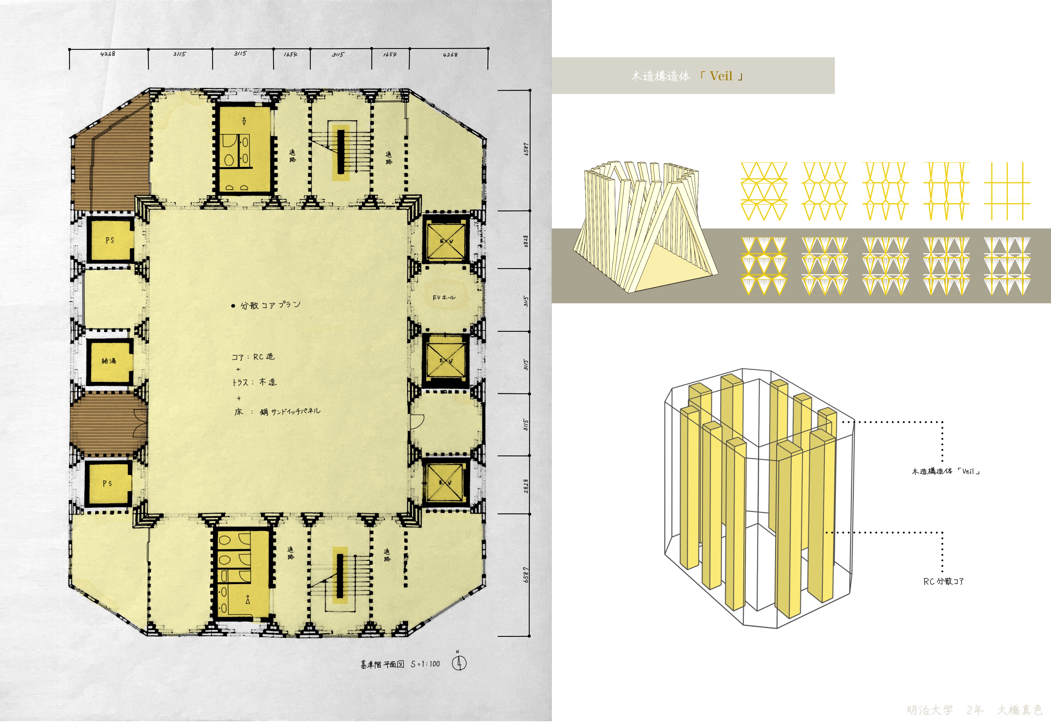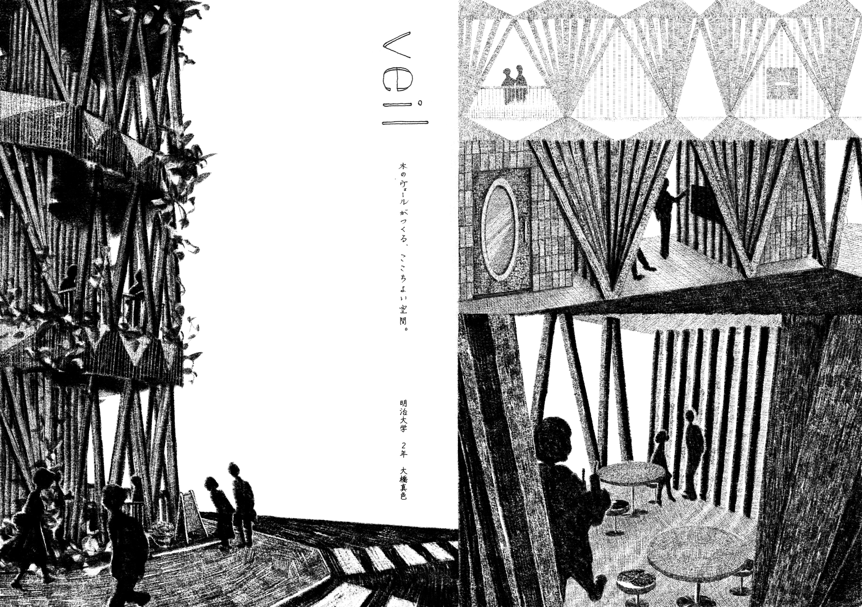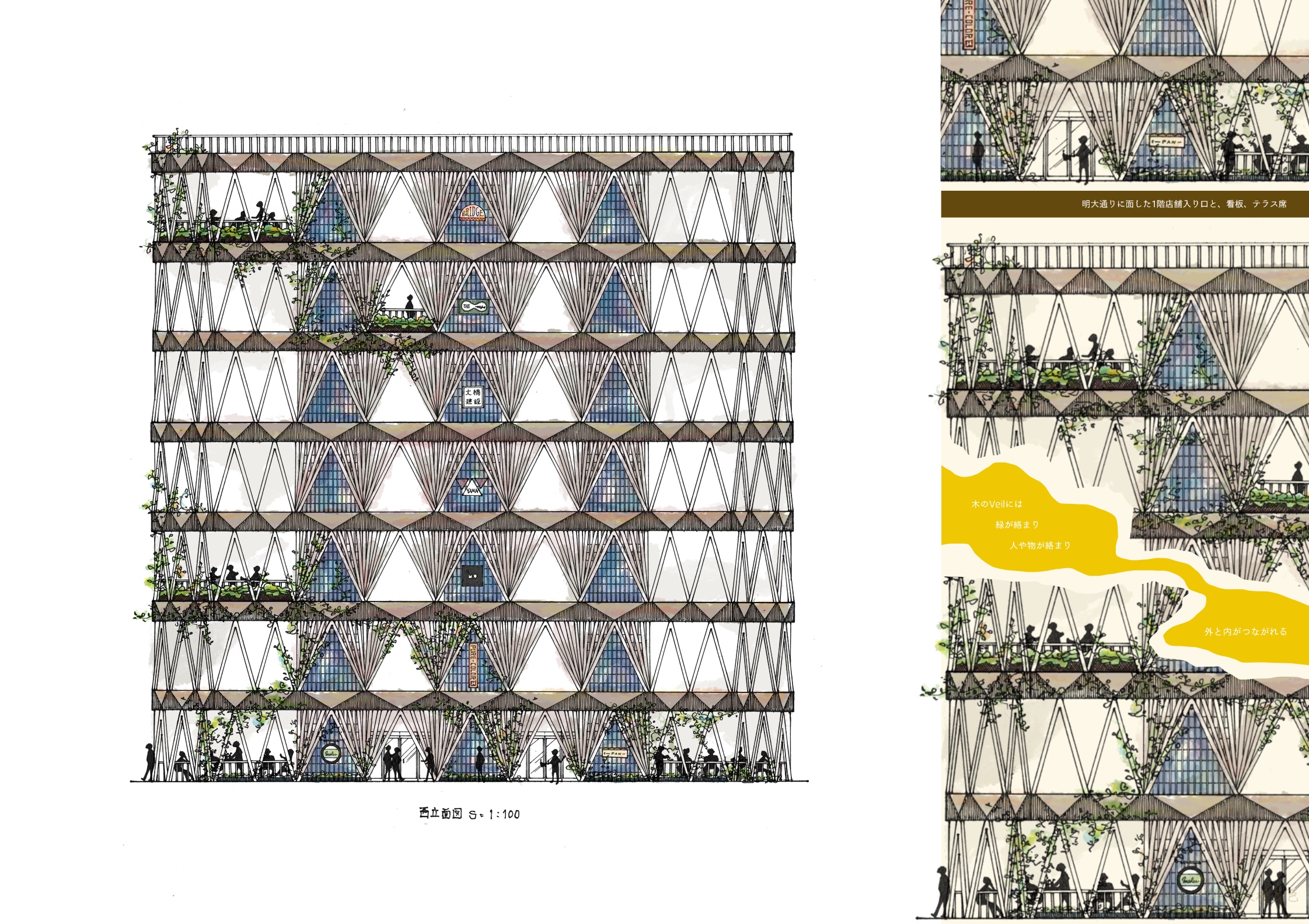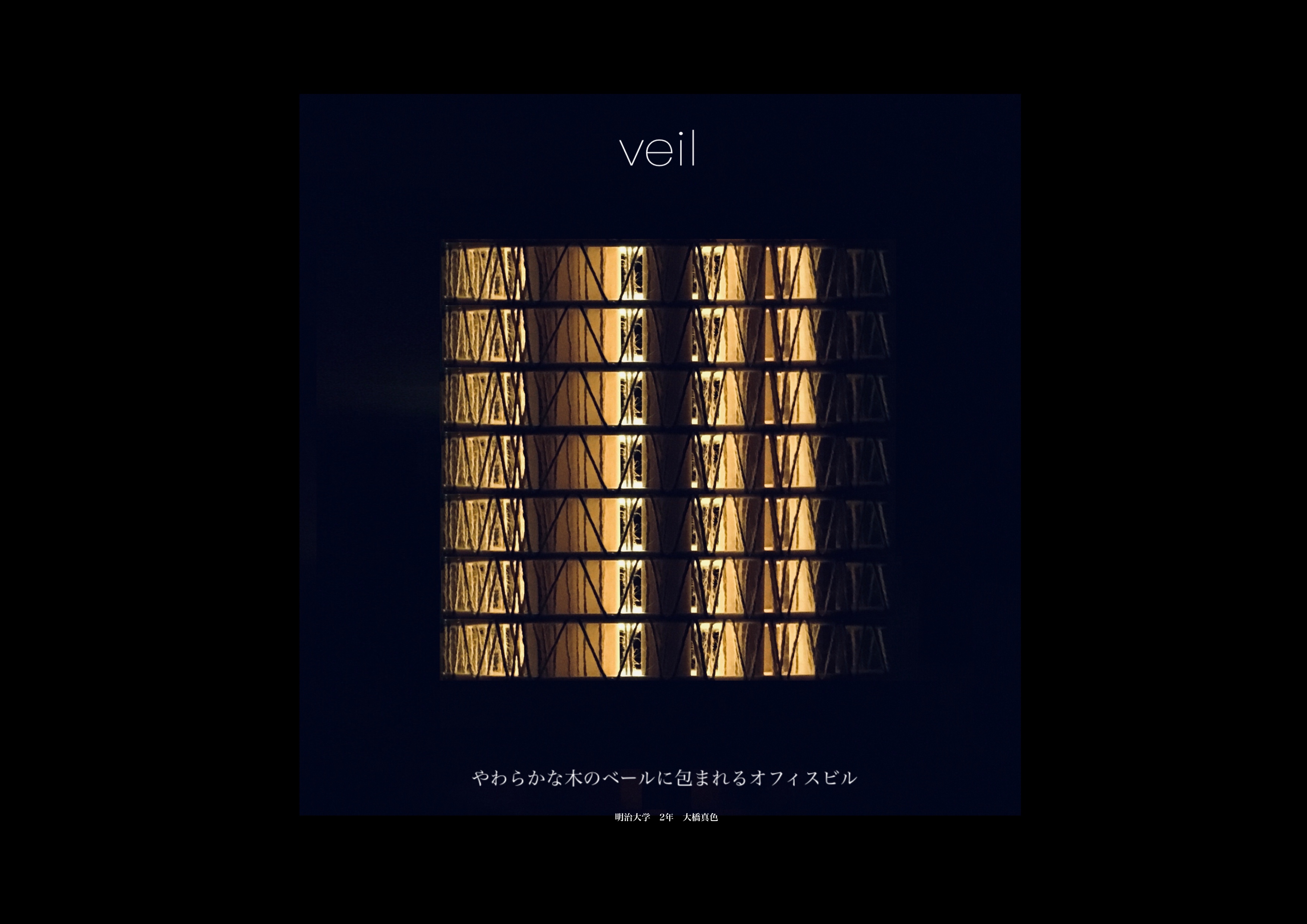 人を、人の意識を絡めとり、建物内外の事物をやわらかく受けとめて繋ぐ、そんなオフィスビルを計画したい。今回の提案では、「Veil」と名付けた木の構造体によってすべてをデザインする。細い木材で構成される木のヴェールは建物全体を包み、心地よいオフィス空間と美しいファサードを創り出す。内と外はやわらかく隔たれ、やわらかく繋がれる。ゆらめく木の構造体は軽やかで親しみやすく、人やモノが絡まる余剰を備えている。