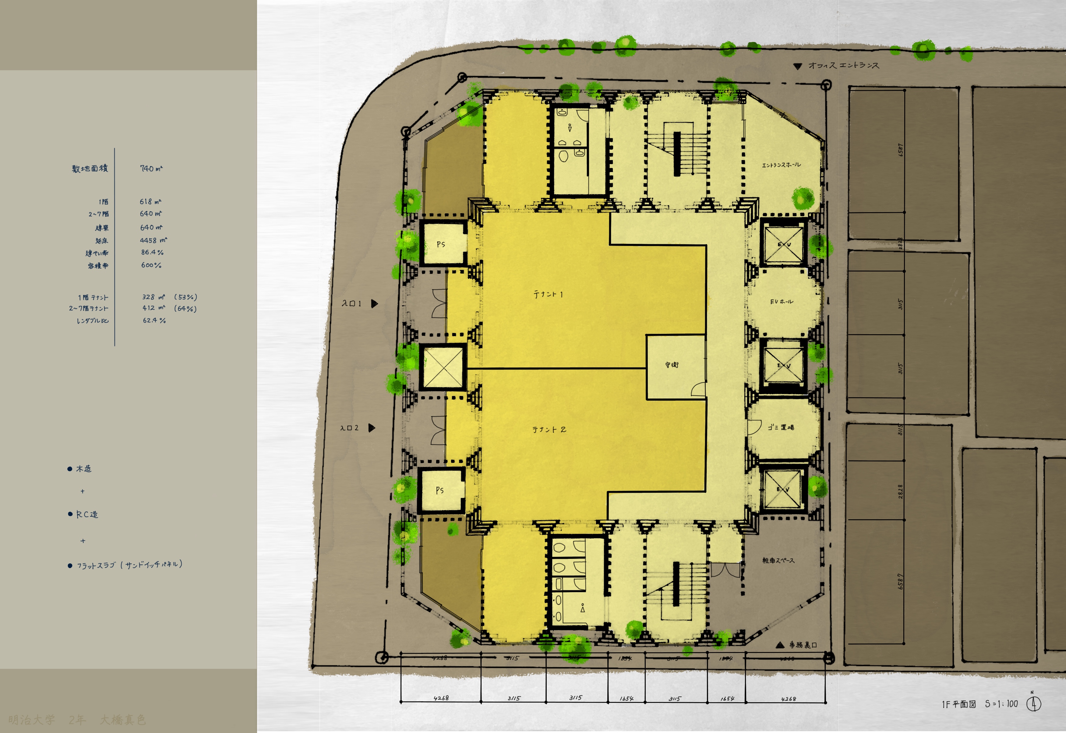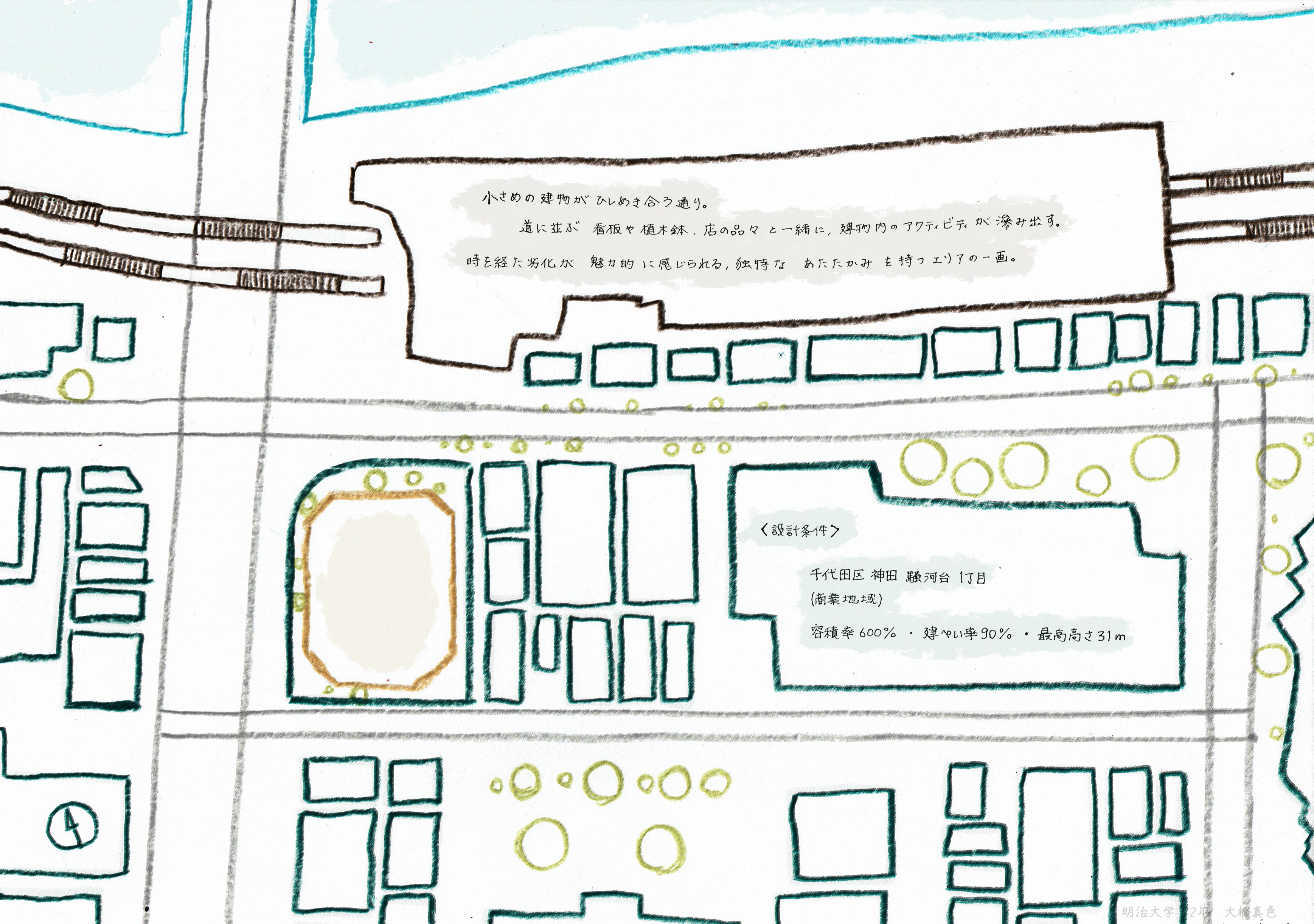 御茶ノ水駅から南へ、明大通りと茗渓通りが交わる交差点の一角に小規模なオフィスビルを計画する。