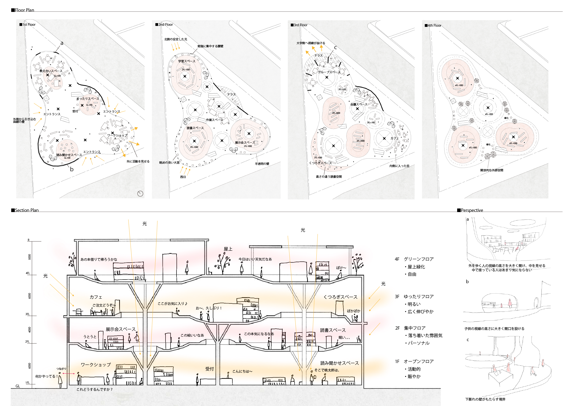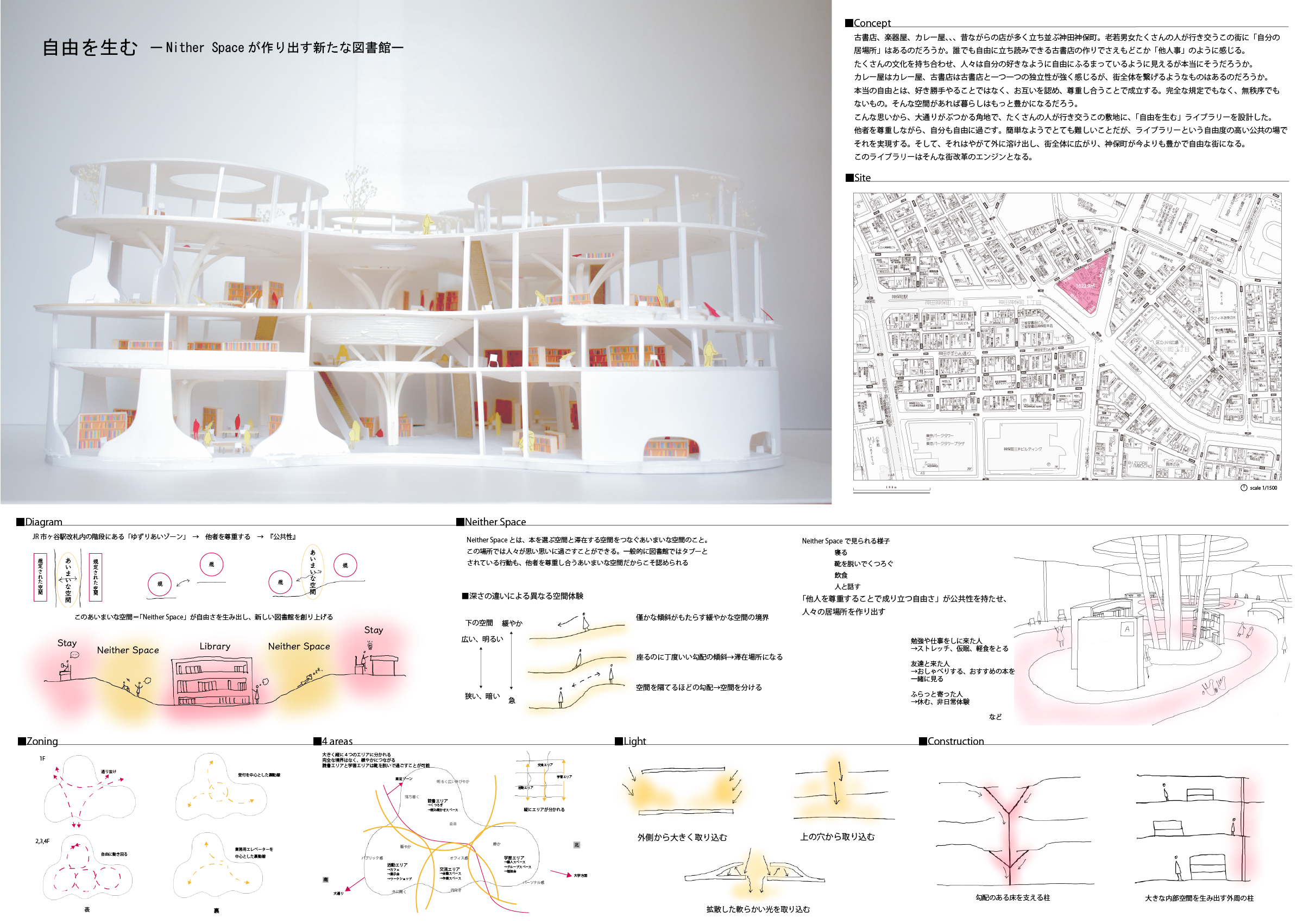 こんな思いから、大通りがぶつかる角地で、たくさんの人が行き交うこの敷地に、「自由を生む」ライブラリーを設計した。他者を尊重しながら、自分も自由に過ごす。簡単なようでとても難しいことだが、ライブラリーという自由度の高い公共の場でそれを実現する。そして、それはやがて外に溶け出し、街全体に広がり、神保町が今よりも豊かで自由な街になる。