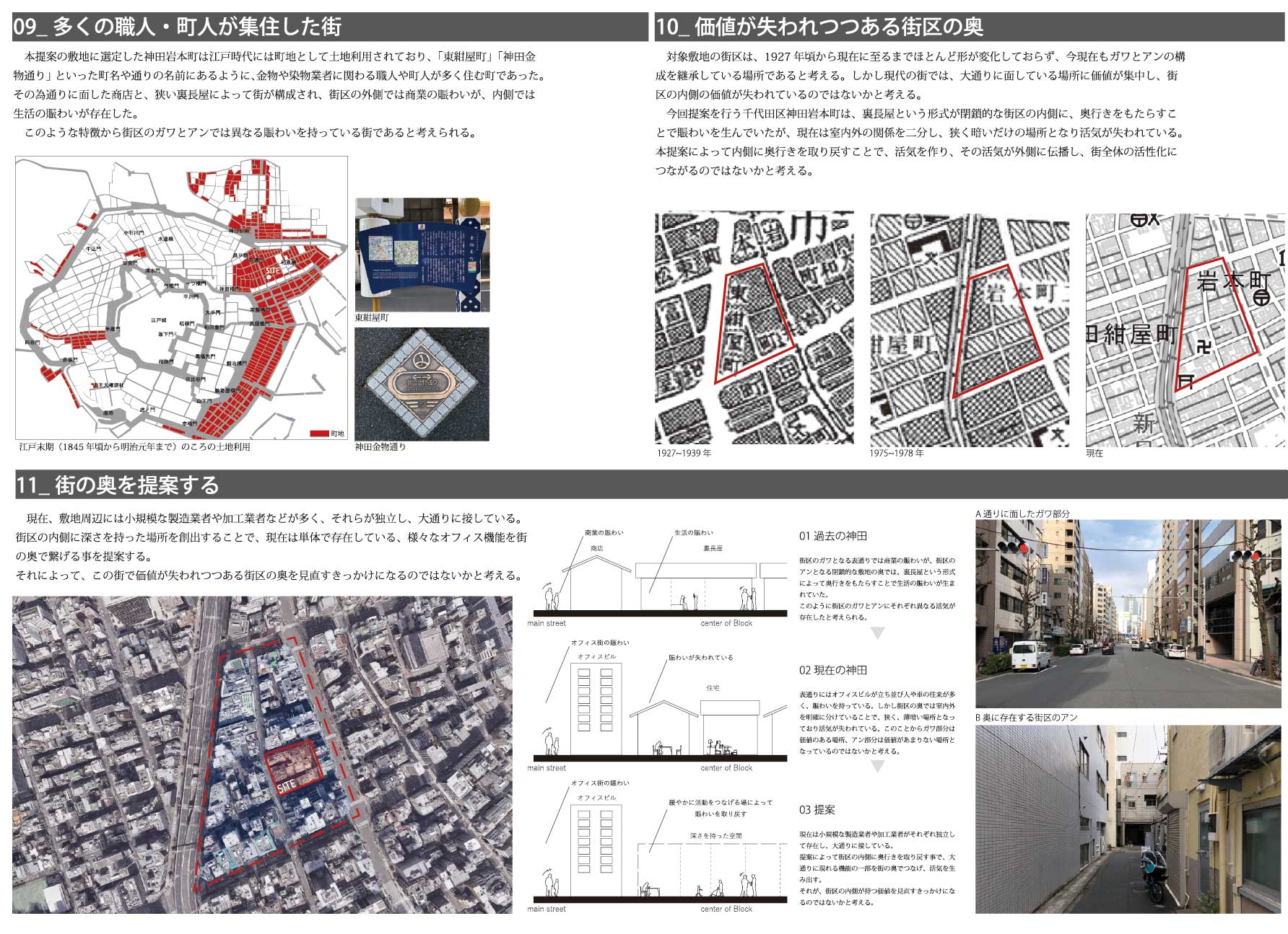 計画敷地に選定した神田岩本町は江戸時代には町屋が多く存在し、「東紺屋町」「神田金物通り」といった町名にあるように金物や染物に関わる職人や町人が多く住む町であった。その為、大通りに面した商店と、裏長屋によって街が構成され、街区の外側に商業の賑わい、内側に生活の賑わいが存在していた。