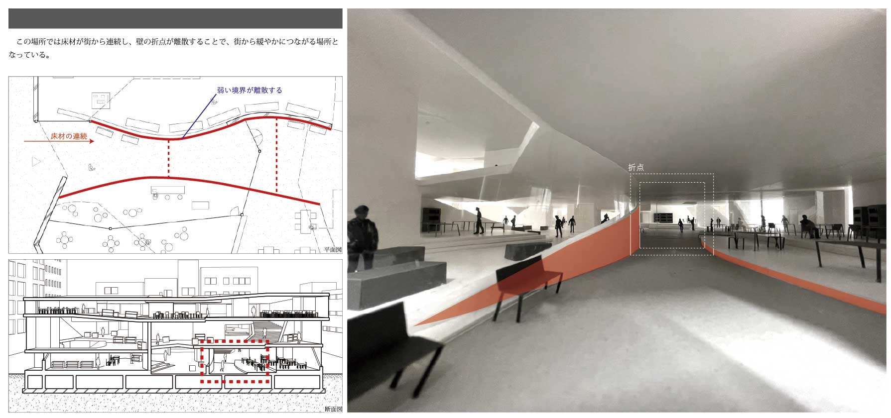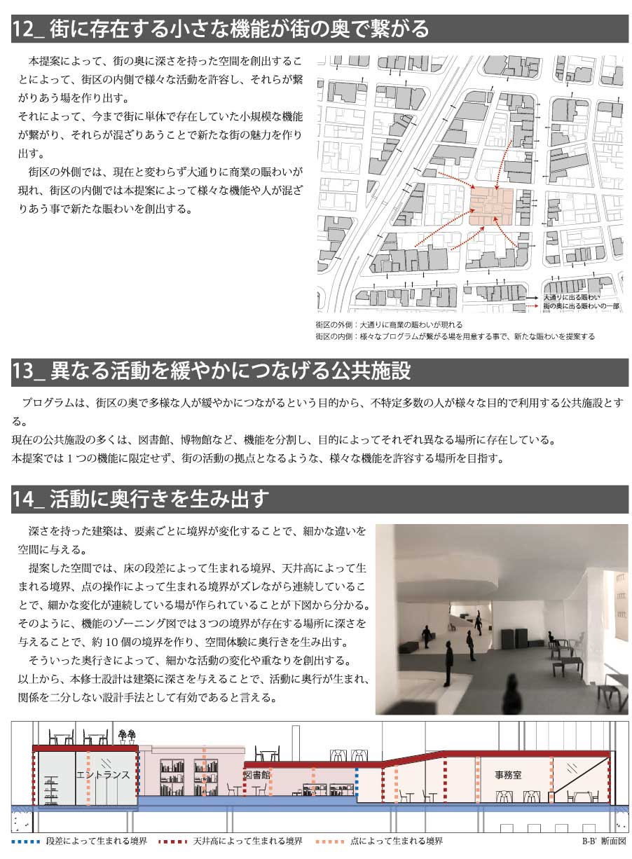 本設計では、街区の内側にあった生活の繋がりを生み出すポテンシャルに注目し、大通りに面している機能の一部を「深さを持った建築」によって緩やかに繋げた公共施設を提案した。それによって、様々な機能を許容し、関係しあう、街の拠点となるような場所を目指した。