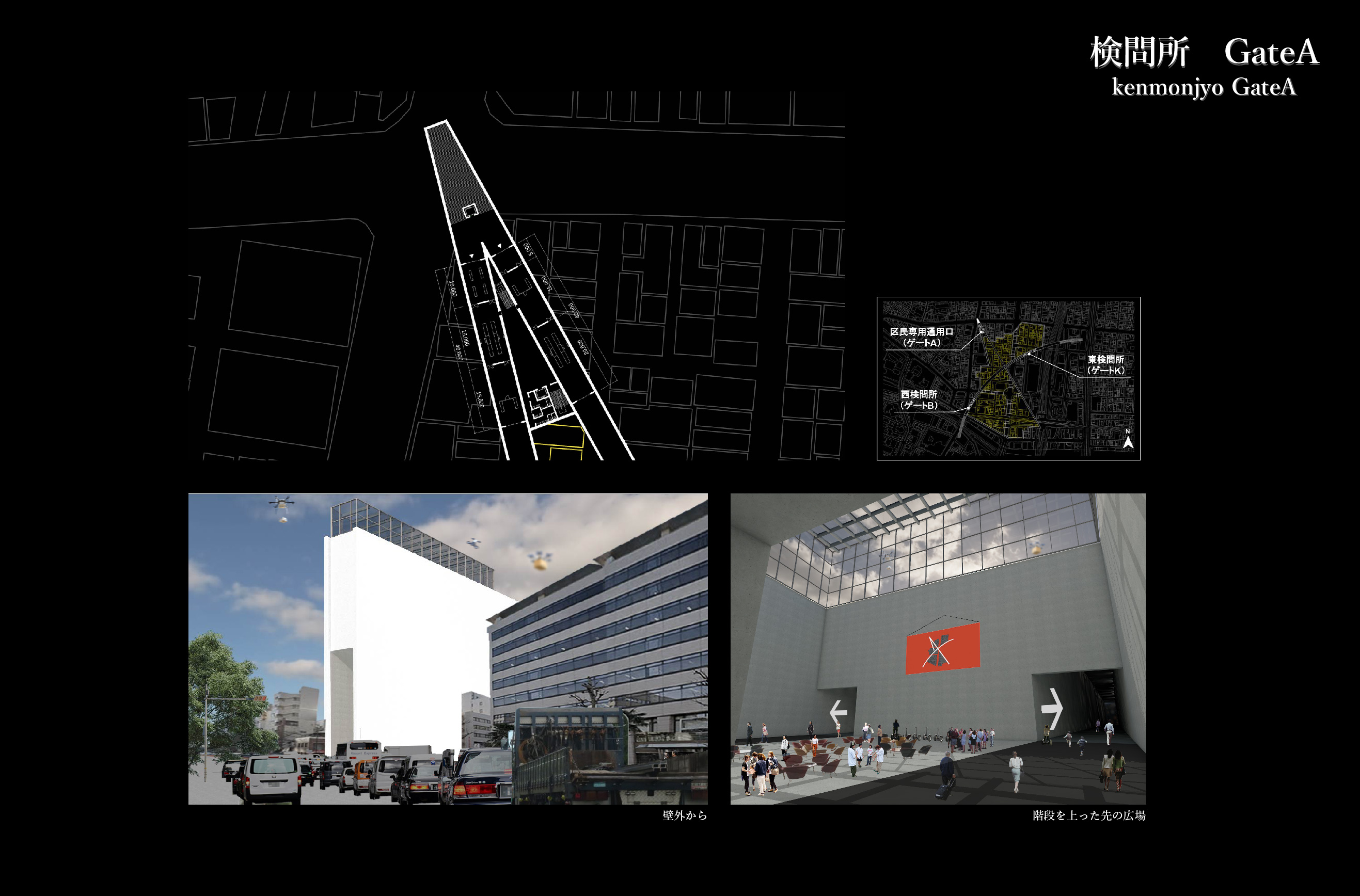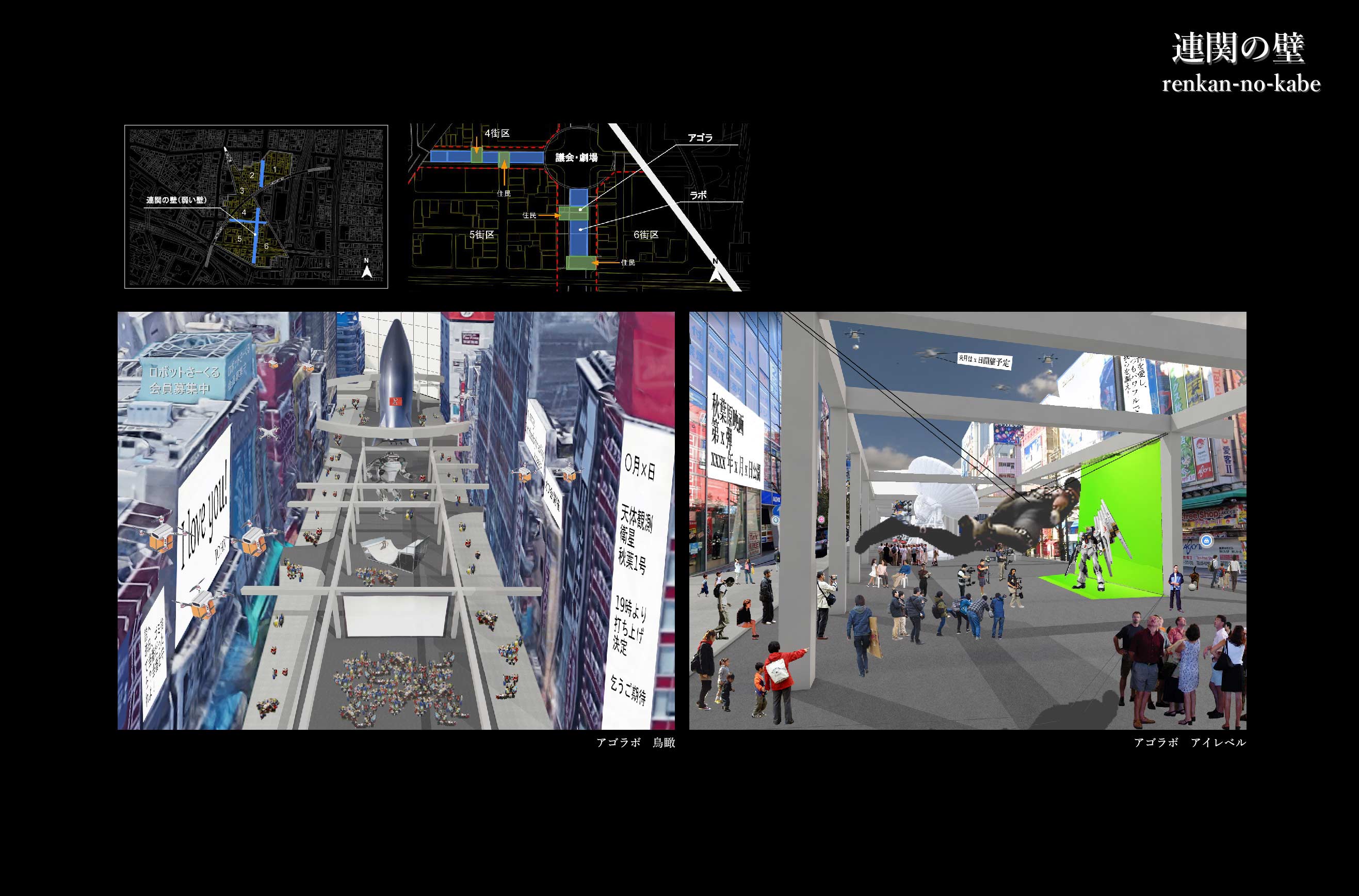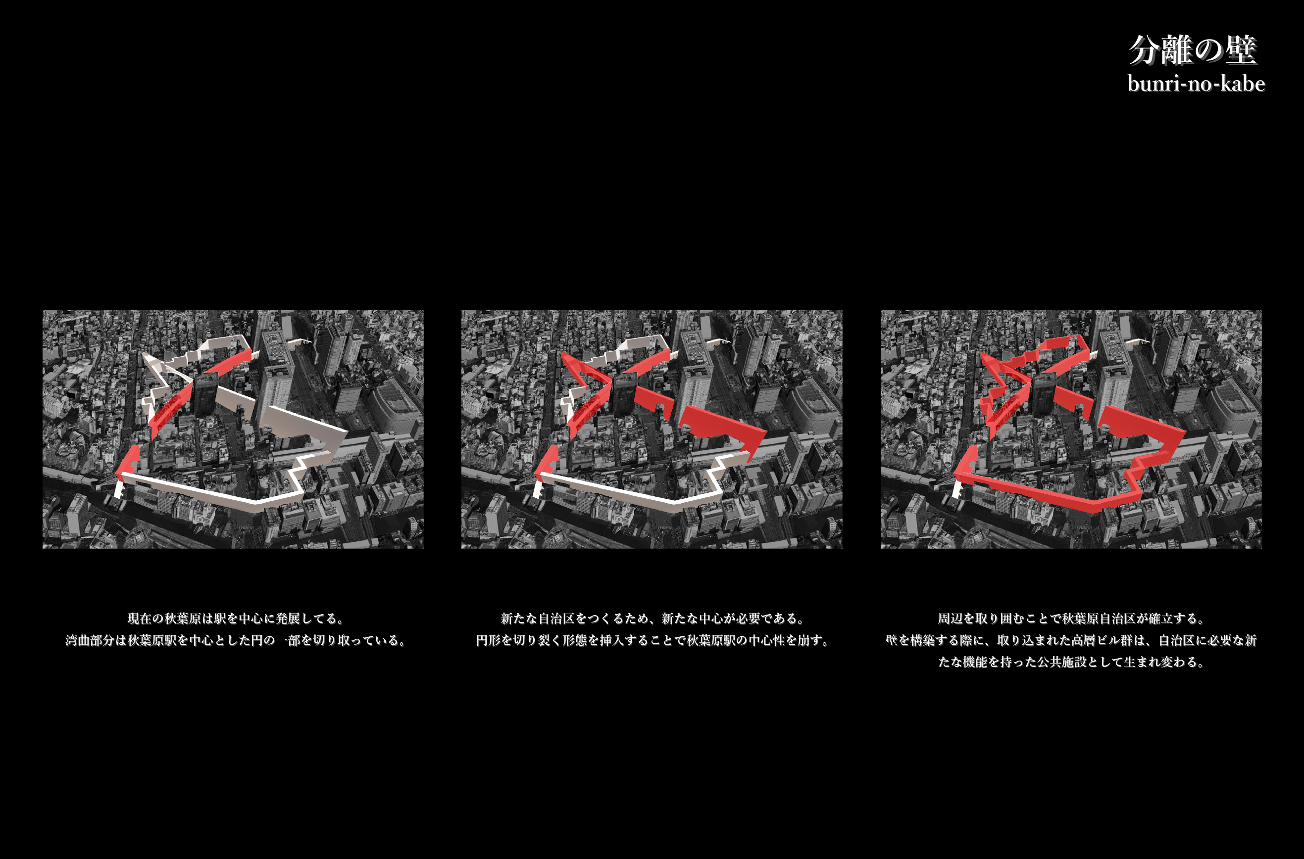 その際、壁という要素に注目して2種類の壁を作った。1つは、日本と秋葉原を分ける“分離の壁”、もう一つは、壁内エリア(オタクのジャンル)を仕切ると同時に互いに影響を及ぼし合う“連関の壁”である。この2つの壁で自治区を形成する。壁内に入るには検問所を通り、そこで自治区内のルールである12カ条の宣言をする必要がある。また、分離の壁は再開発によって建設された高層ビルを貫き、議会、教育・研究機関、病院、墓地に変化させる。さらに、壁の構造はラーメン構造で、壁内の空間は移動のための道路、避難所、設備系統になっている。壁は区切るだけでなく、自治区の生活も支えるだろう。