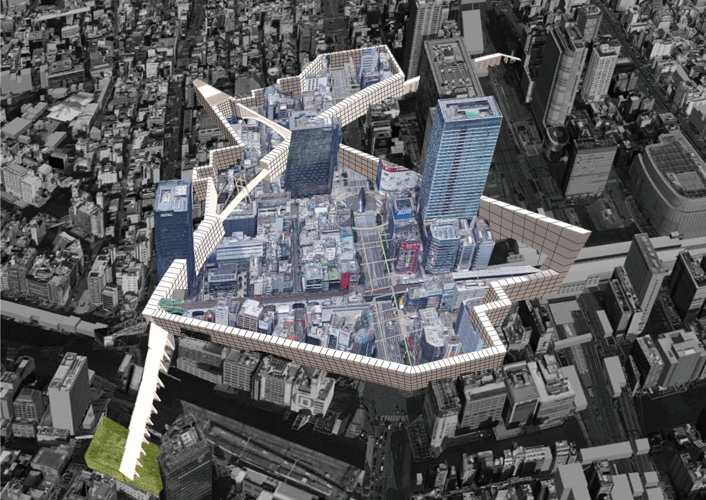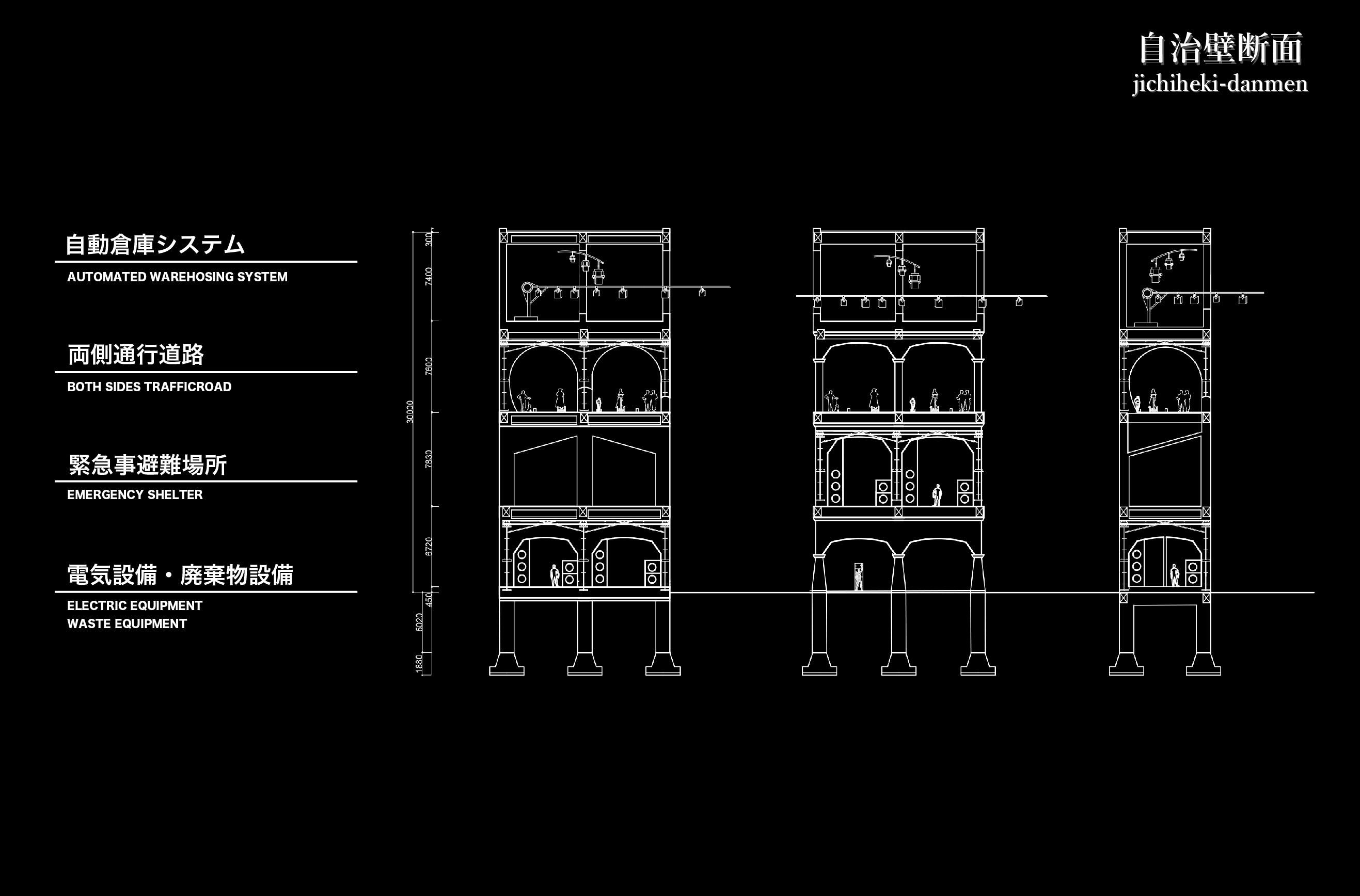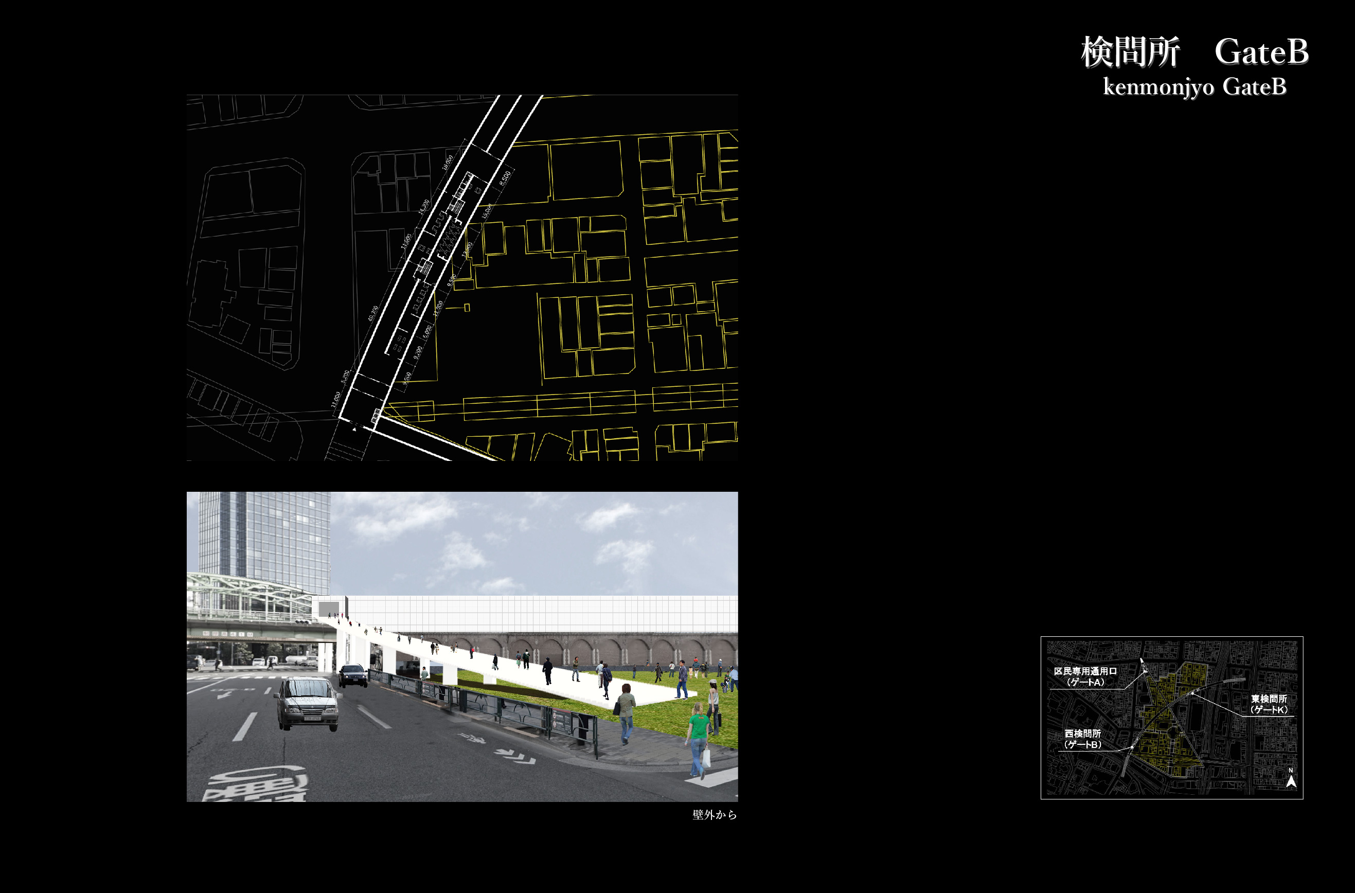 その際、壁という要素に注目して2種類の壁を作った。1つは、日本と秋葉原を分ける“分離の壁”、もう一つは、壁内エリア(オタクのジャンル)を仕切ると同時に互いに影響を及ぼし合う“連関の壁”である。この2つの壁で自治区を形成する。壁内に入るには検問所を通り、そこで自治区内のルールである12カ条の宣言をする必要がある。また、分離の壁は再開発によって建設された高層ビルを貫き、議会、教育・研究機関、病院、墓地に変化させる。さらに、壁の構造はラーメン構造で、壁内の空間は移動のための道路、避難所、設備系統になっている。壁は区切るだけでなく、自治区の生活も支えるだろう。