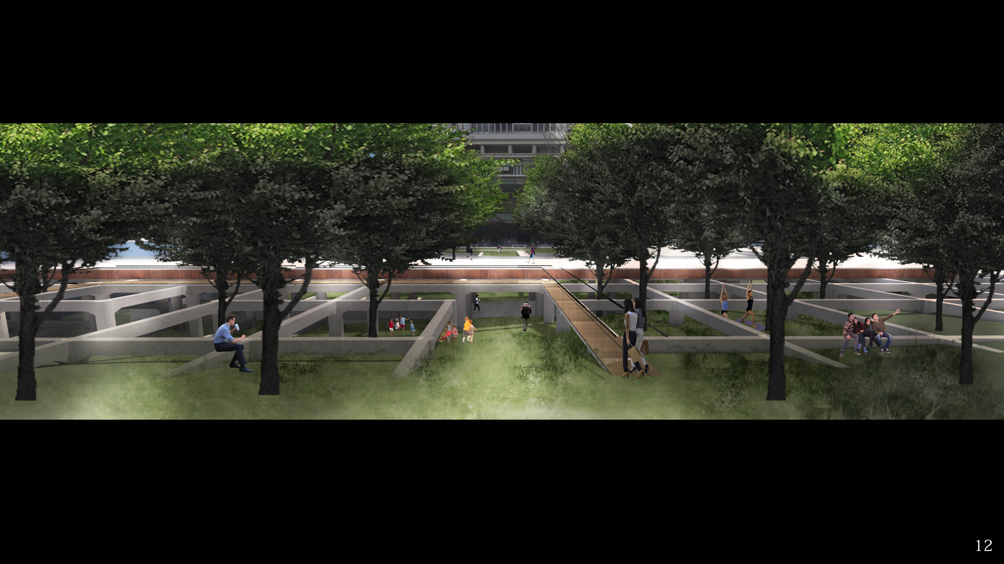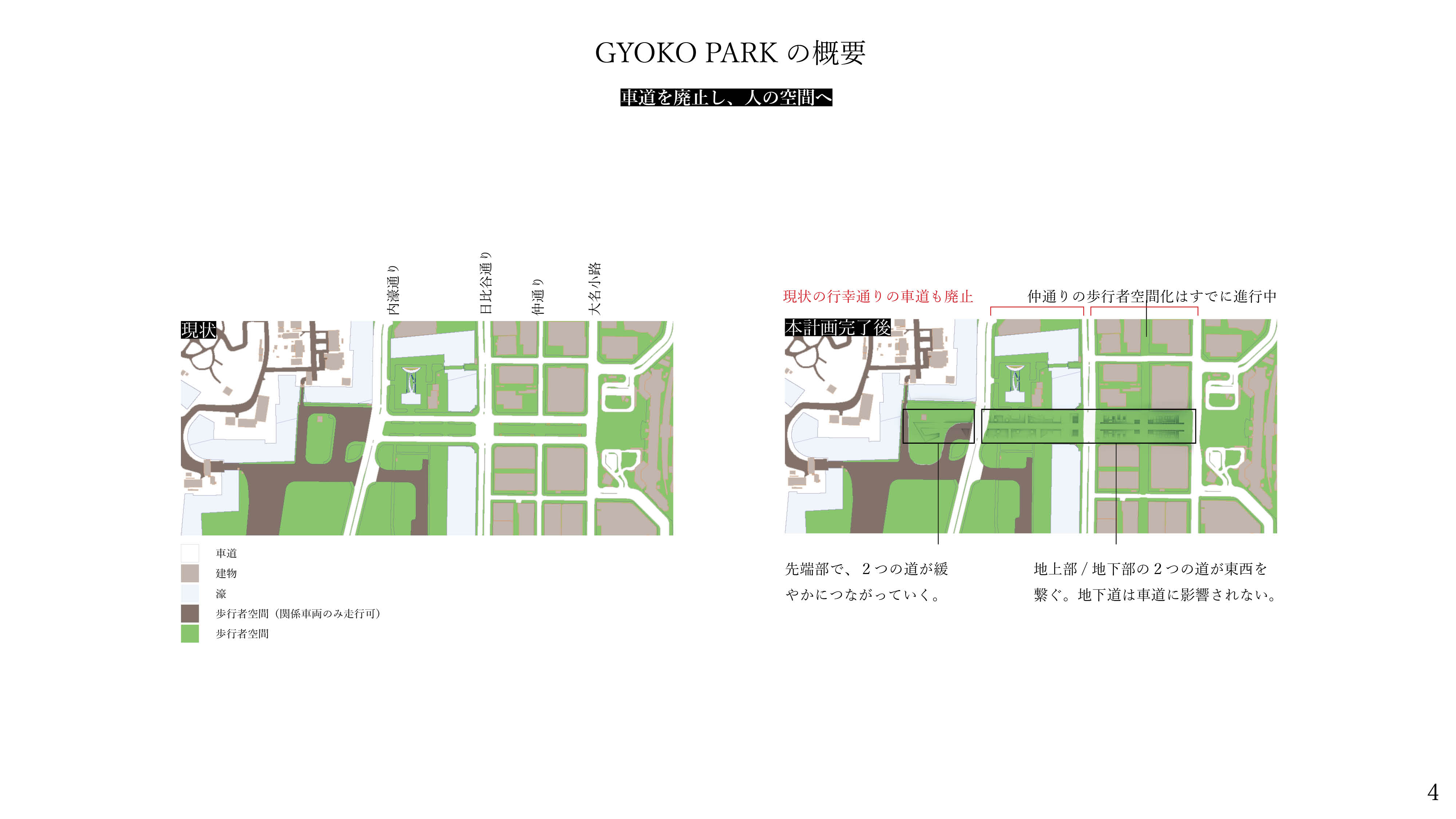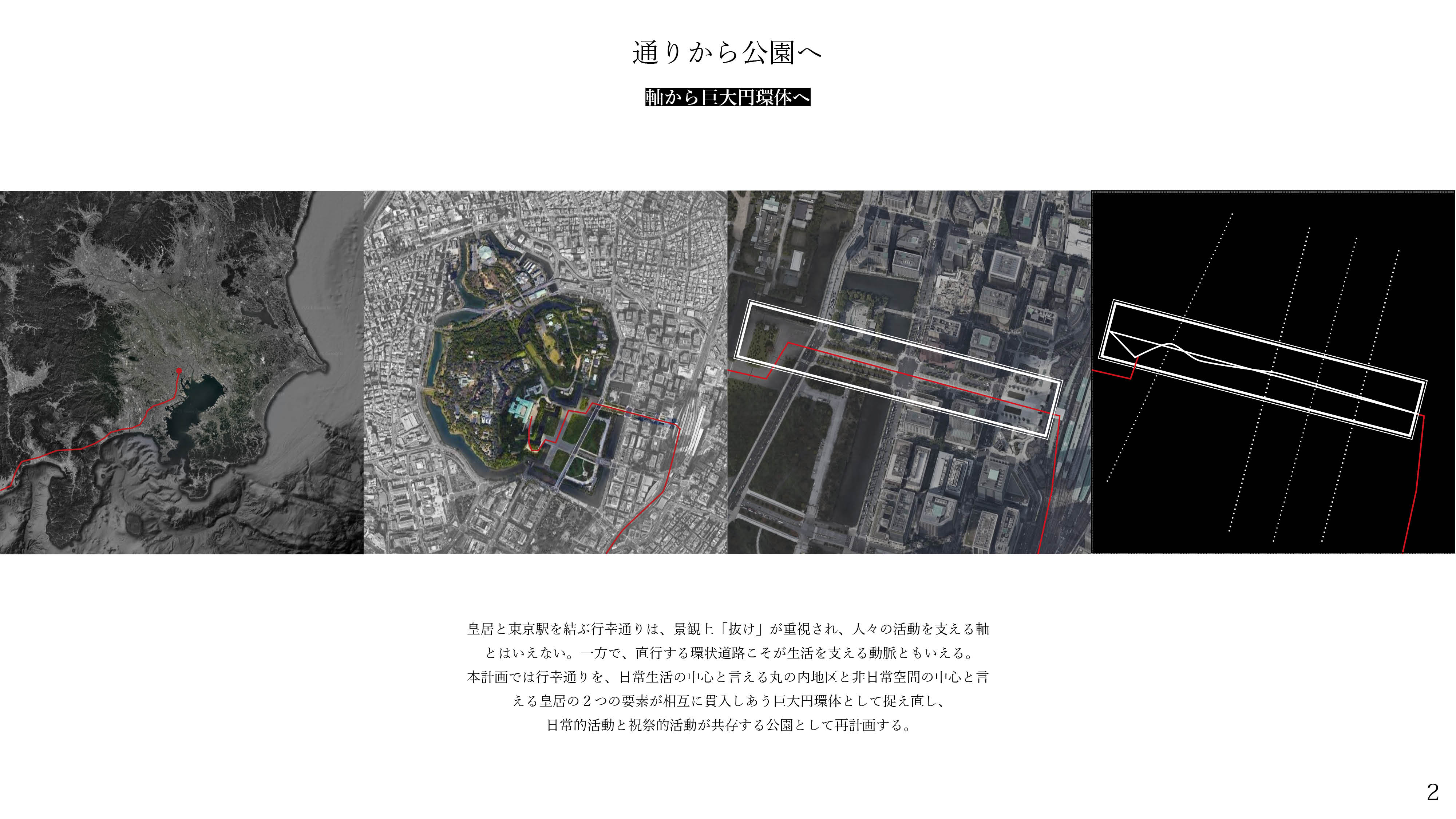 本計画では、行幸通りを、日常的活動の中心と言える丸の内地区と祝祭的活動の中心と言える皇居の2つの要素が相互に貫入しあう巨大円環体として捉え直し、異なる2種の活動が共存する公園「GYOKO PARK」として再計画する。言い換えれば、日常的活動を許容しうる都市の中のモニュメントをつくる試みである。丸の内地区の開発の歴史を踏まえ、地下に眠るグリッド状の構造体に新しい曲面を挿入する形で、2つの大きな言語の相互補完により紡がれる小さな空間から構成される空間を計画した。中心の行幸路で祝祭的活動が行われているさなか、その下をくぐり抜けるような曲面体では子どもが遊ぶ姿が同時に見られるかもしれない。