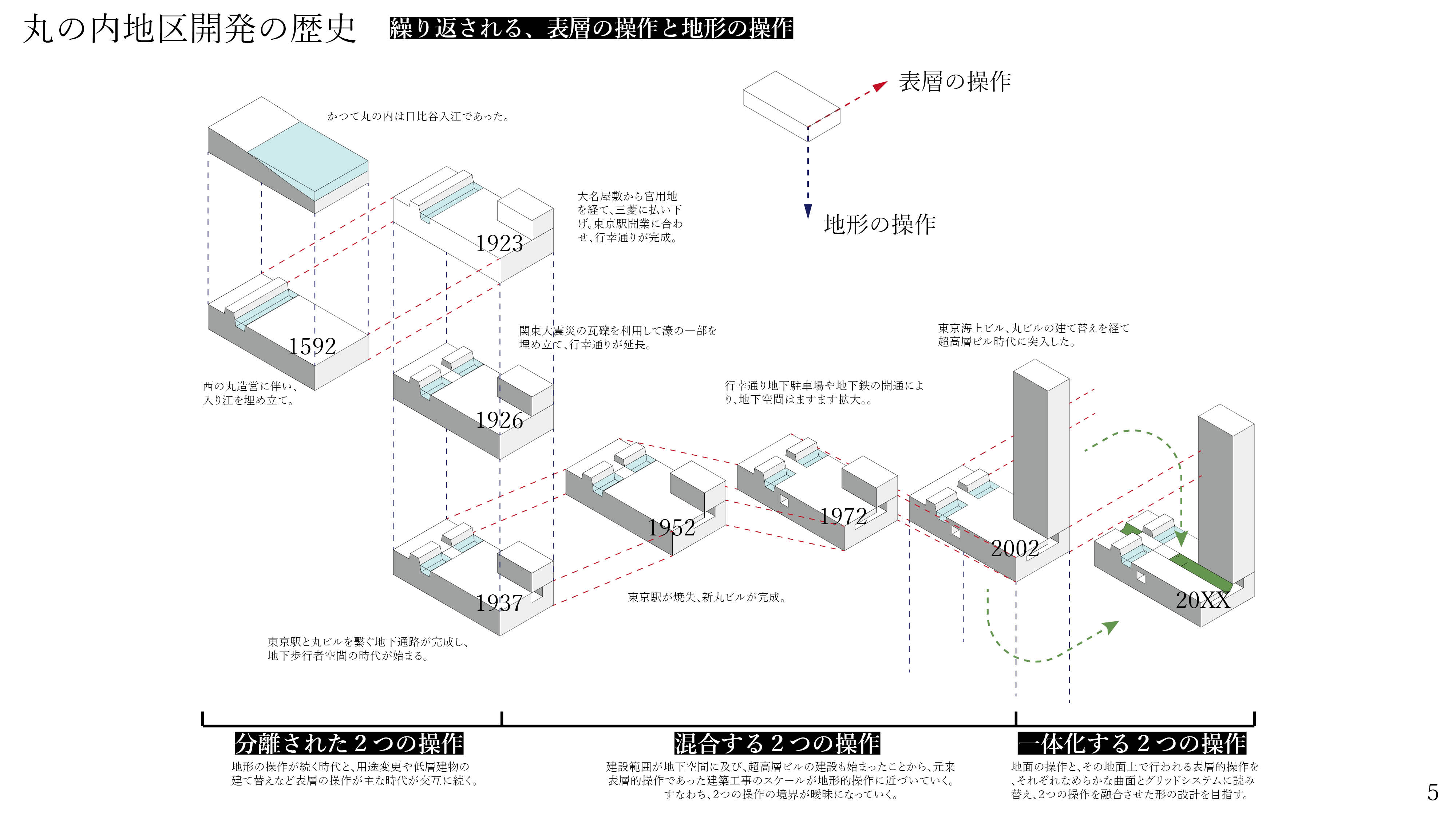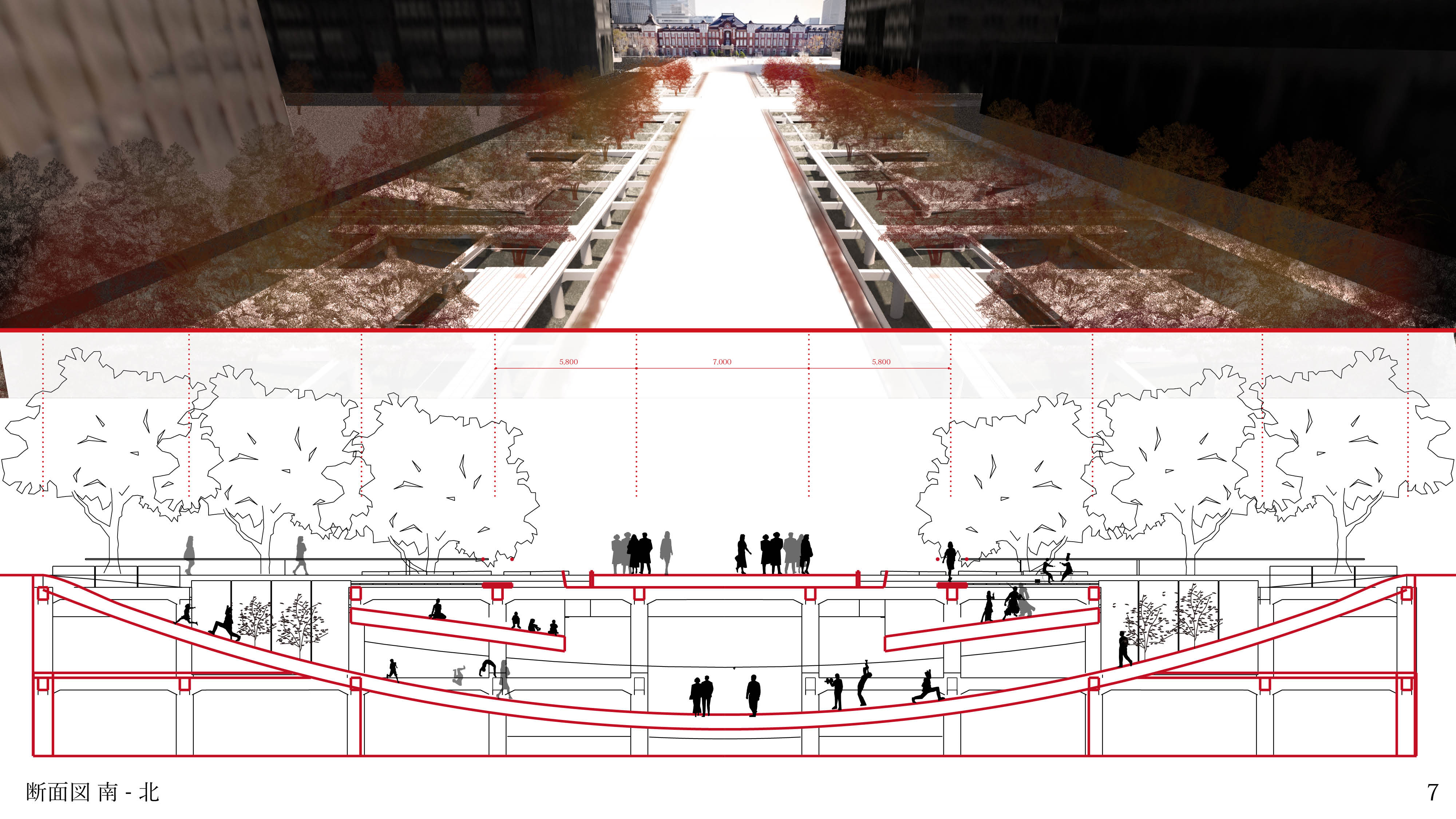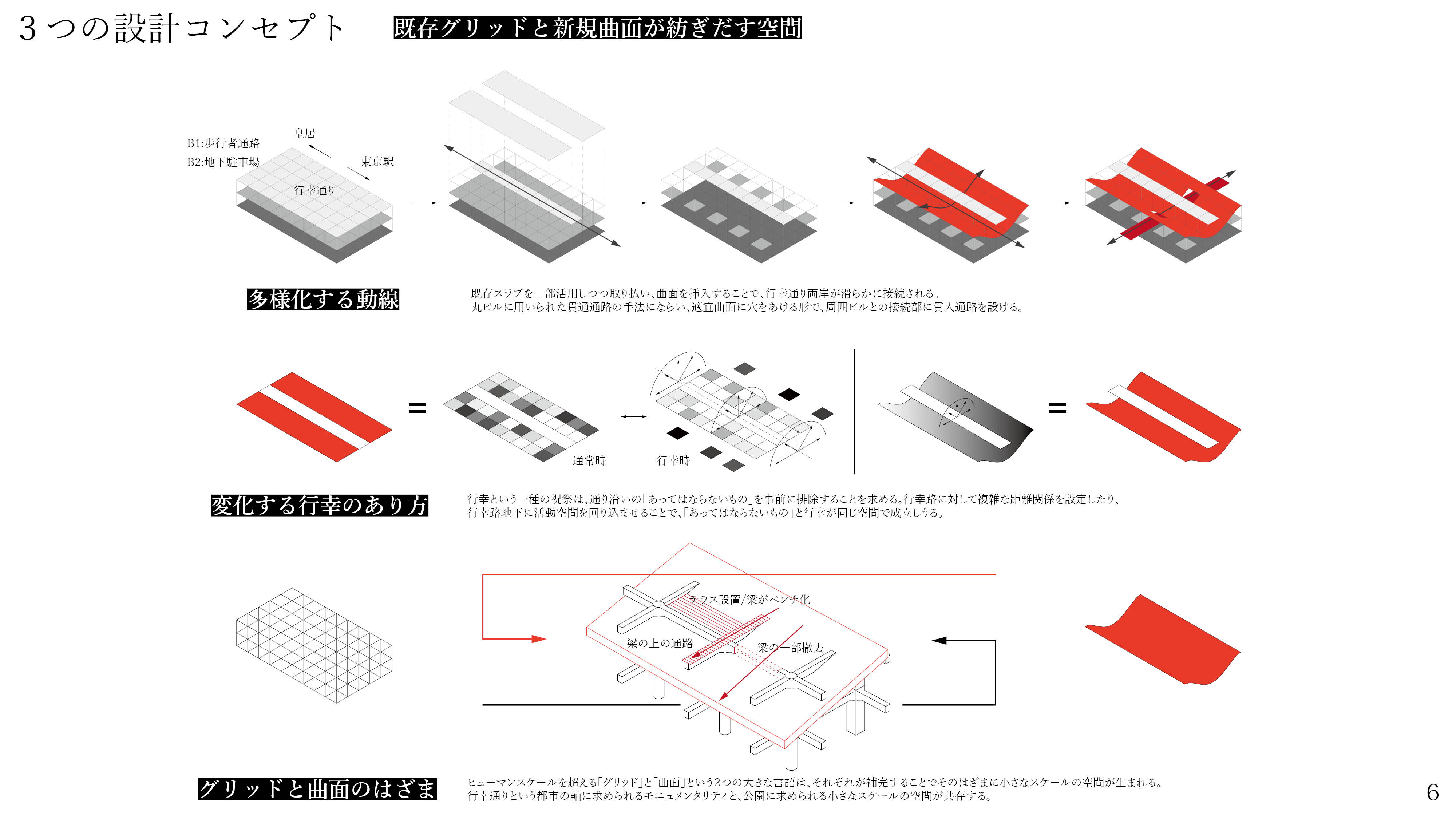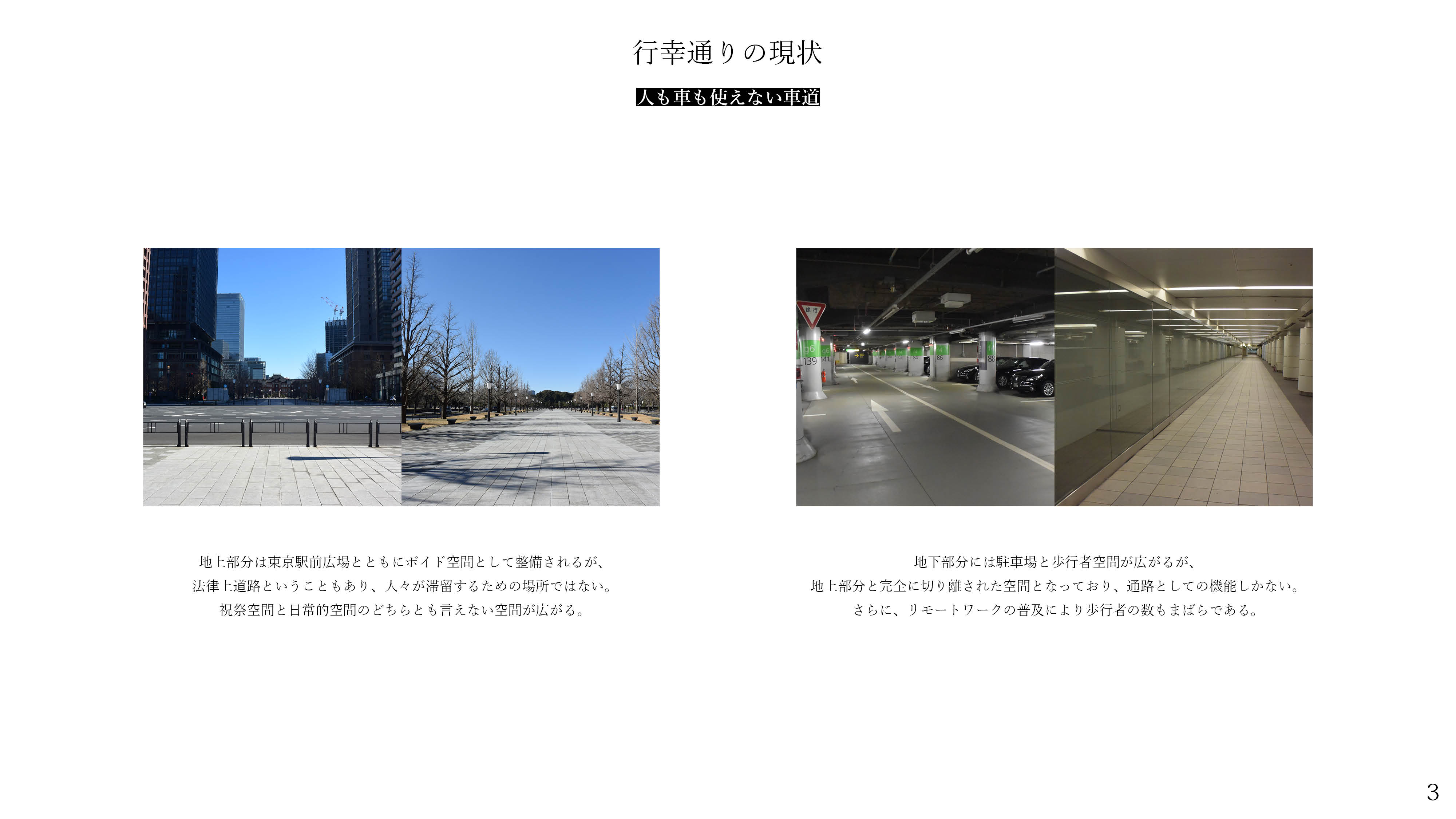 1923年に完成して以降、東京駅と皇居という、東京を代表する2つのモニュメントを繋ぐ都市の軸として機能してきた行幸通りは、都市の中にあって「なにもない」空間を残す貴重な空間である。しかし、祝祭的活動を行うために設けられたその広大な道路は、周囲の開発によって構築された地上/地下ネットワークの接続を分断してしまうなど、このエリアの日常的活動に対して上手く機能していない。
