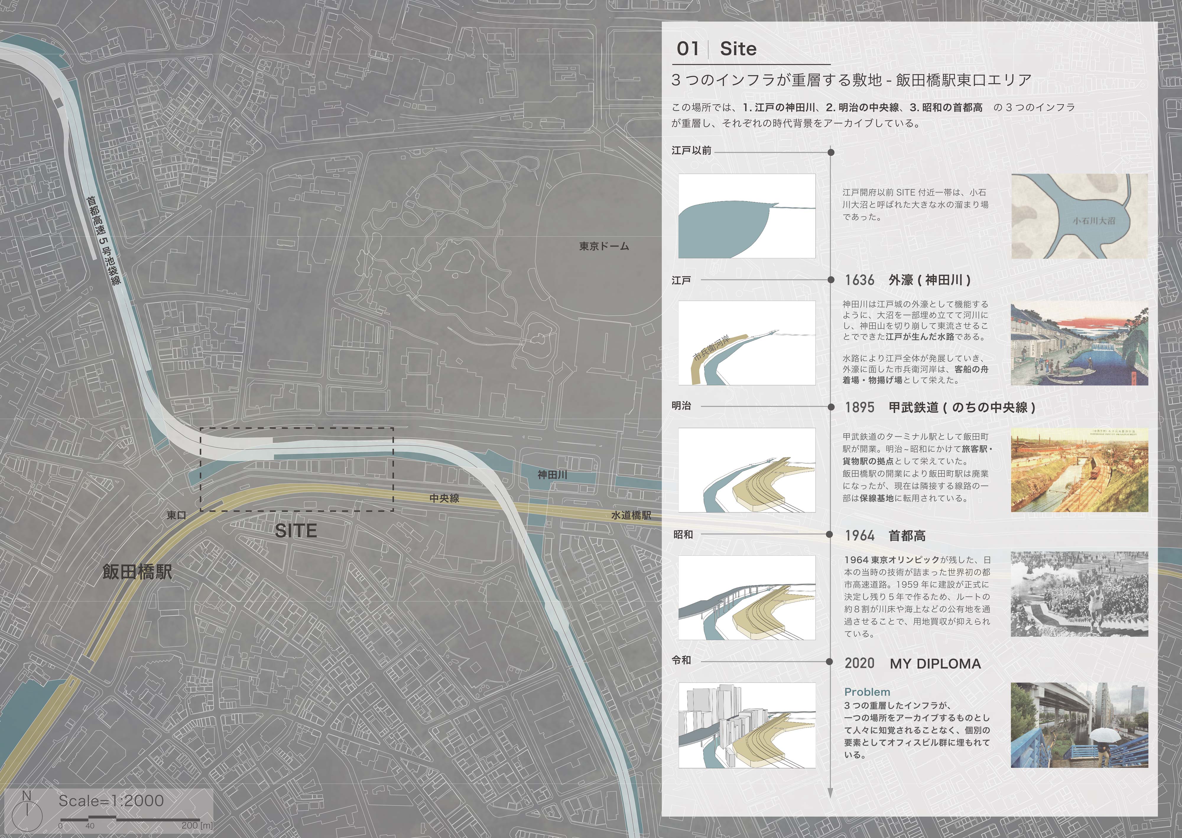 敷地は飯田橋駅東口すぐそばの13棟のオフィスビル群である。この場所は、小石川大沼であったところに江戸時代に神田川を作り、隅田川から登ってくる船の終着点として栄え、その後明治時代には飯田町駅が旅客駅として栄えた甲武鉄道(現在の中央線)、昭和時代には東京オリンピックに向けて作られた首都高が通るなどと、3つのインフラが重層し、飯田橋の記憶をアーカイブしている。しかし現在は中層のオフィスビル群が密に並び、その地層に気づく機会はなく、ただの暗い高架下空間となってしまっている。