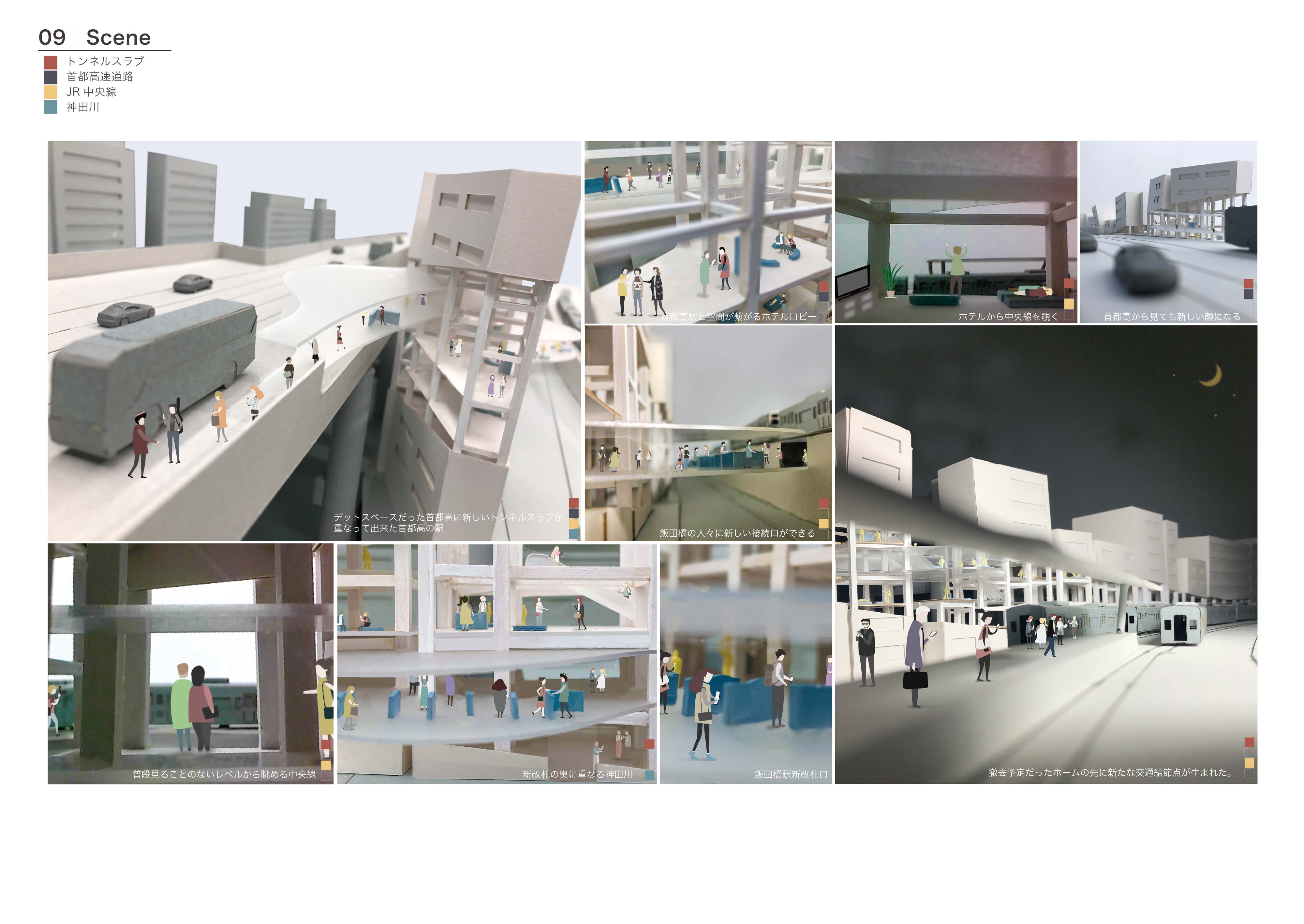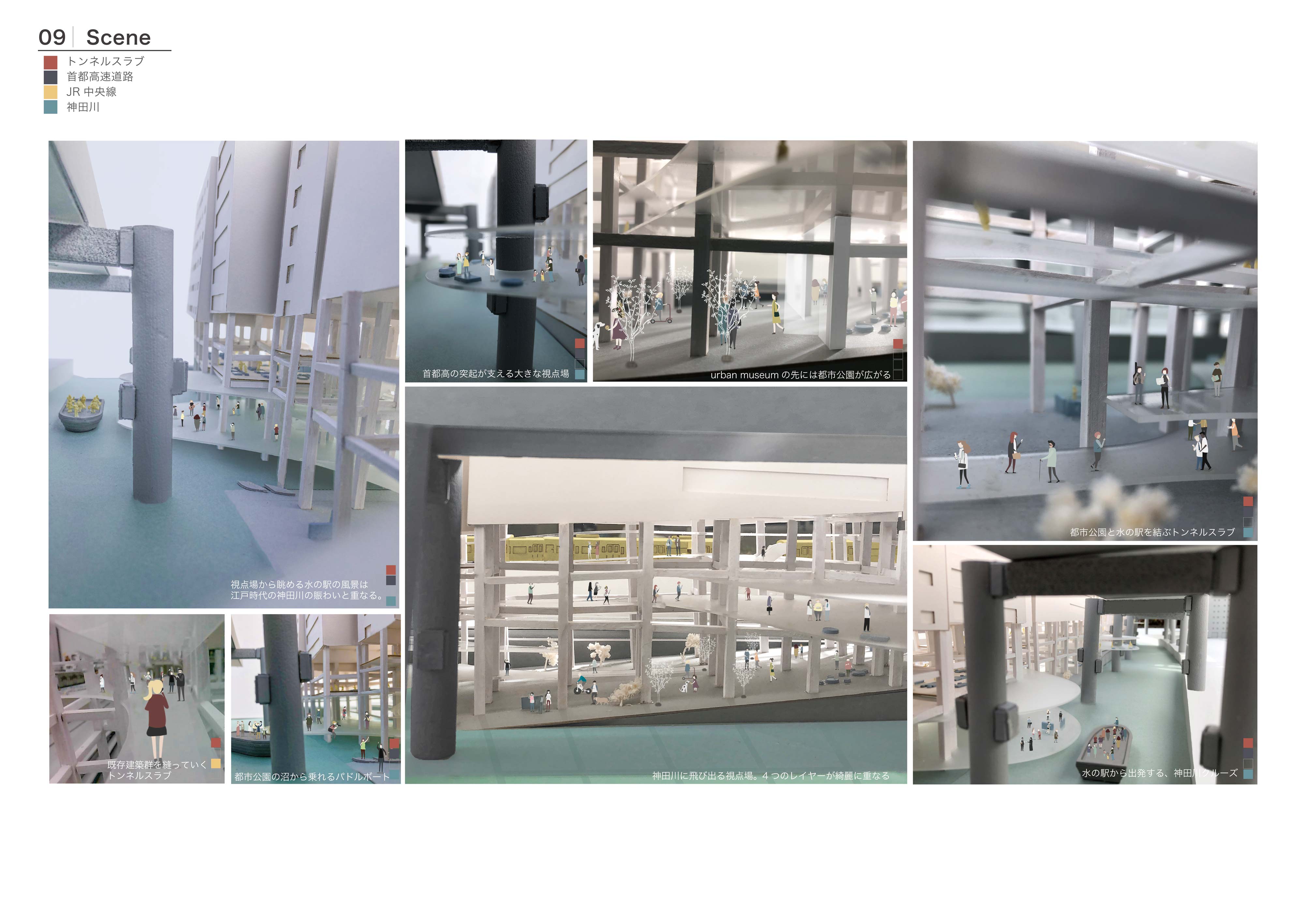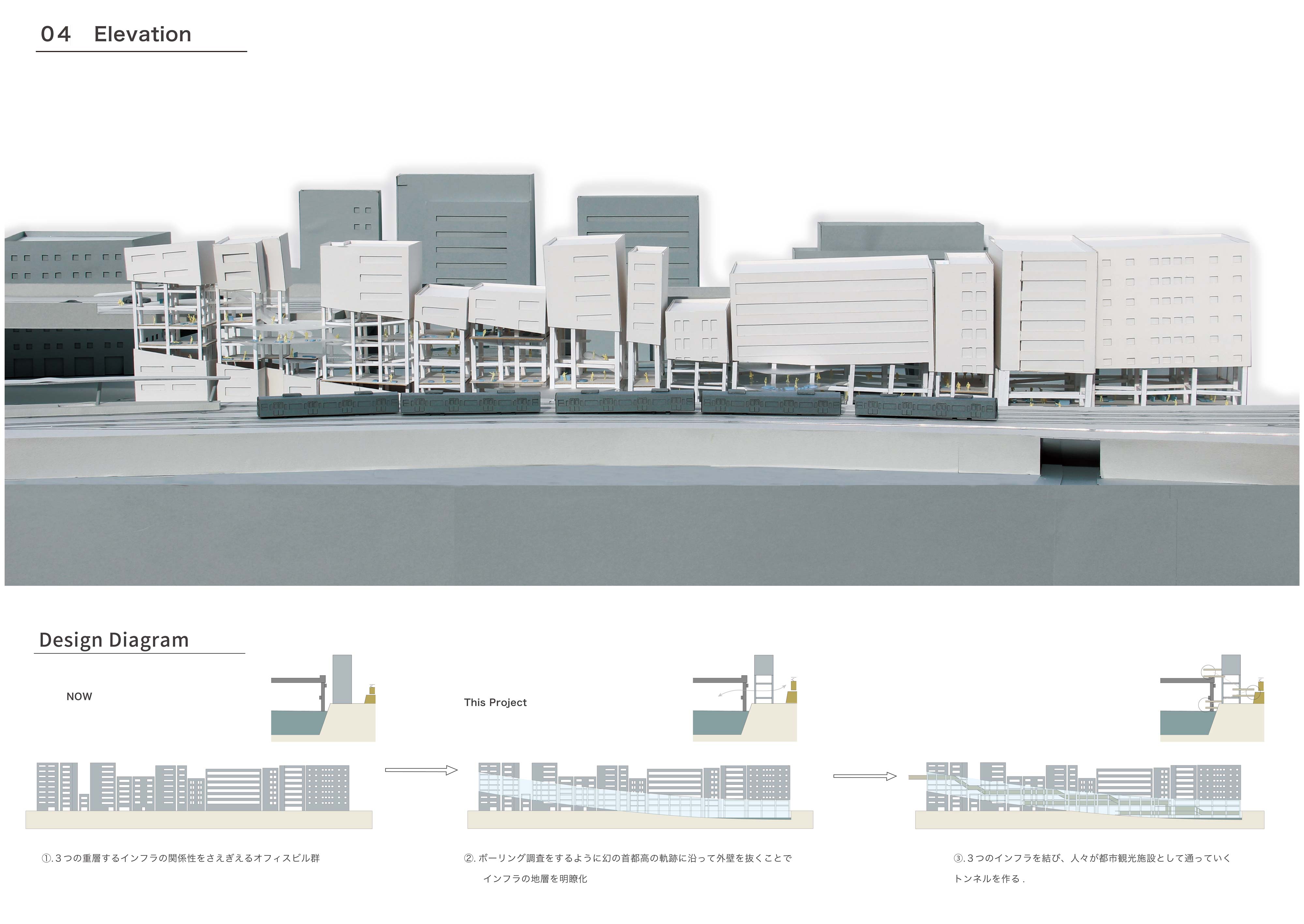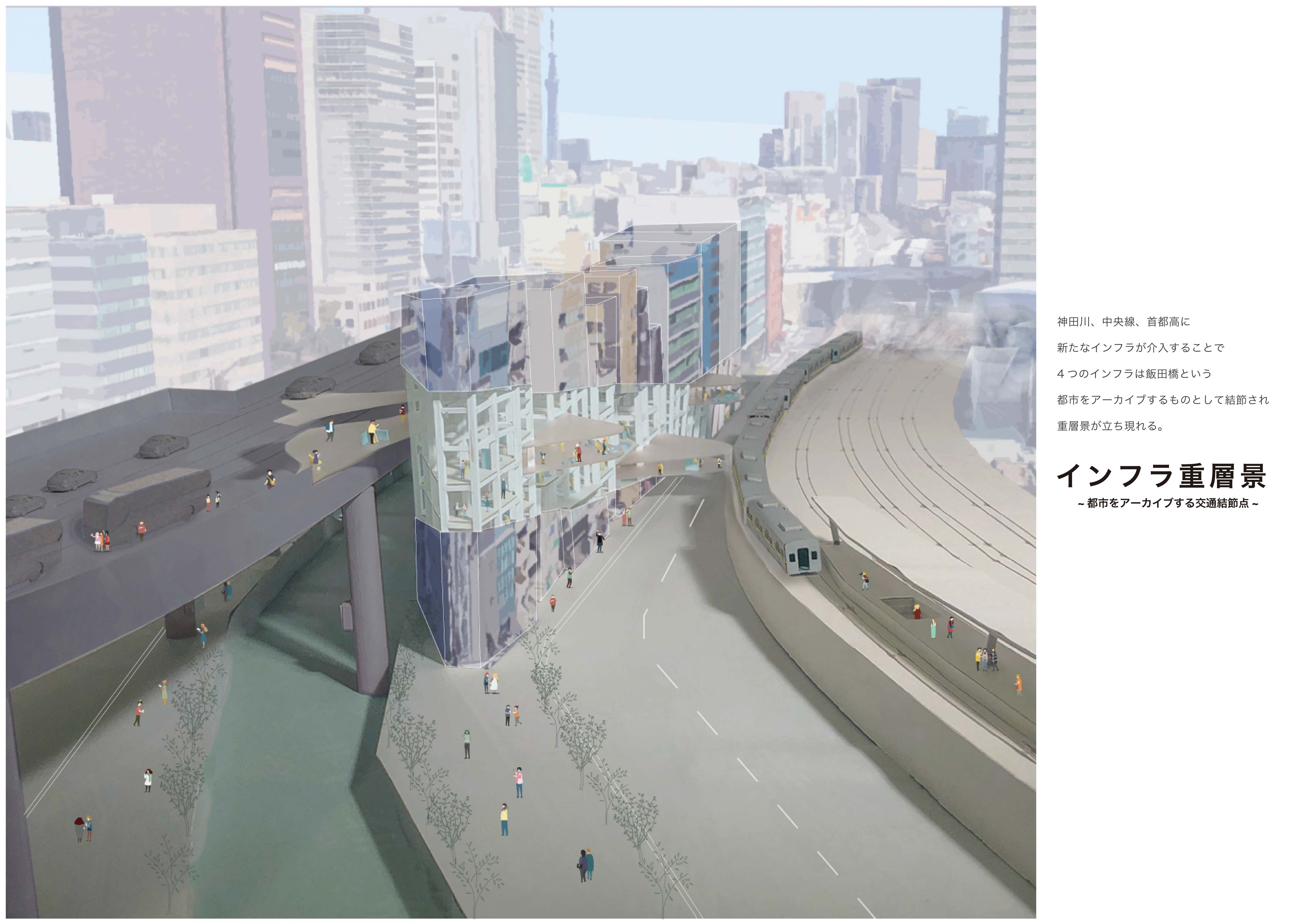 交通インフラが重なる風景はまるで都市の地層のようで、都市をアーカイブする力があると考える。しかし現実は、その景観に嫌悪感を抱く人が多いのが事実である。本提案では、交通インフラの持つ都市のアーカイブ性を建築により顕在化することを目的としている。