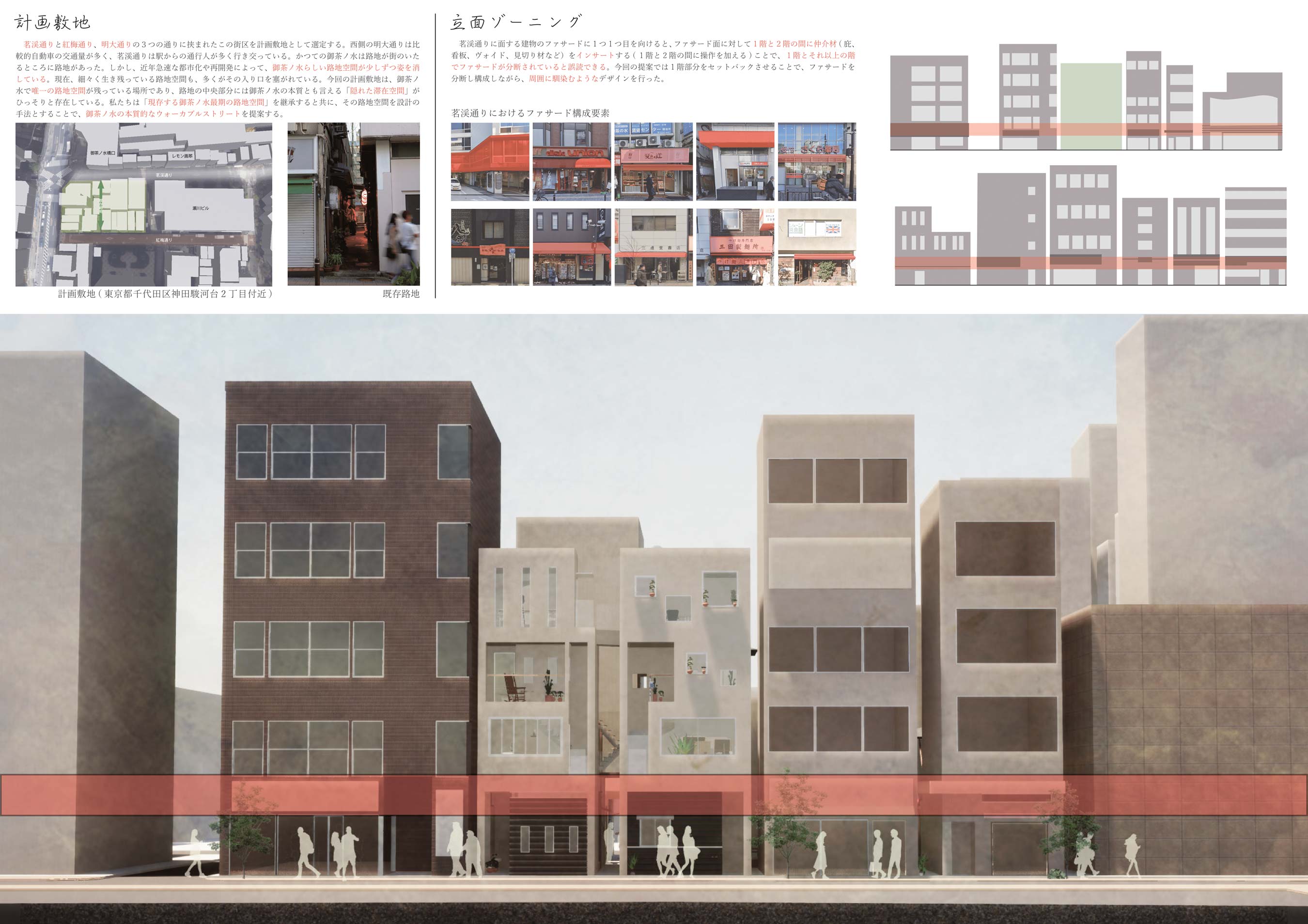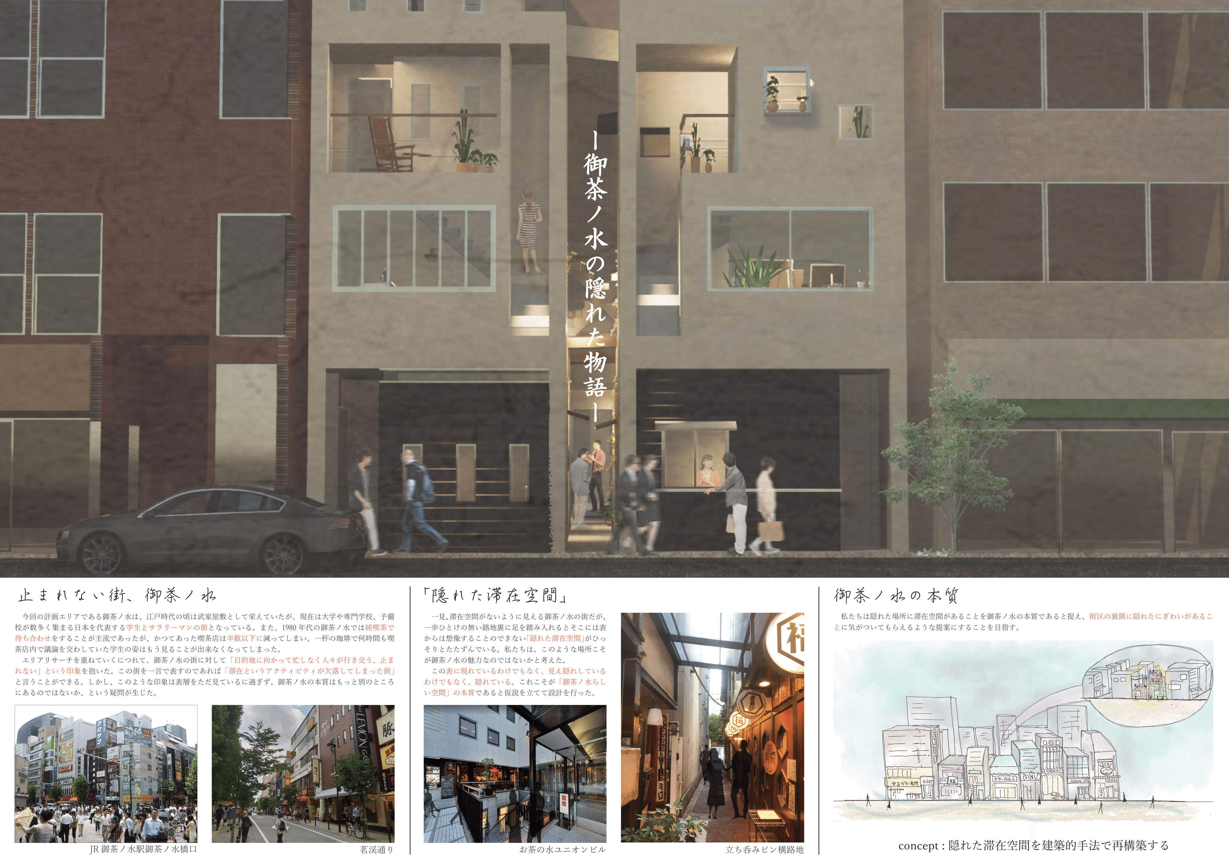 私たちはこの「隠れた滞在空間」を御茶ノ水の本質であると考え、これを建築手法に落とし込むことで、御茶ノ水らしいウォーカブルストリートのあり方を提案できるのではないかと仮定した。