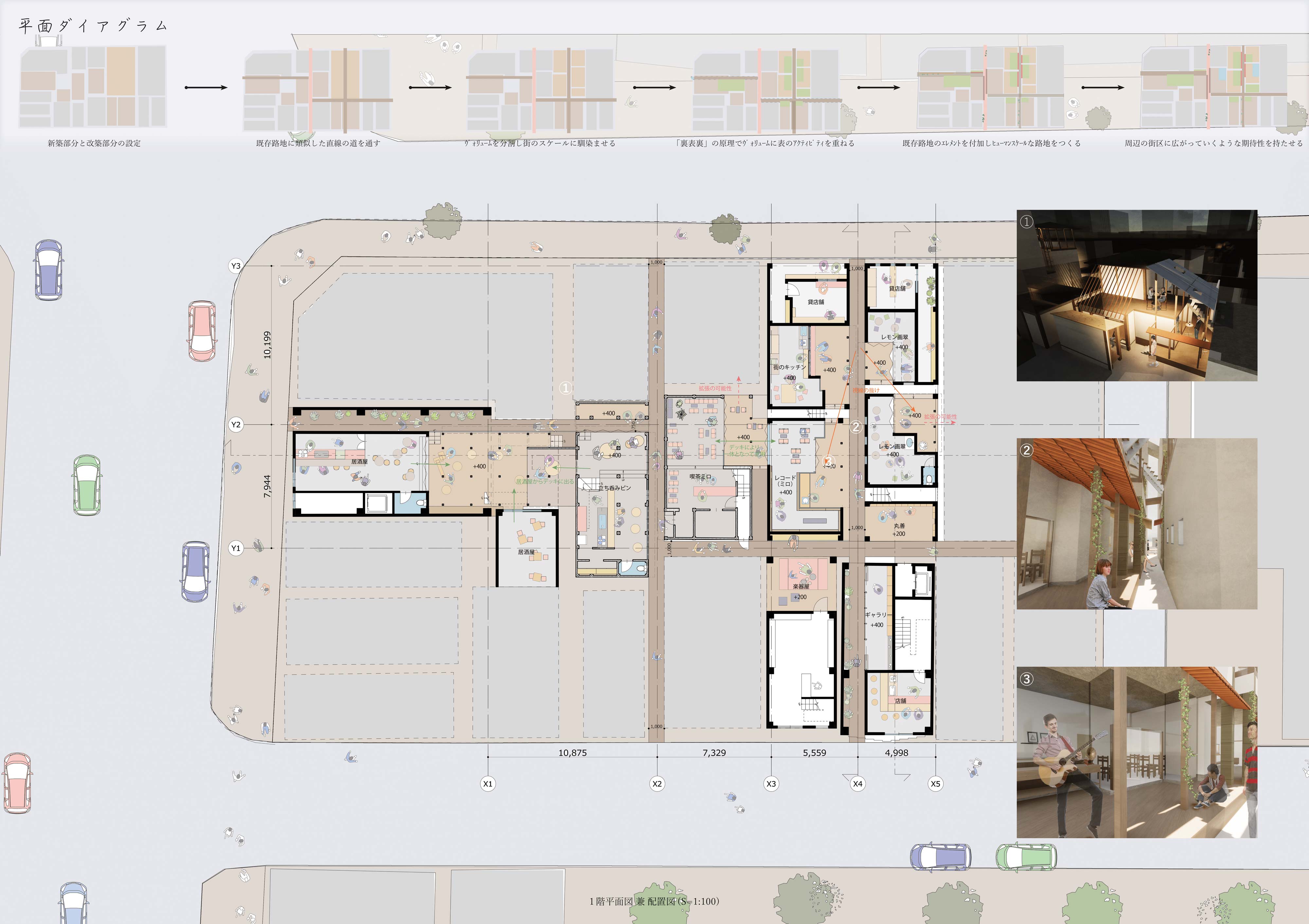そのような路地空間を茗渓通り、紅梅通り、明大通りの3つの通りに囲まれた街区の中で発見し、この場所を計画敷地として選定した。