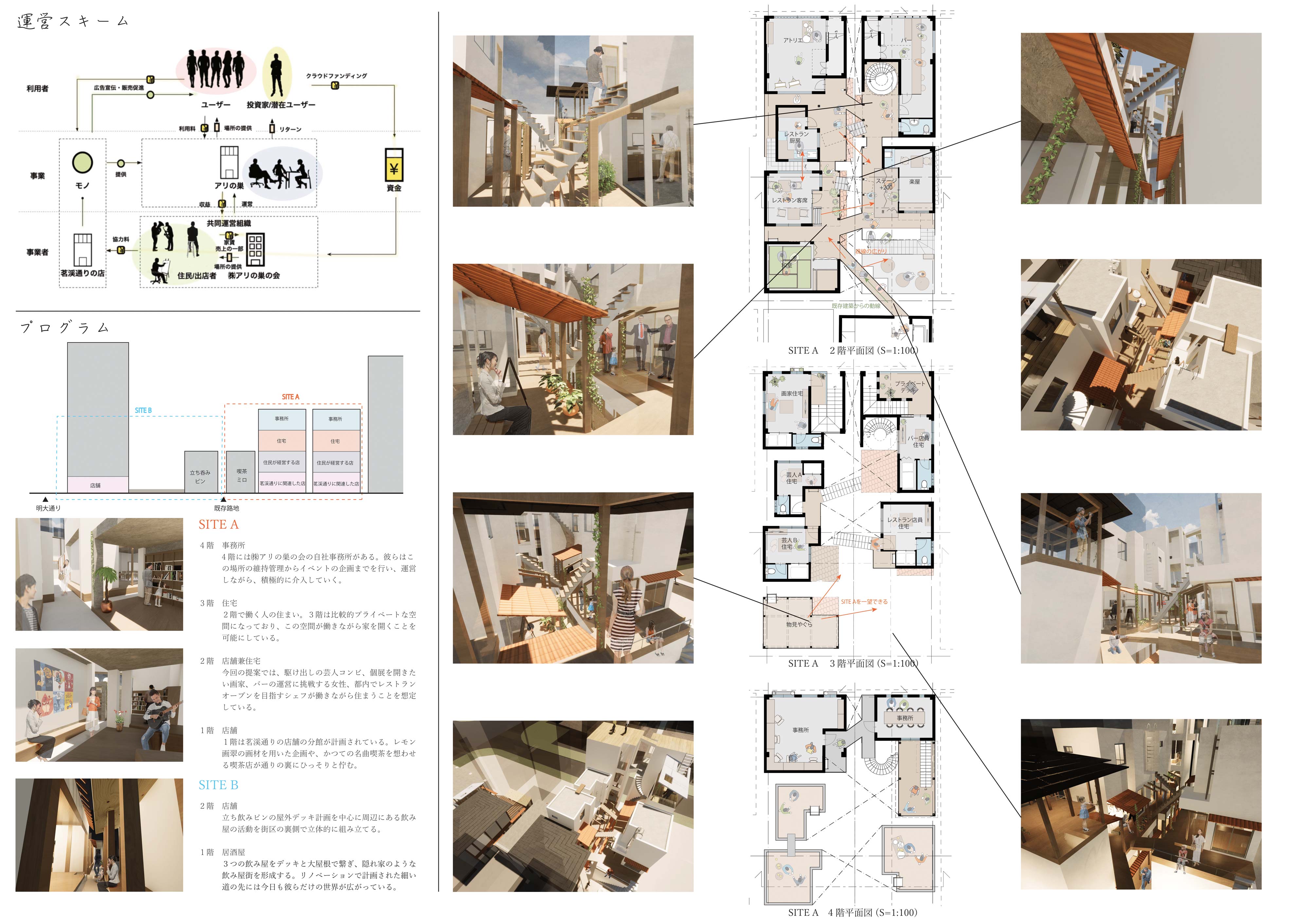 新築とリノベーションを織り交ぜながら、表の茗渓通りからは想像もつかないような空間が街区の中心部にひっそりとたたずんでいるような建築を提案していく。