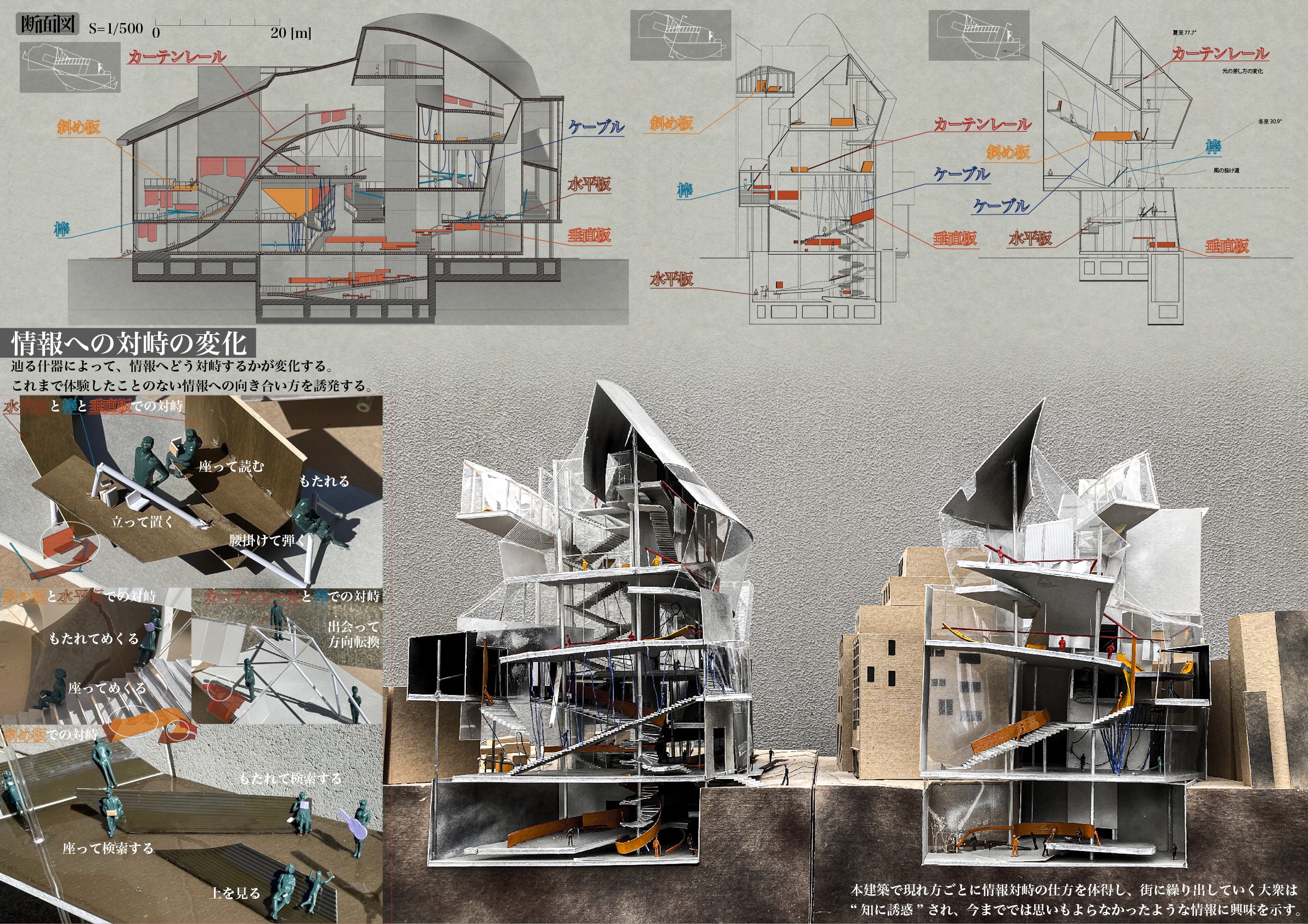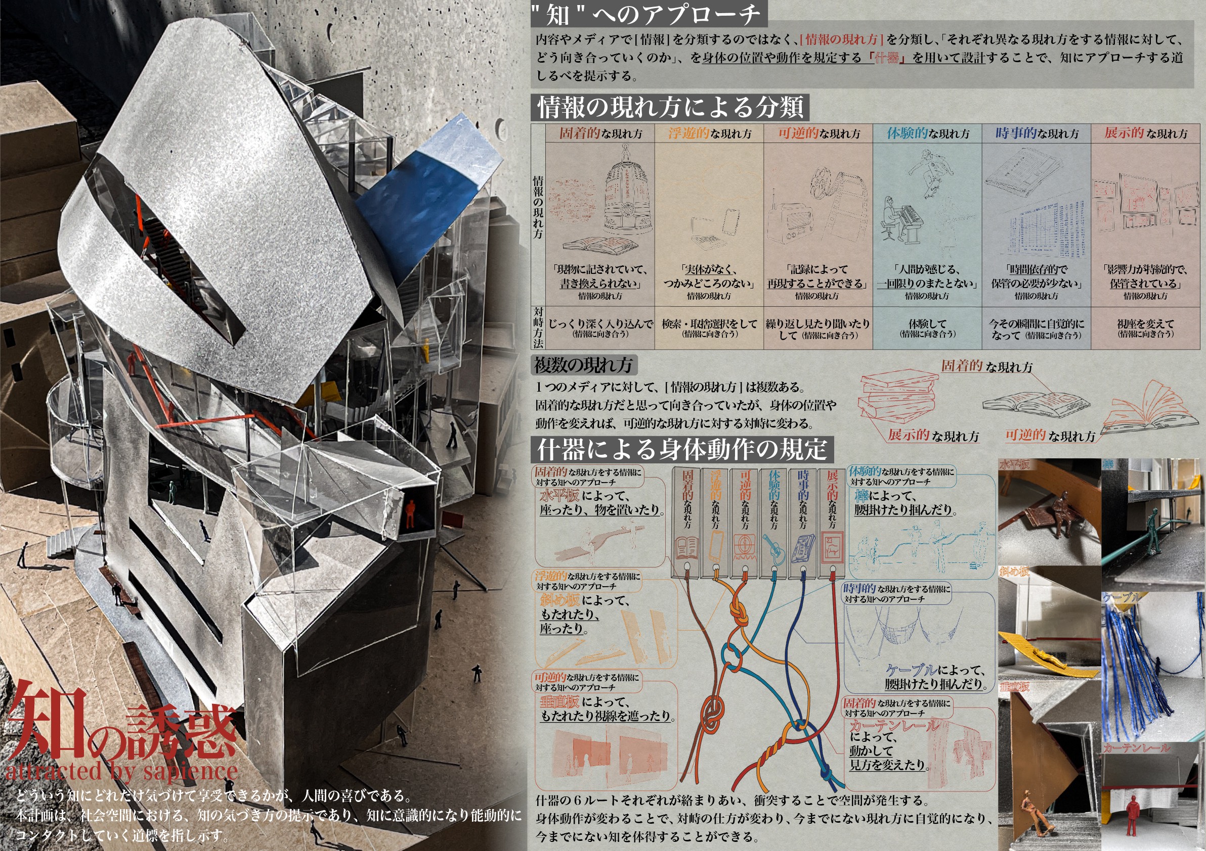 私たちは、眼前に現れる情報に対峙したとき、そこに潜む知に気付き魅了され、のめりこんでいくことがある。しかし、気付くか気付かないか、享受できるかできないかはその人自身に委ねられているのが現状だ。そこで本計画では、社会空間における、「知の気付き方」を、知の集積地である神田神保町にて、提示する。すなわち、情報から知を享受するための無数の入り口を指し示し、知に潜む引力を、最大化するのだ。