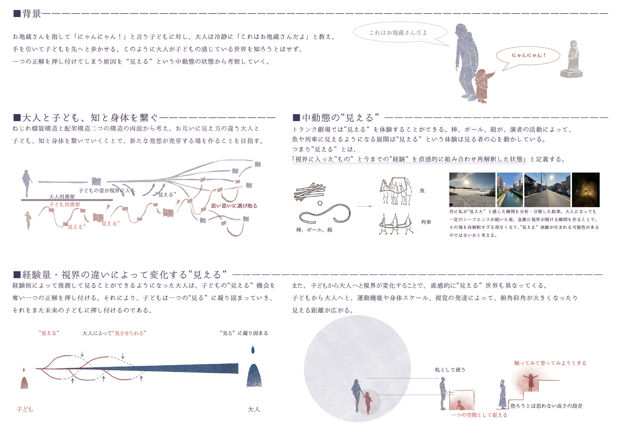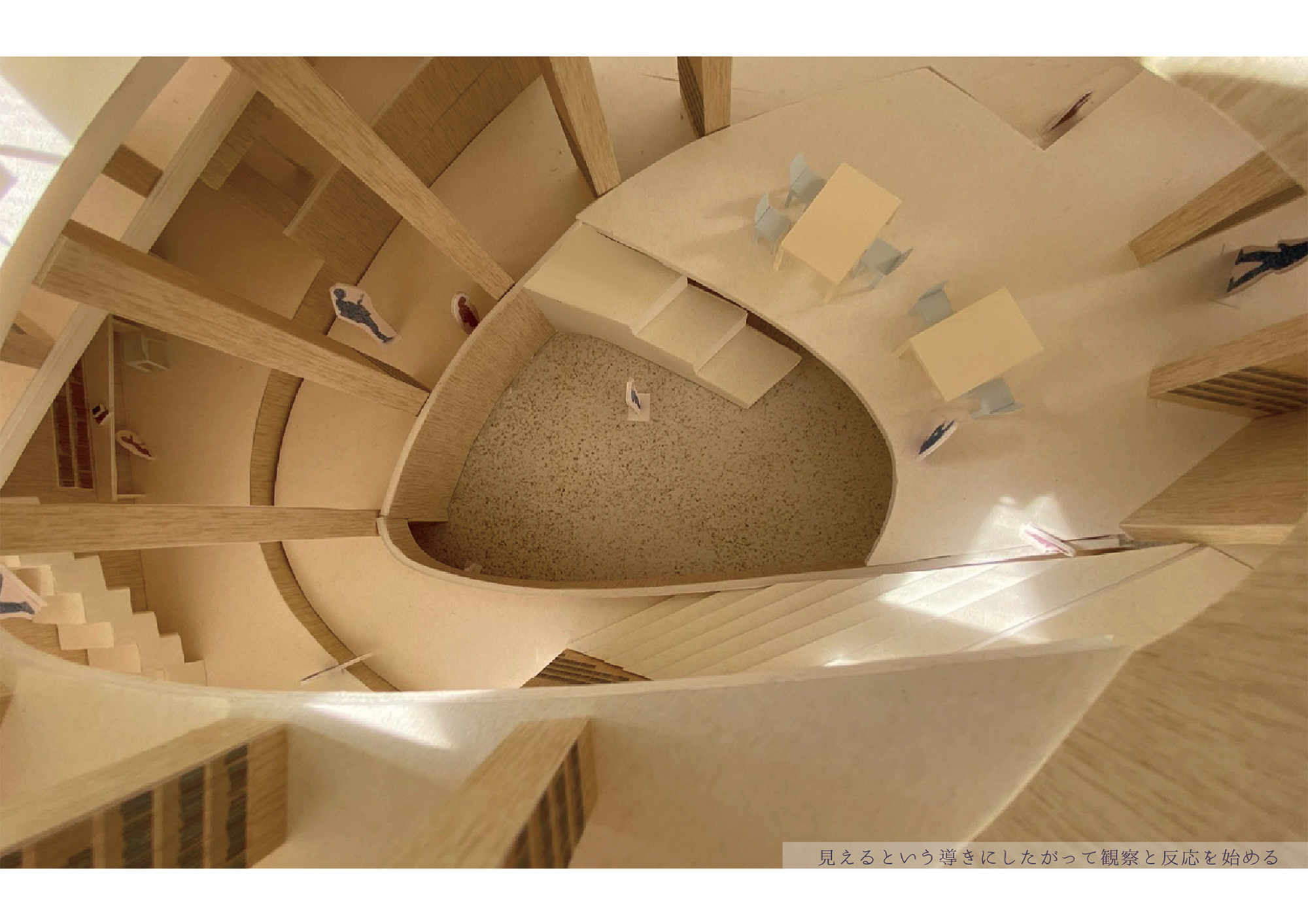 そこで‟見える”感覚を取り戻す可能性が潜在している図書館を、知識の収集にとどまらない創造的主体として感受することのできる拠点として設計する。