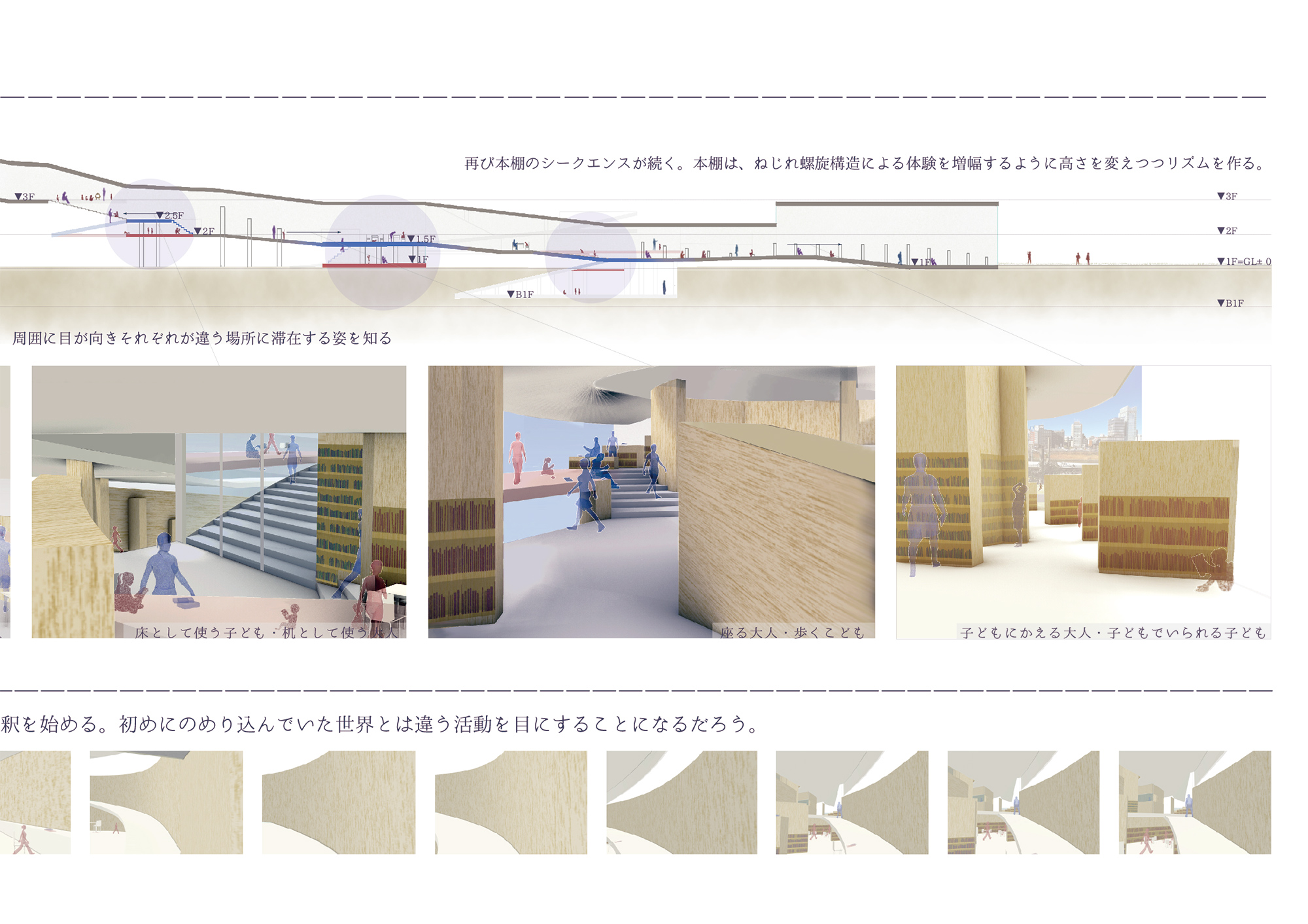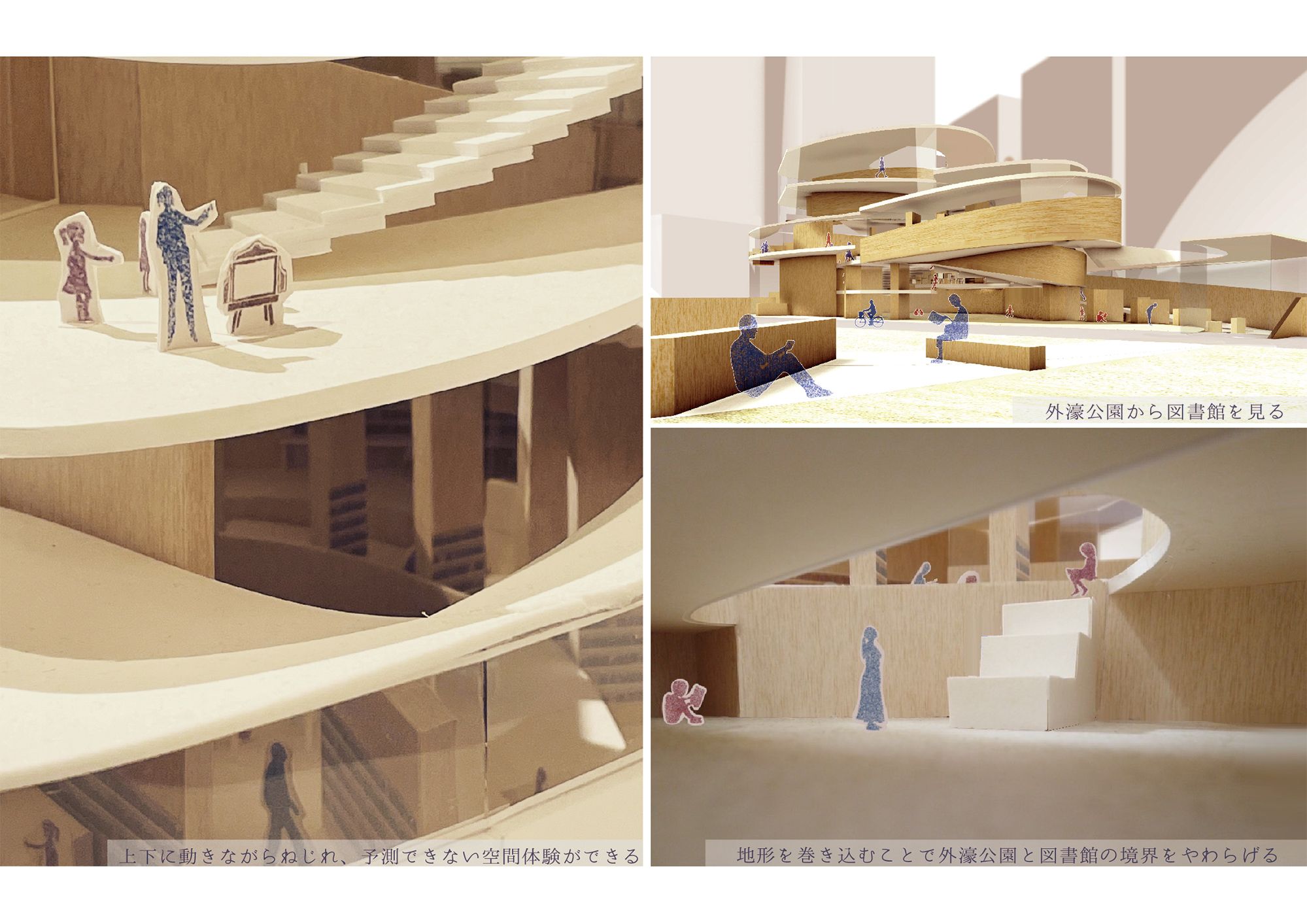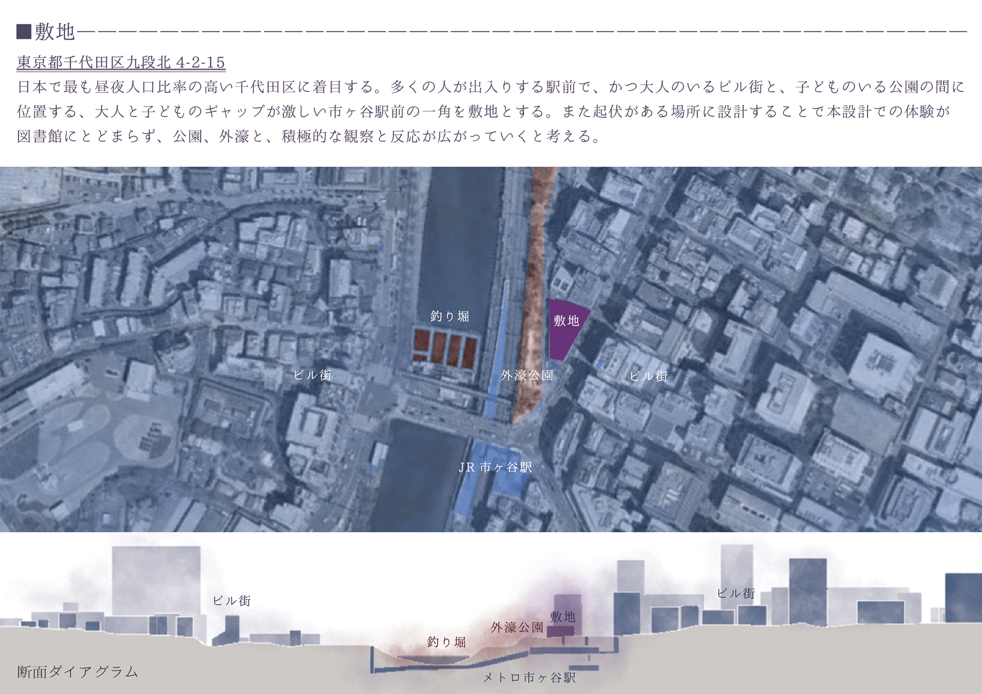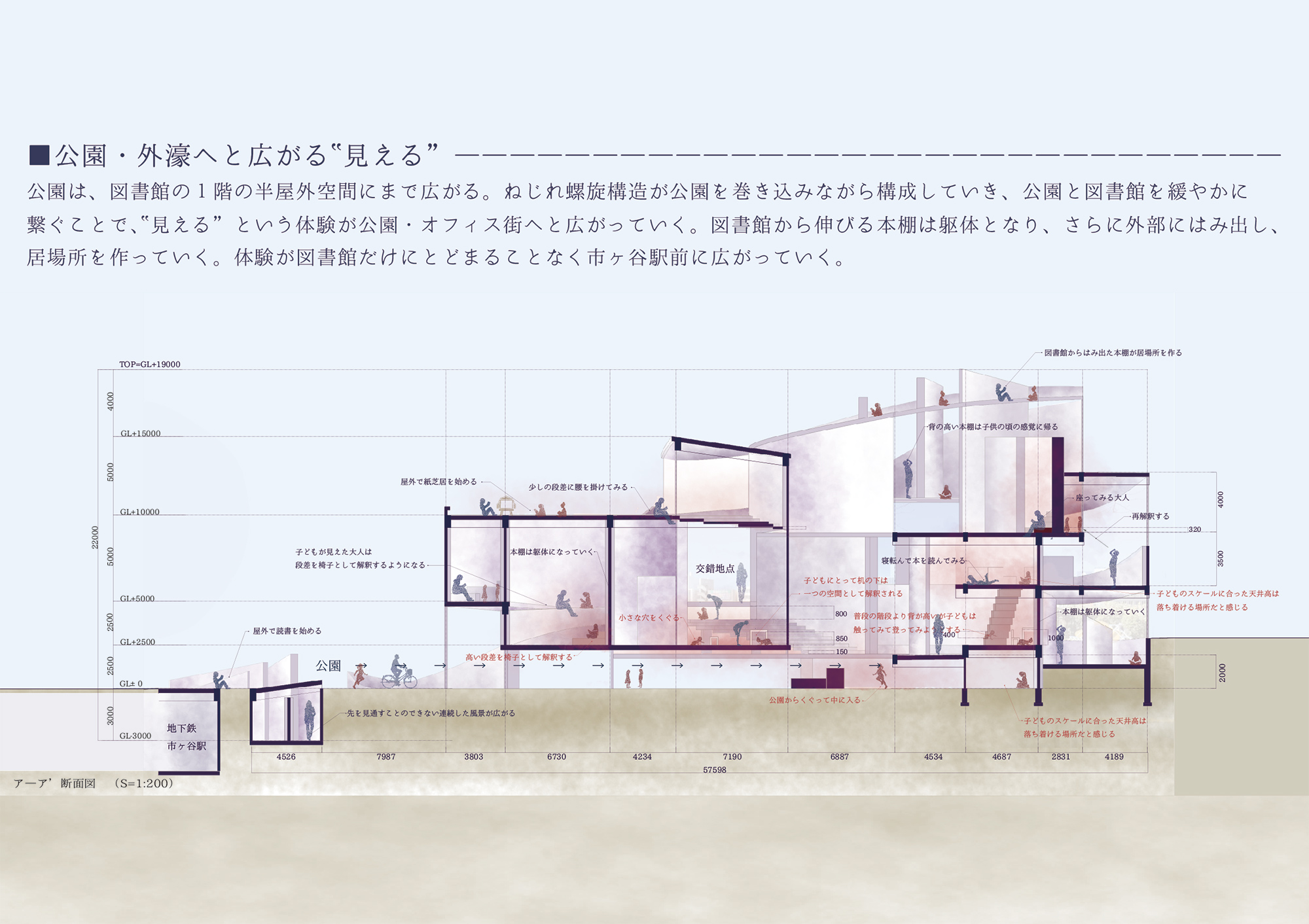 順路が一つに限られることなく‟見える”という身体性を伴う空間体験を生むねじれ螺旋構造と、検索行為の違う大人と子どもが同じ場所を通りながら体感的に検索する場を生む配架構造の両面から考え、起伏のある市ヶ谷駅周辺を引き込みながら、大人と子ども、知と身体を繋いでいくことで、新たな発想が発芽する場となる。そして体験は図書館にとどまらず、公園、外濠へと広がっていく。