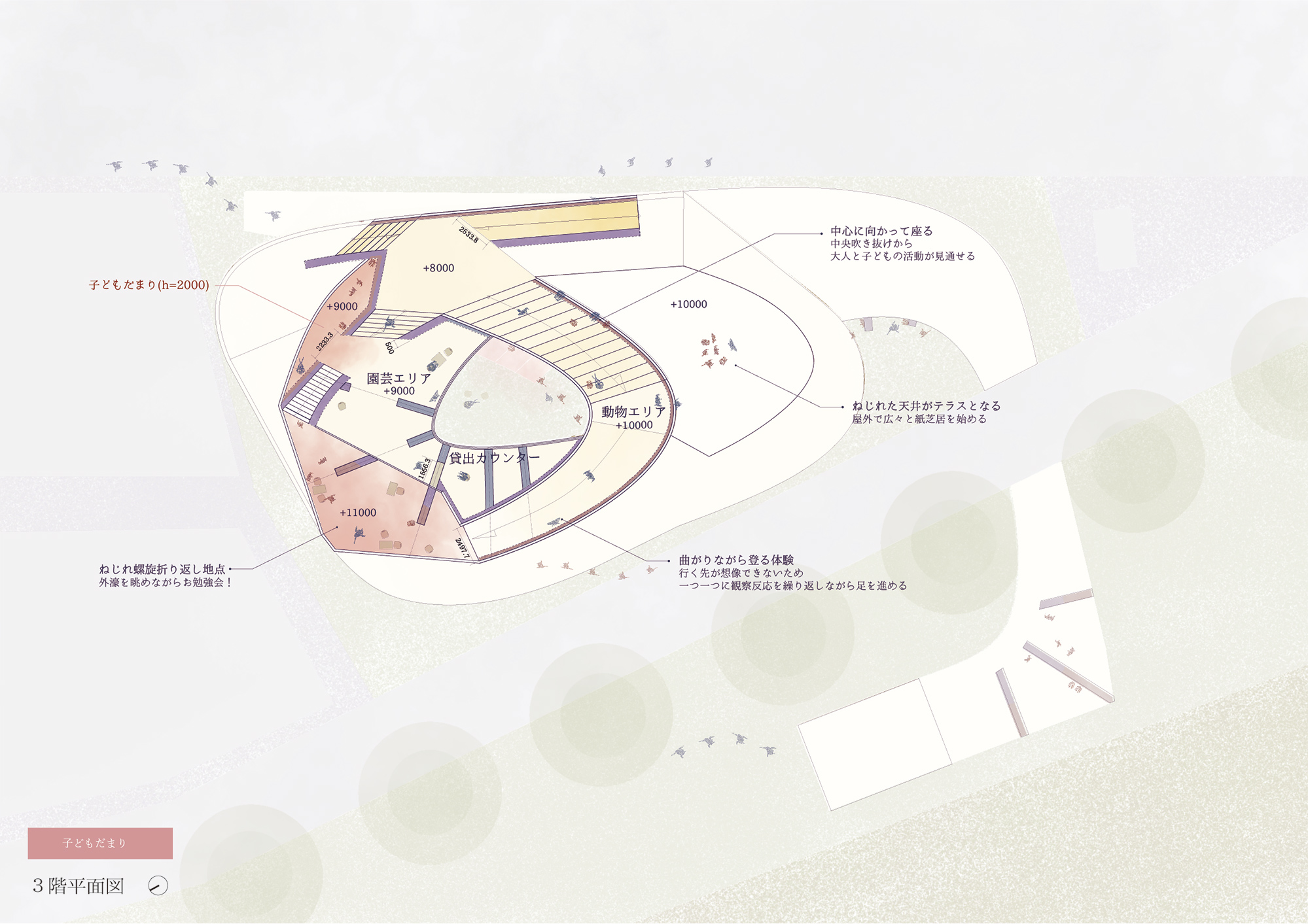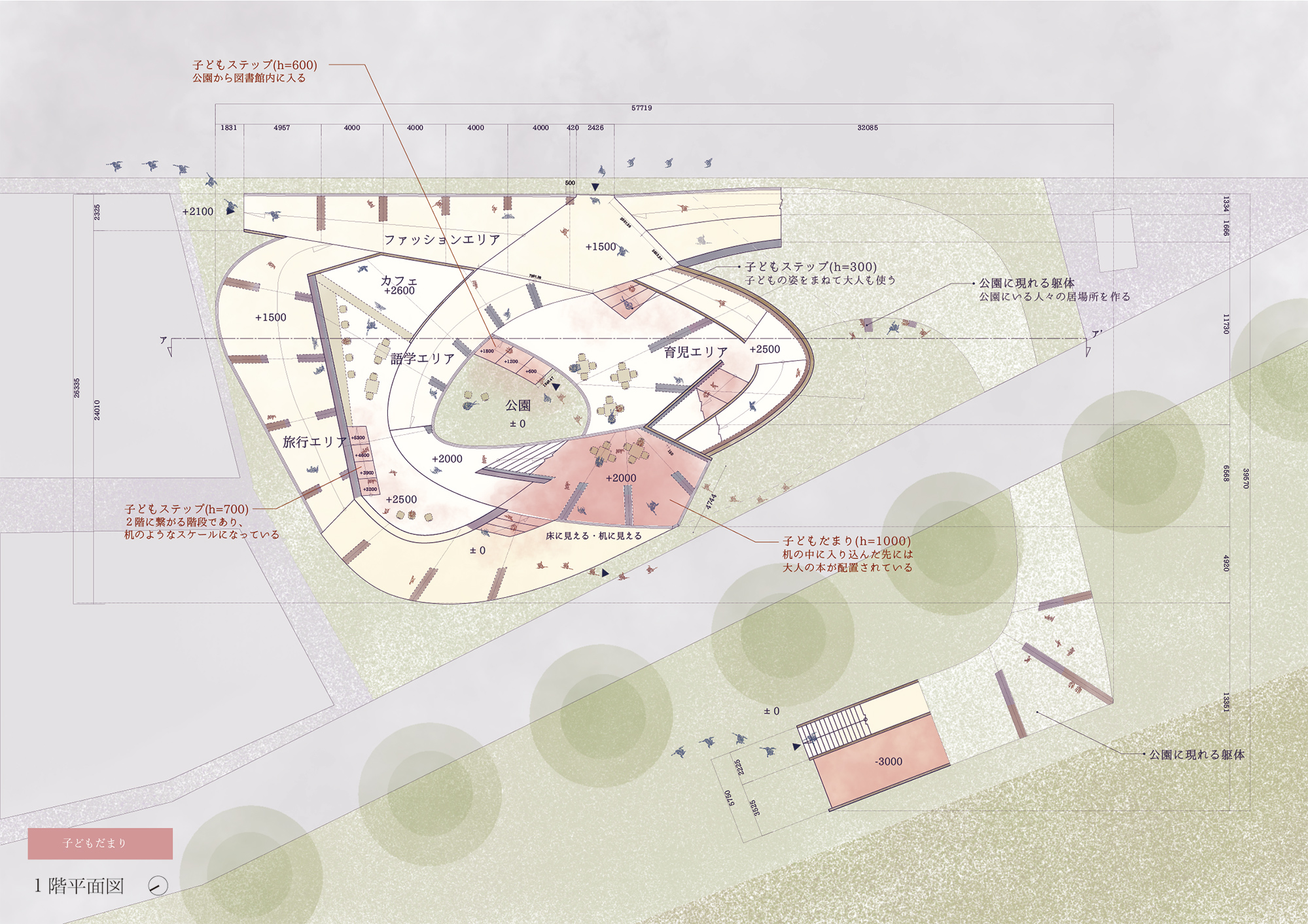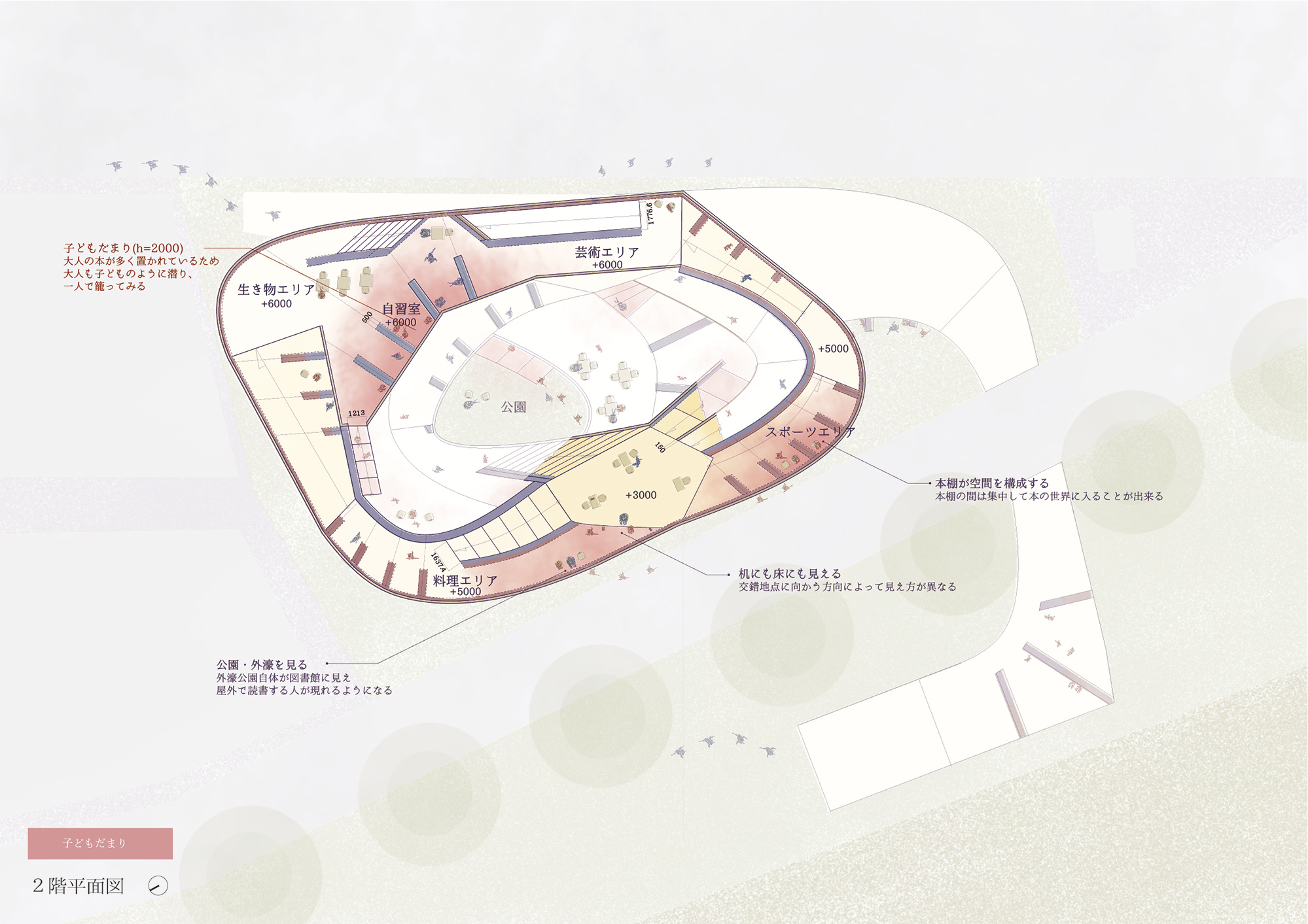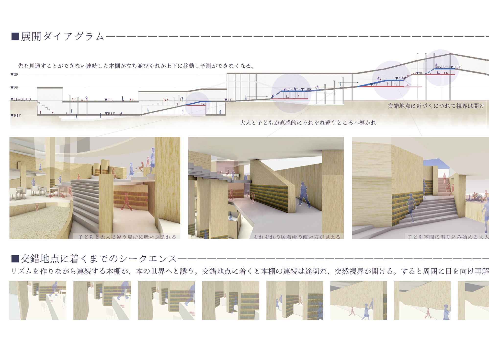 順路が一つに限られることなく‟見える”という身体性を伴う空間体験を生むねじれ螺旋構造と、検索行為の違う大人と子どもが同じ場所を通りながら体感的に検索する場を生む配架構造の両面から考え、起伏のある市ヶ谷駅周辺を引き込みながら、大人と子ども、知と身体を繋いでいくことで、新たな発想が発芽する場となる。そして体験は図書館にとどまらず、公園、外濠へと広がっていく。