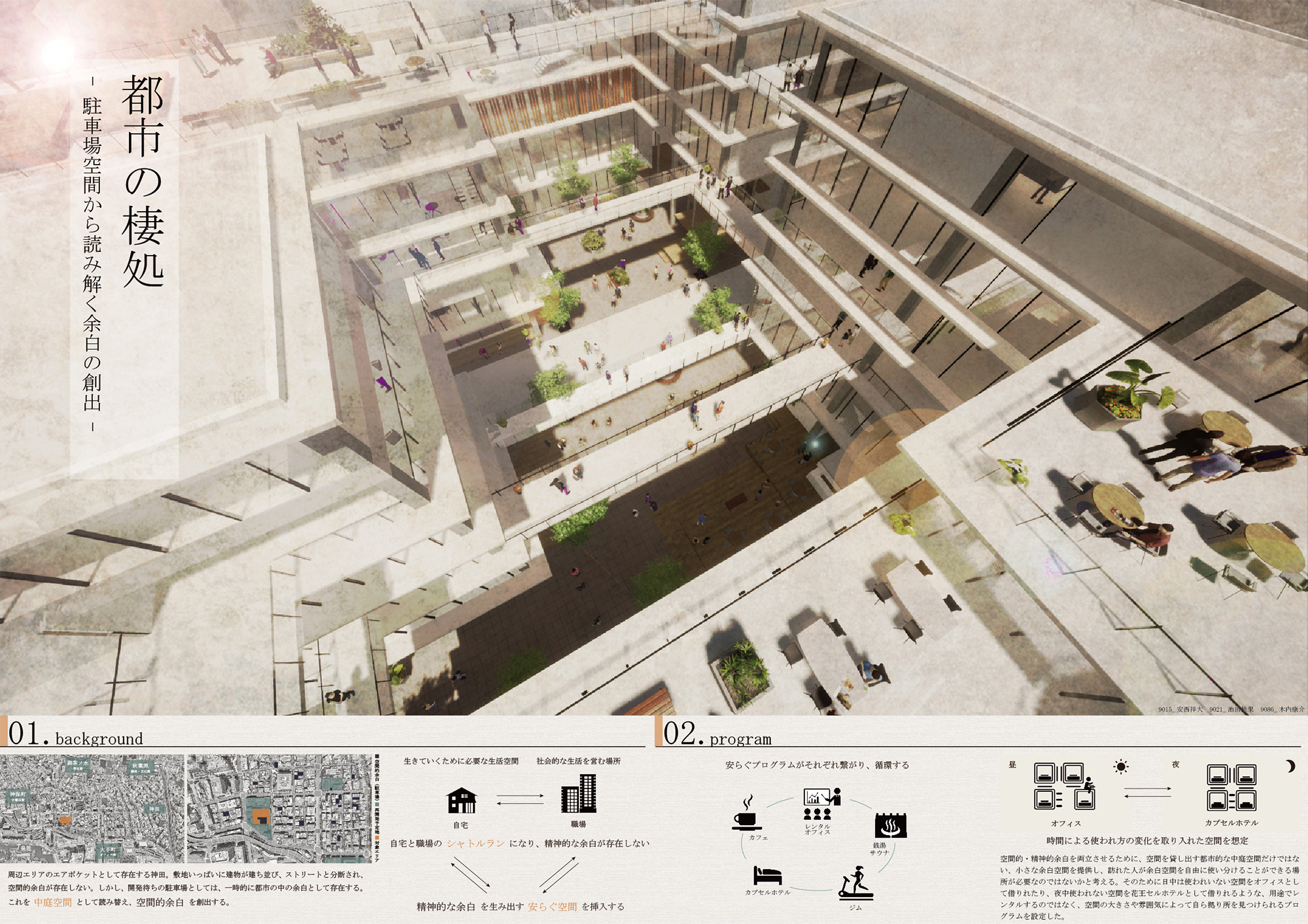 私たちは、このエリアに点在する開発待ちの駐車場に、空間的余白としての可能性を感じた。都市に存在するその空間的余白を、都市の中庭空間として捉え、建築全体に精神的余白を生み出す、自宅と職場の中間領域としての安らぐ空間を提案する。