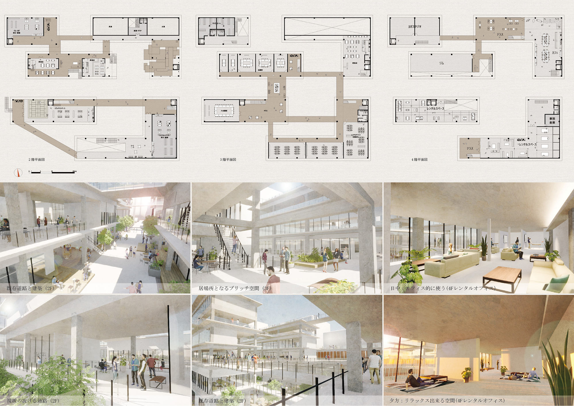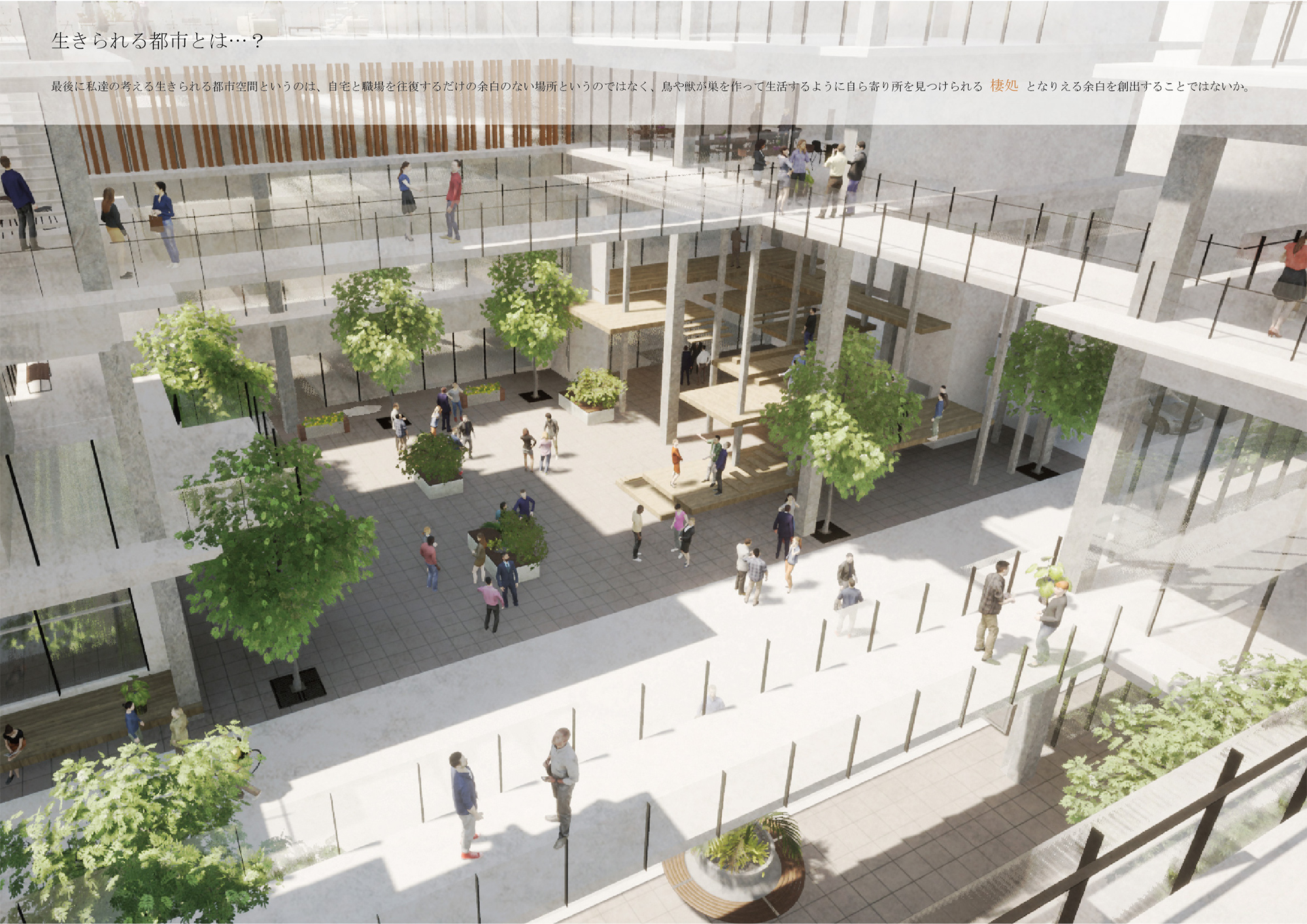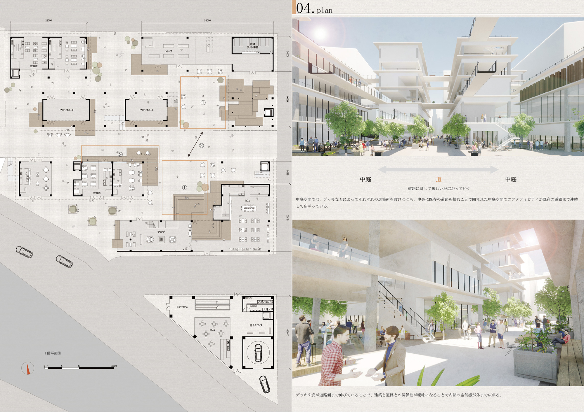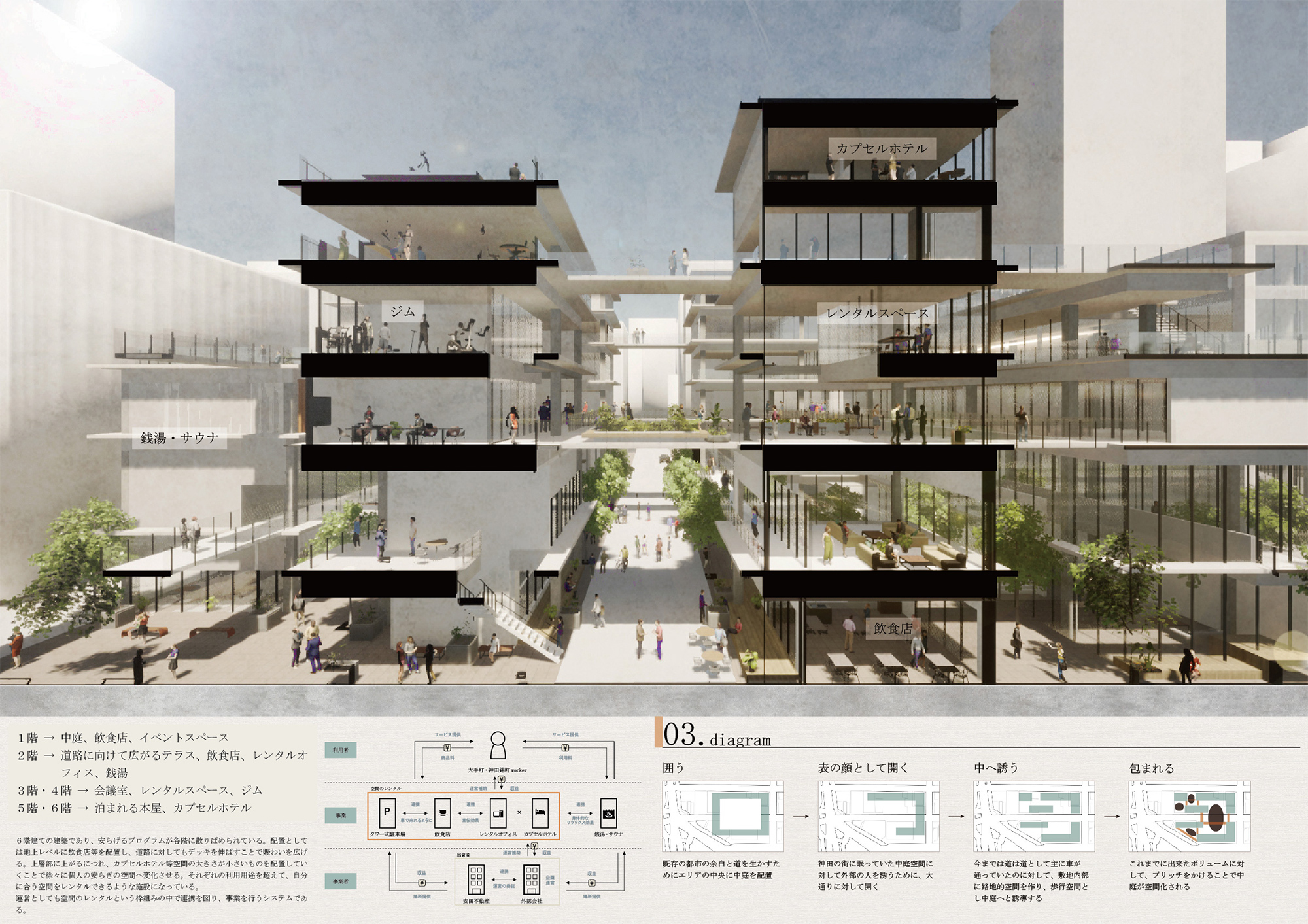 この建築では、既存の道路を挟むようにして中庭空間を持たせることで、道路をより歩行者中心な場所とし、新たな道路を介した活動のきっかけをつくる。建築全体に点在する中庭、テラス、橋空間での多様な活動や、建築内部のレンタルスペースや各施設によって、仕事などの日常的な利用と、安らぐ空間としての利用を可能としている。自分が思い描く空間、活動が実現できるだろう。