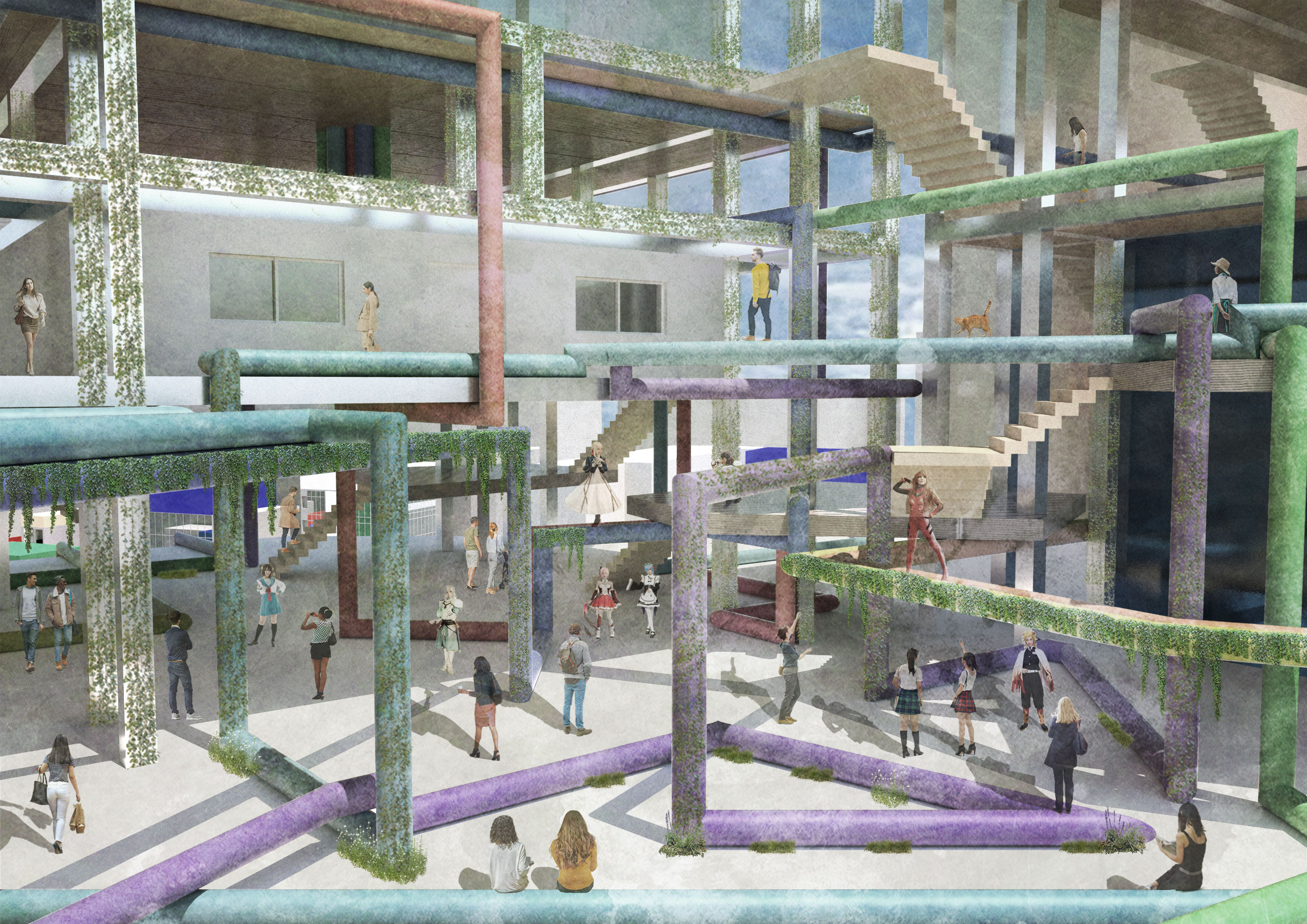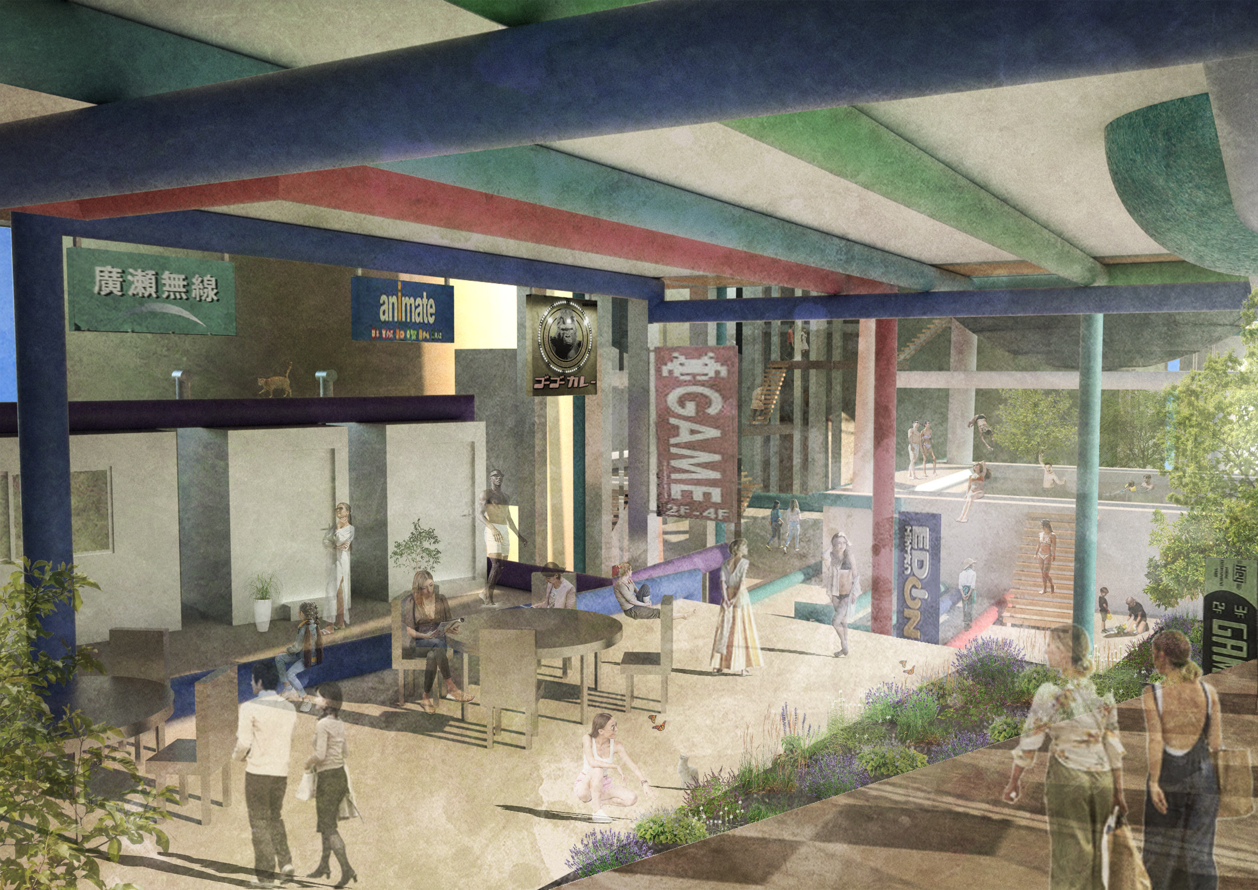 インフラ施設がコアとなることで、人の生活のためのスラブは自由な形を取り戻し、ストリート性や雑多性を高層化することに成功する。