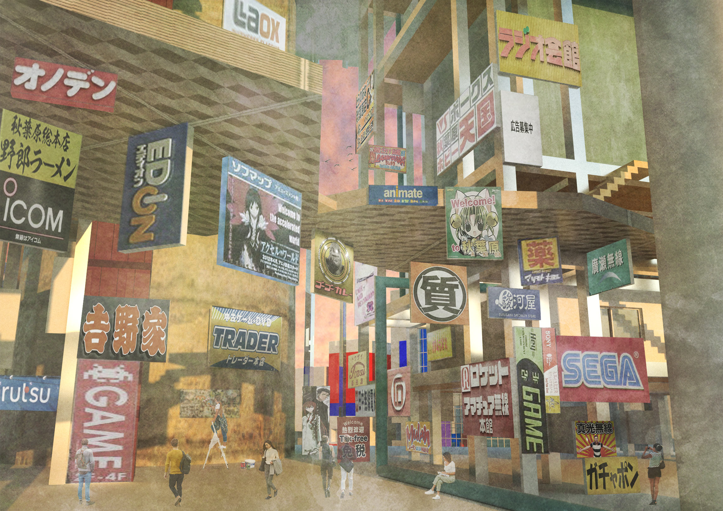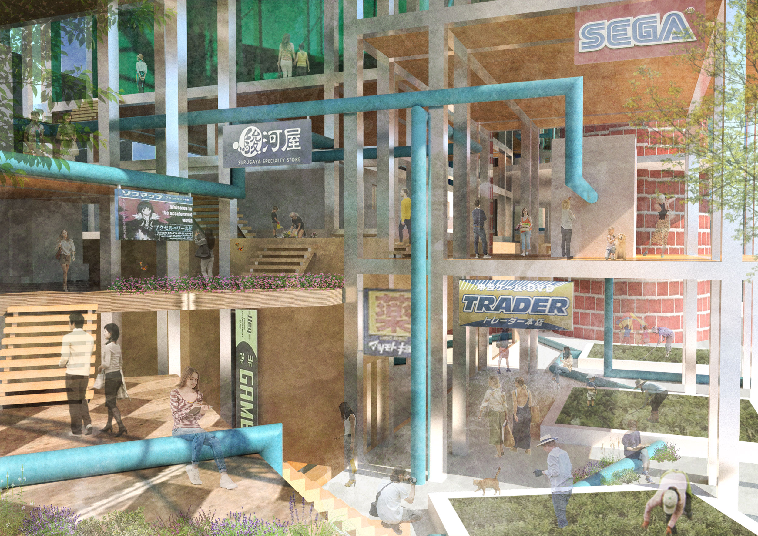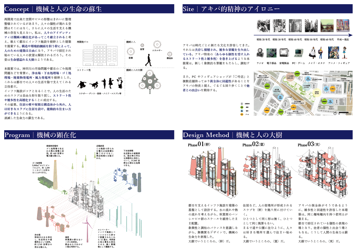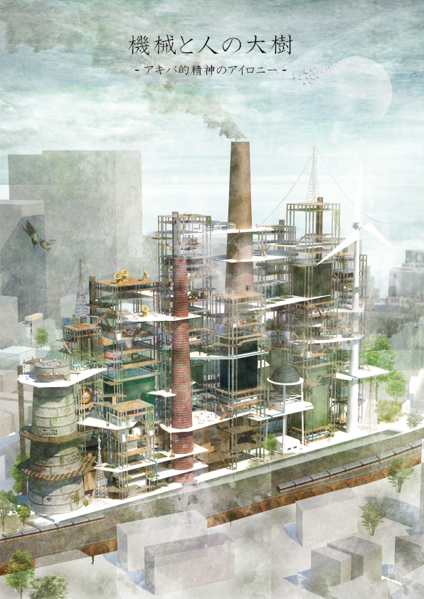 構造や環境的側面を担う幹によって、人のための建築は自由になり、アキバで抑圧され始めている人々の欲望は解放されるだろう。その姿は生命感溢れる大樹のようである。