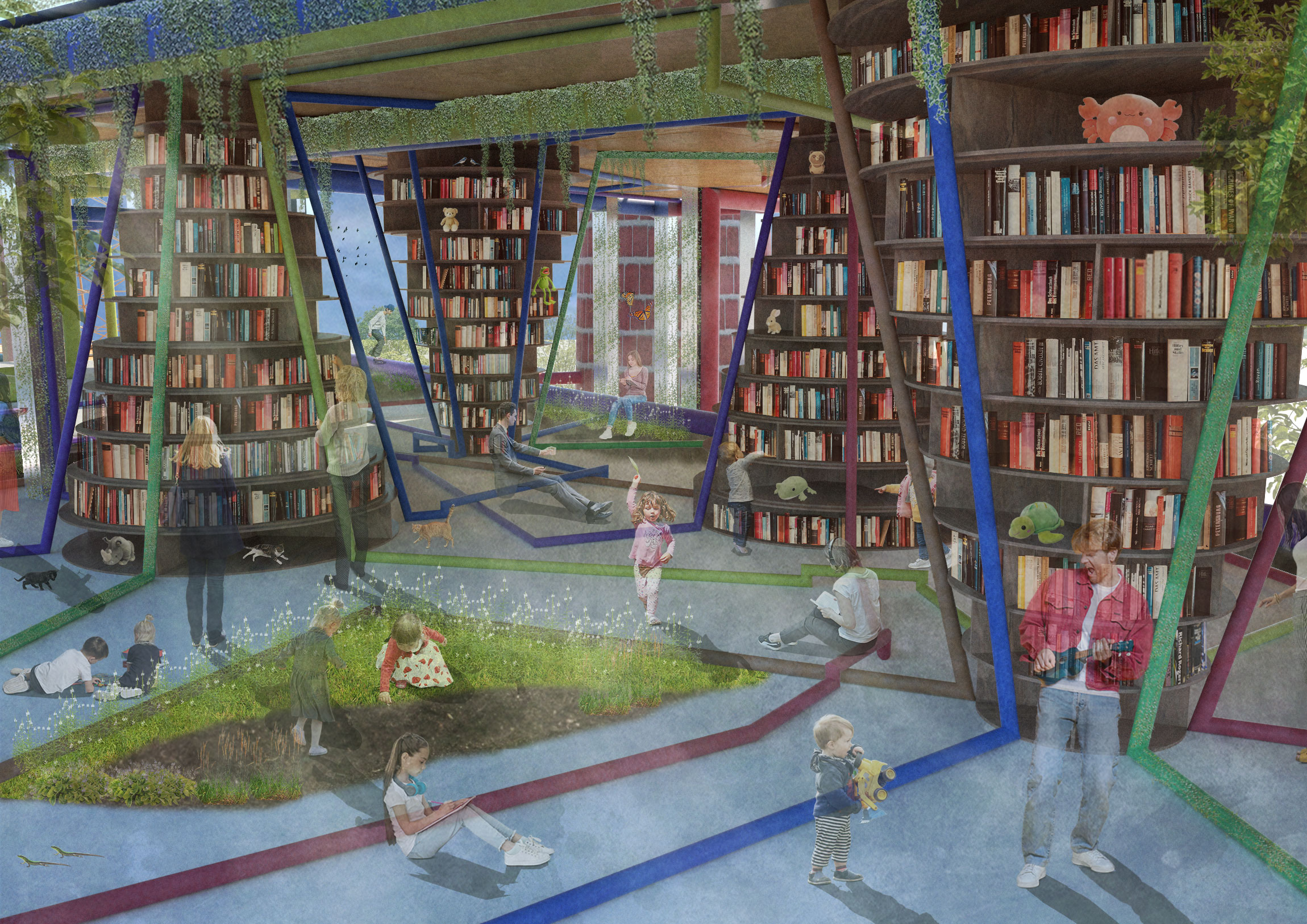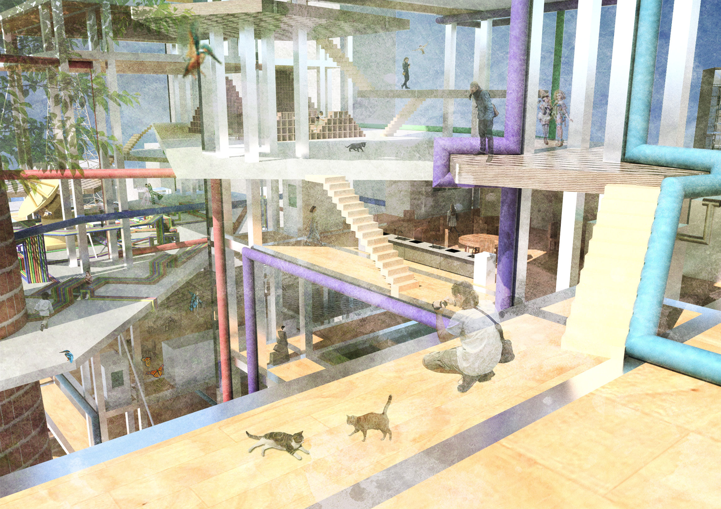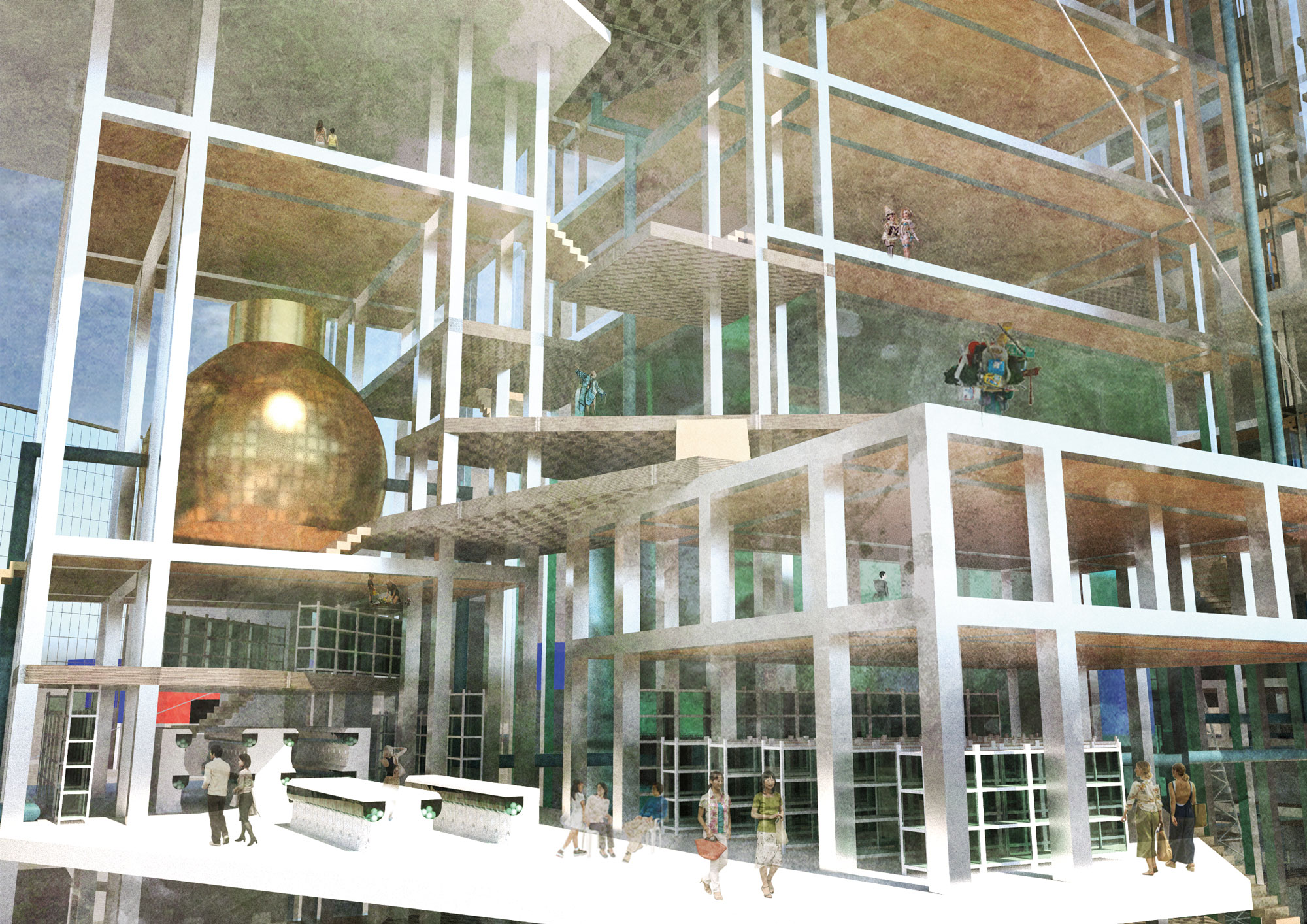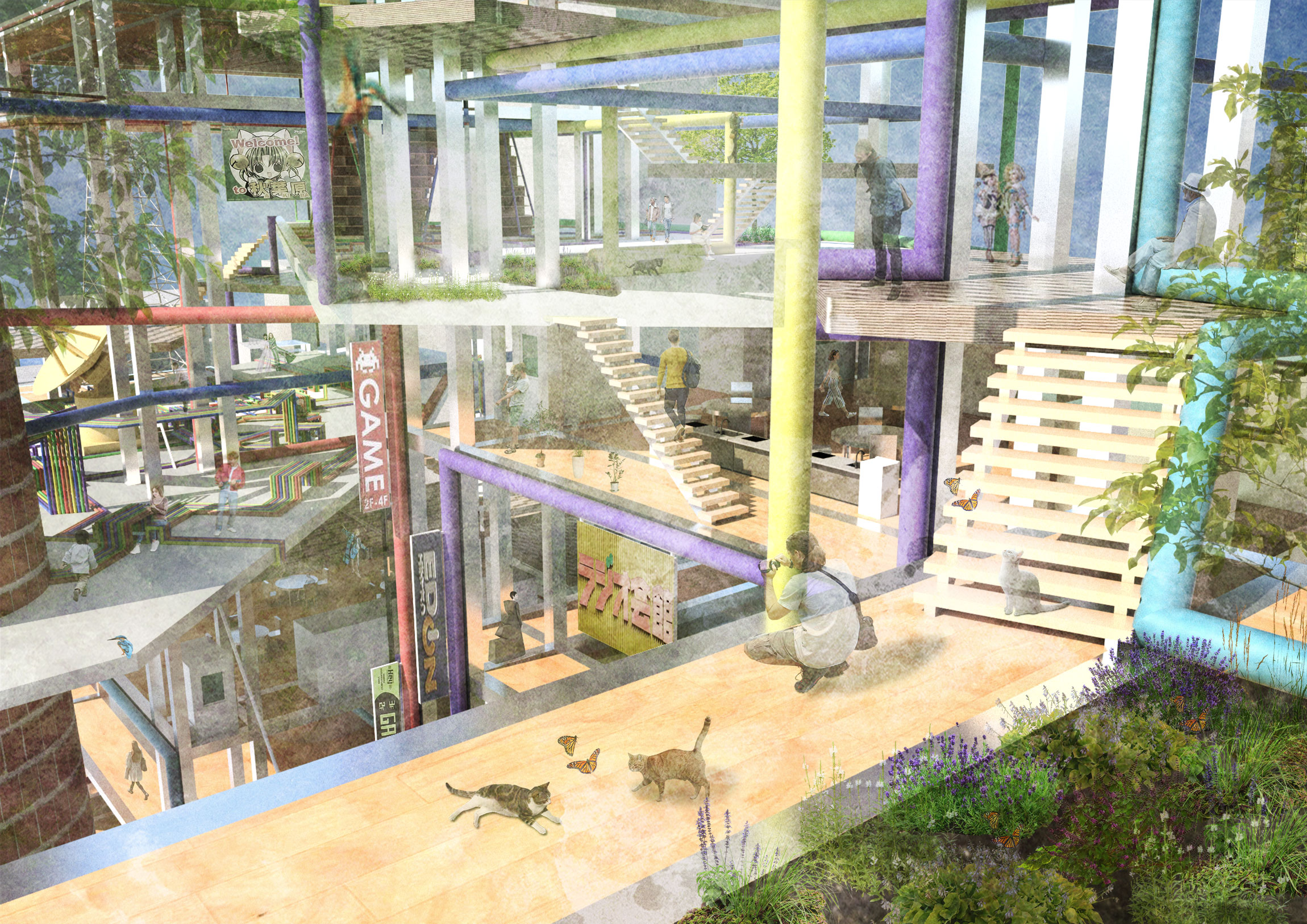 構造や環境的側面を担う幹によって、人のための建築は自由になり、アキバで抑圧され始めている人々の欲望は解放されるだろう。その姿は生命感溢れる大樹のようである。