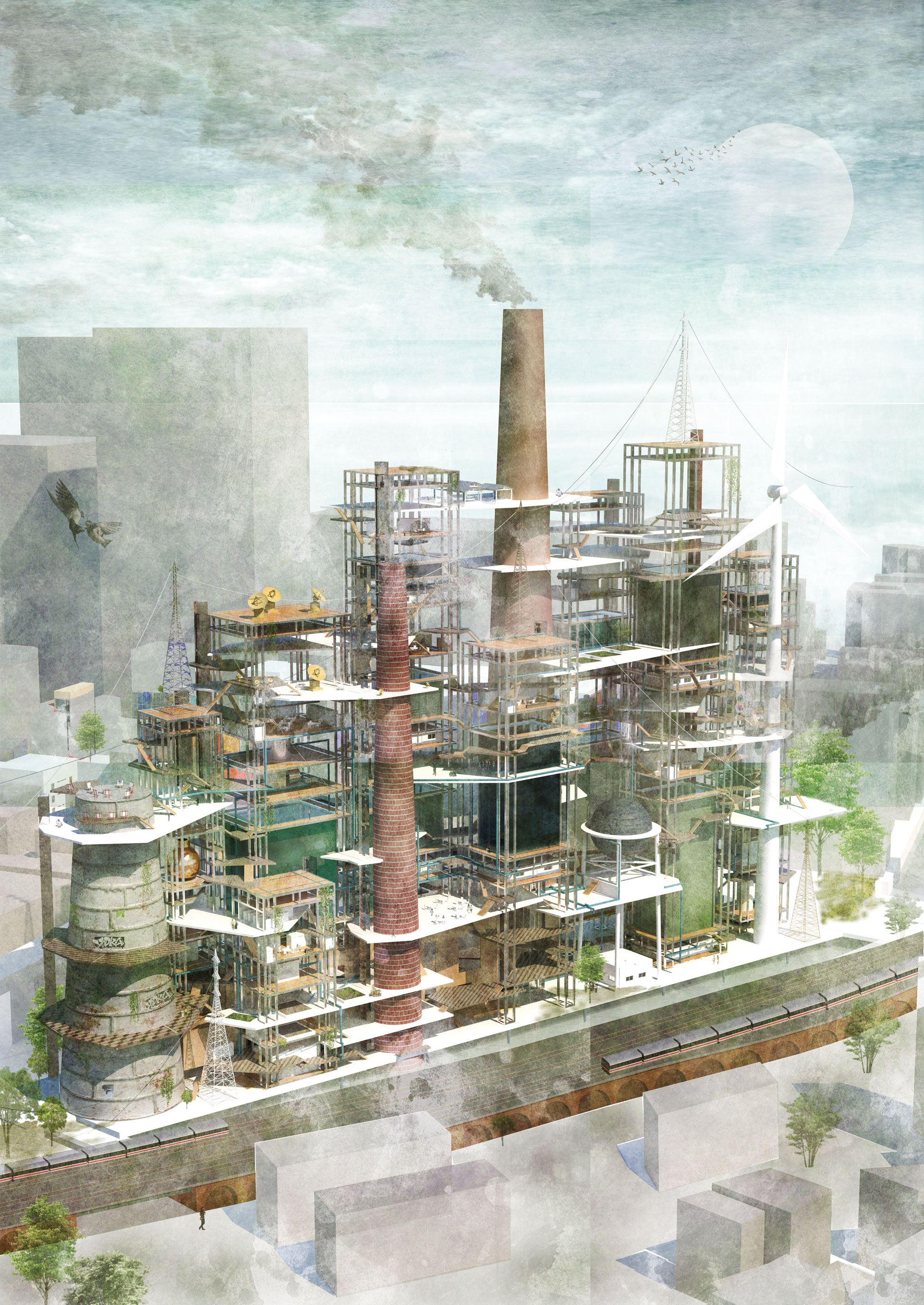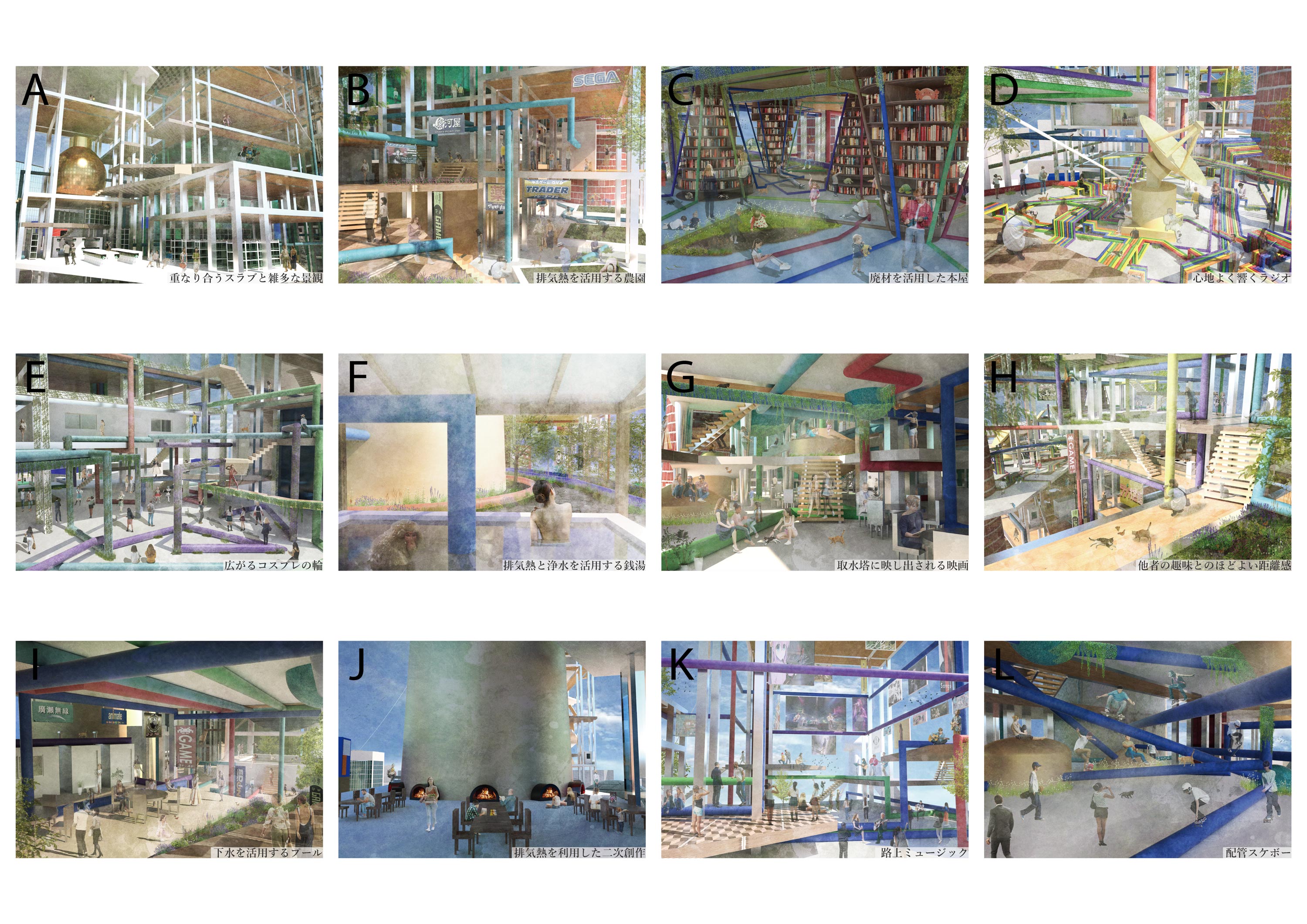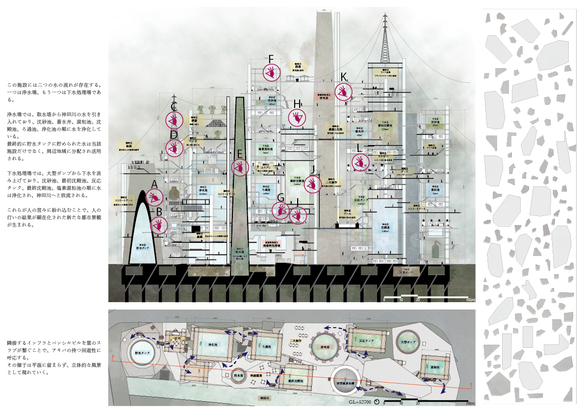 本提案では、神田川の汚染問題や都市のごみ処理問題などを背景に、浄水場・下水処理場・ゴミ処理場・廃棄物発電所・風力発電所を根幹とした。