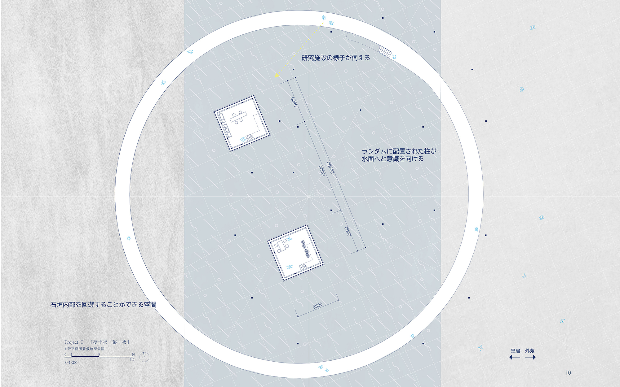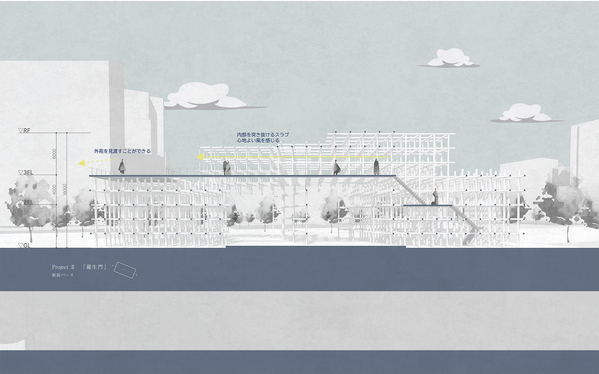 本設計では外苑の持つコントラストを享受し複雑に絡み合わせる、曖昧さを保有した建築空間の設計を3つの敷地を設定して試みる。