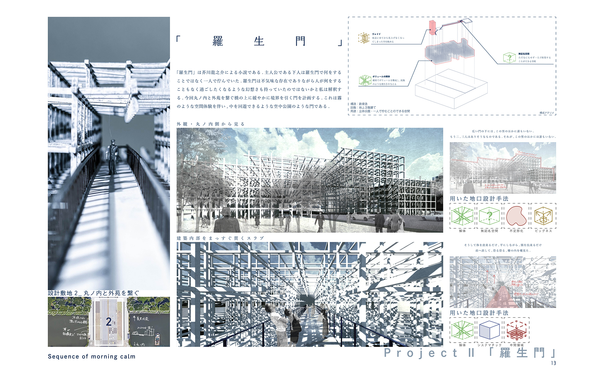この手法を踏襲し、曖昧さを持つことで多義的解釈を可能とする空間装置の習作「朝凪のシークエンス」を提案する。