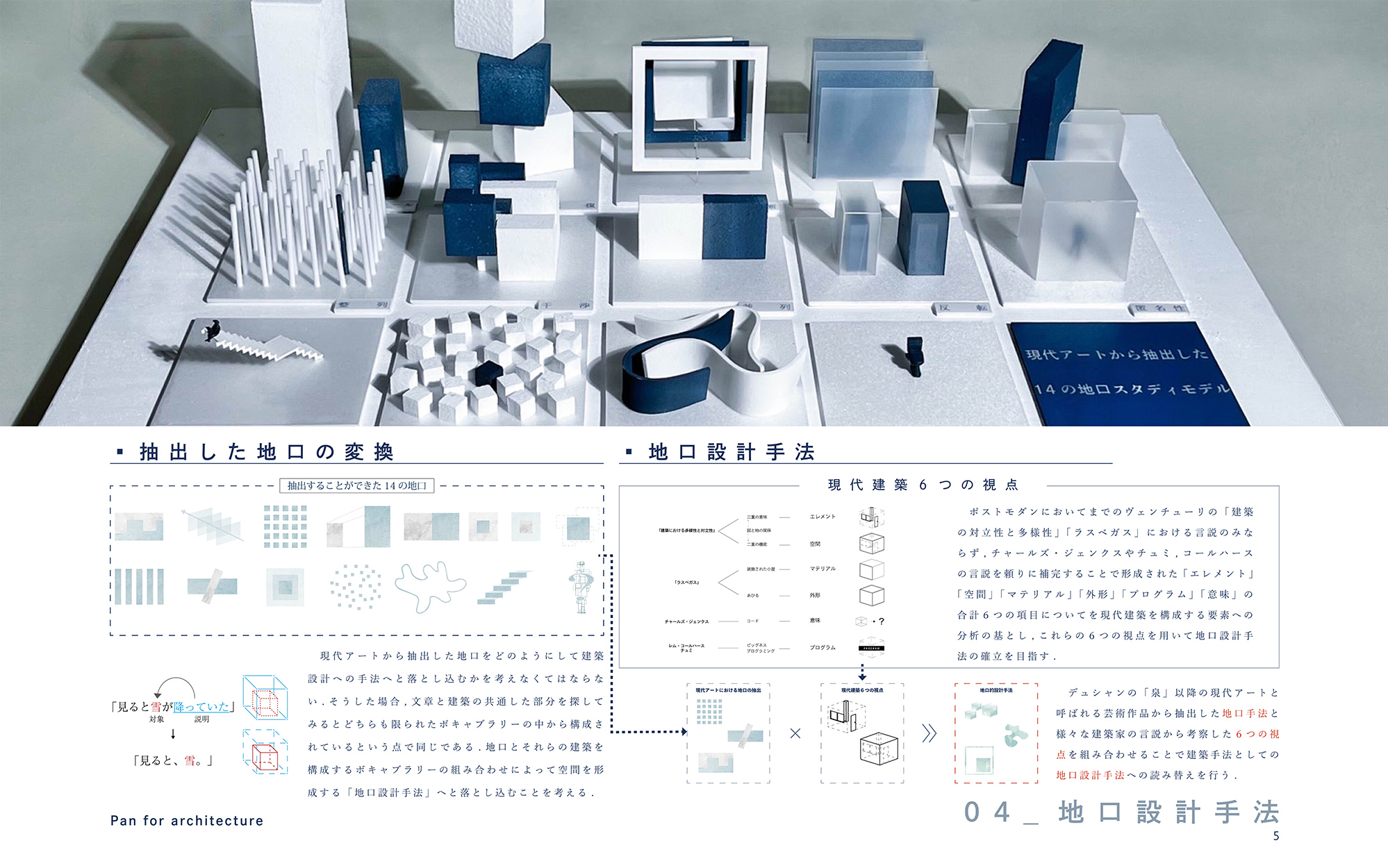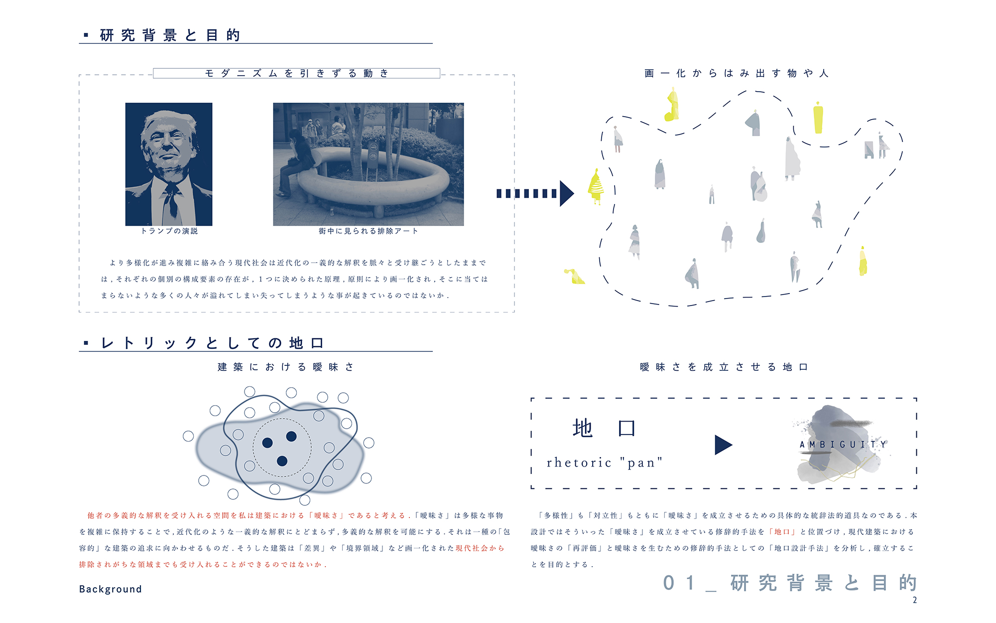 場が保有するコントラストを享受し、複雑で曖昧さを伴う建築空間の設計を行う事により鑑賞者や利用者による多義的な解釈を引き起こす。