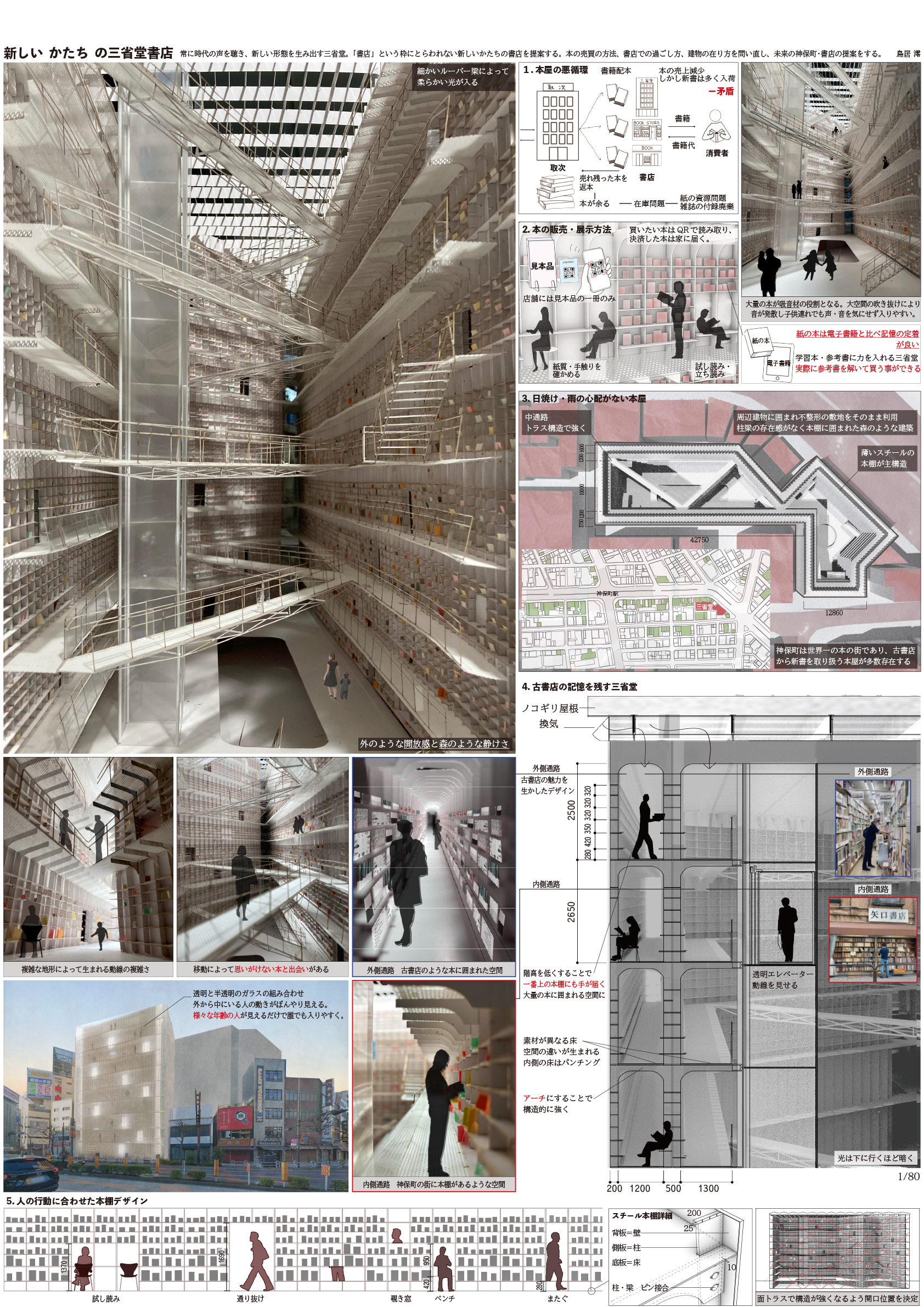 常に時代の声を聴き、新しい形態を⽣み出す三省堂。「書店」という枠にとらわれない新しいかたちの書店を提案する。本の売買の⽅法、書店での過ごし⽅、建物の在り⽅を問い直し、未来の神保町・書店の提案をする。