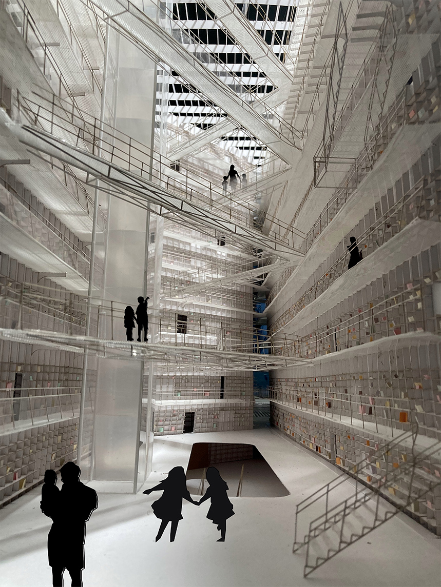 古書店は、敷居が⾼く⼊りづらいと感じている⼈や、⼦供連れで⼊りづらいと感じている⼈も、新三省堂では⼊⼝のファサードから内部の様⼦が⾒え、⼊りやすくなるだろう。中に⼊ると⼤きな吹き抜けに出て、また外に出た感覚になる。本が苦⼿な⼈でも通り抜けの感覚で様々な本に出会い新しい世界を⾒つけることができる。