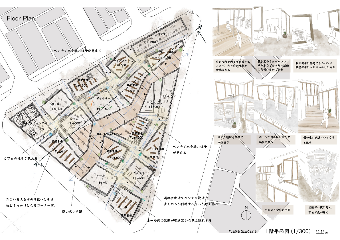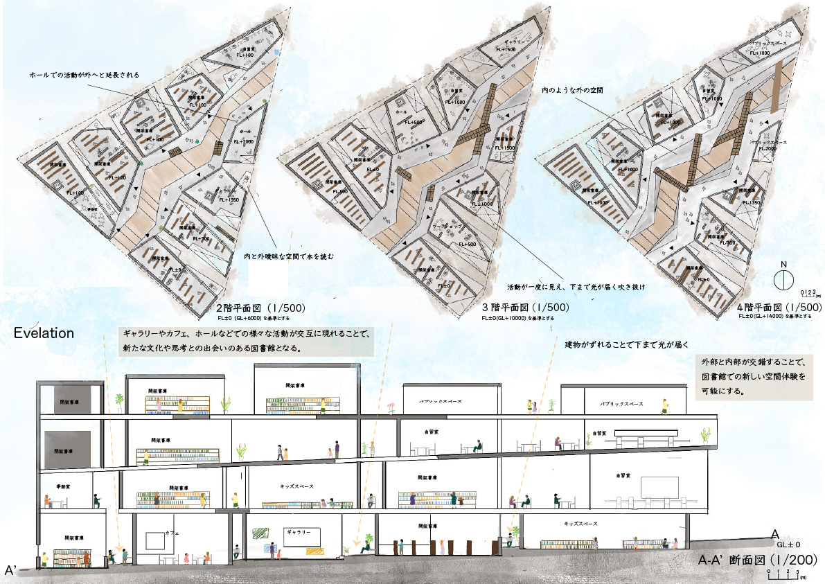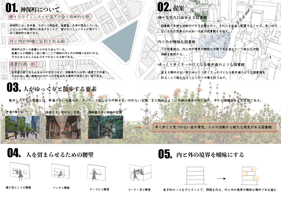 神保町は古本屋、スポーツ用品店、大学、楽器屋などさまざまなコミュニティが混在する街である。それと同じように人や車が忙しなく行き交い、古本屋の前で立ち止まる人々が目立ってしまうほど、神保町には留まる場所や速度の遅いものが存在しない。それにより、地域の憩いの場や社会的な繋がりを持つきっかけとなる物理的な場が失われている。そこで、図書館に訪れることで歩く速度が遅くなり、新たなコミュニケーションや、本や図書館で行われるさまざまな活動から新たな発見がある散歩道のような図書館を提案する。また、神保町は高層の建物が多く、垂直に長く伸びる建物により内と外の境界が明確であることが特徴として挙げられる。そこで、この図書館では外とうちの境界を曖昧にし、内と外の狭間で本を読むという新たな空間体験を提供すると同時に、内と外の境界が曖昧になることで、より多くの人が入り込みやすくなる。また、さまざまな文化が混在している街であるのにも関わらず、それぞれのコミュニティに属する人々が他のコミュニティに属する人々と交流する場が神保町には存在しない。そのため、この図書館が様々な文化が混ざり合う拠点となることを目指す。