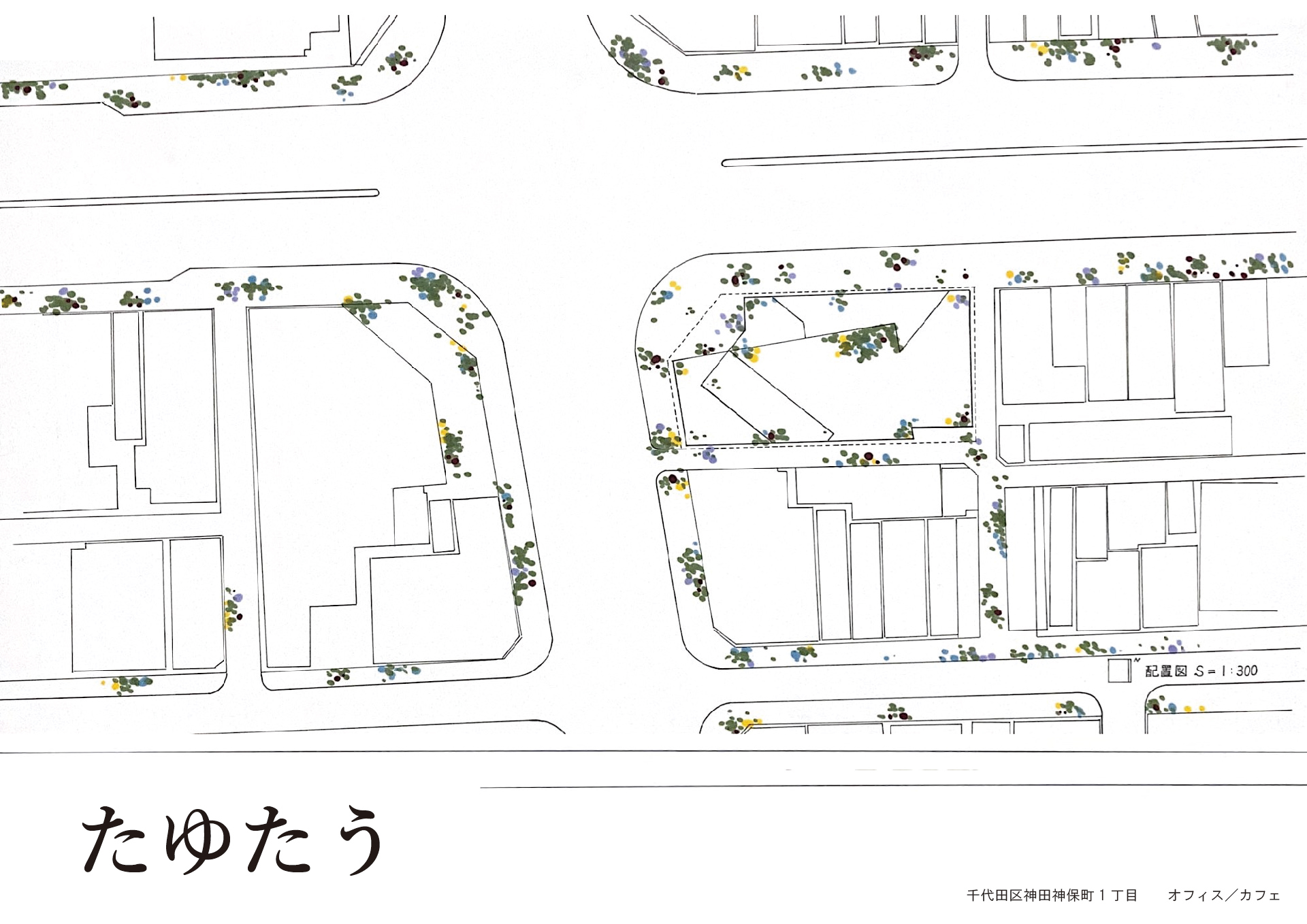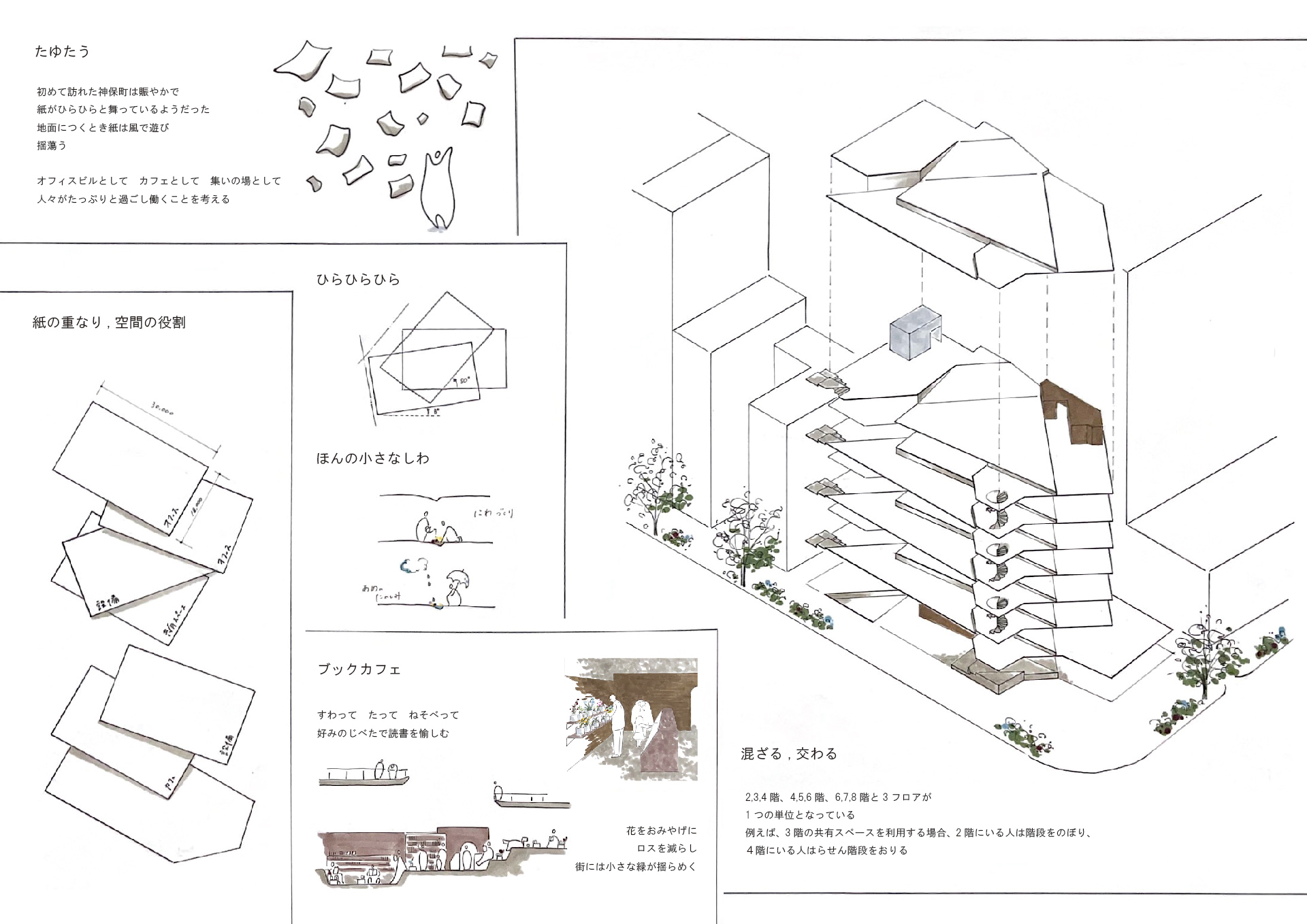 本、言葉、文字、しゃべり声、表情。神保町を沢山の情報が満たしている。古いものと新しいものが混ざり合い、区別できないほどである。ぱっと手放した紙のように方向も速さも異なるまま、ただ同じ街に在る。宙を舞う紙は地面につく少し前、速度を落として風と遊び、揺蕩う。賑やかな外から一歩内へ、神保町を訪れた人々がたっぷりと過ごす場を考える。