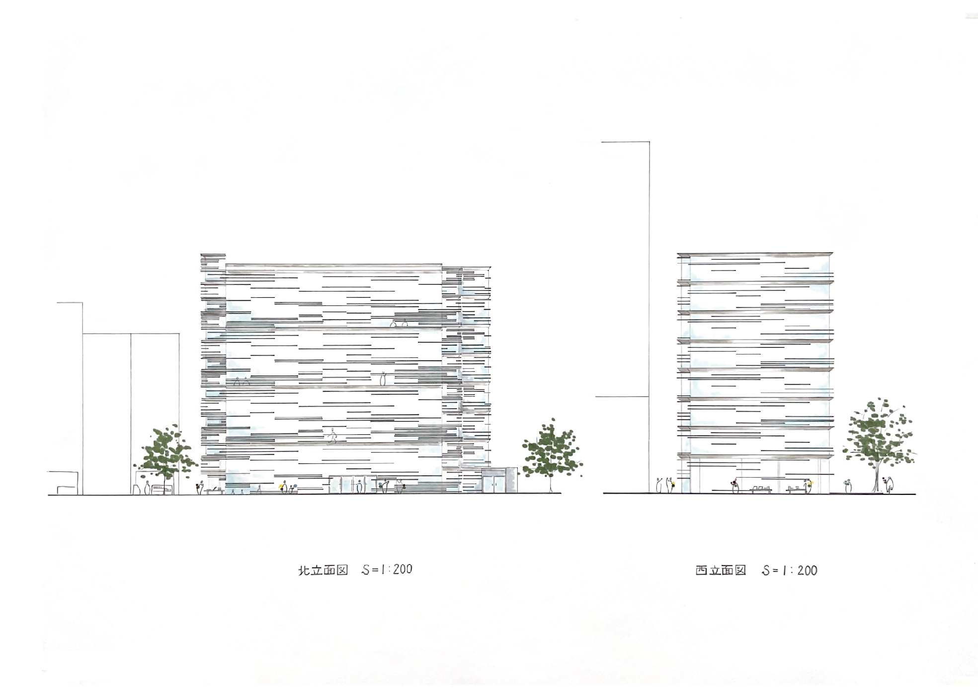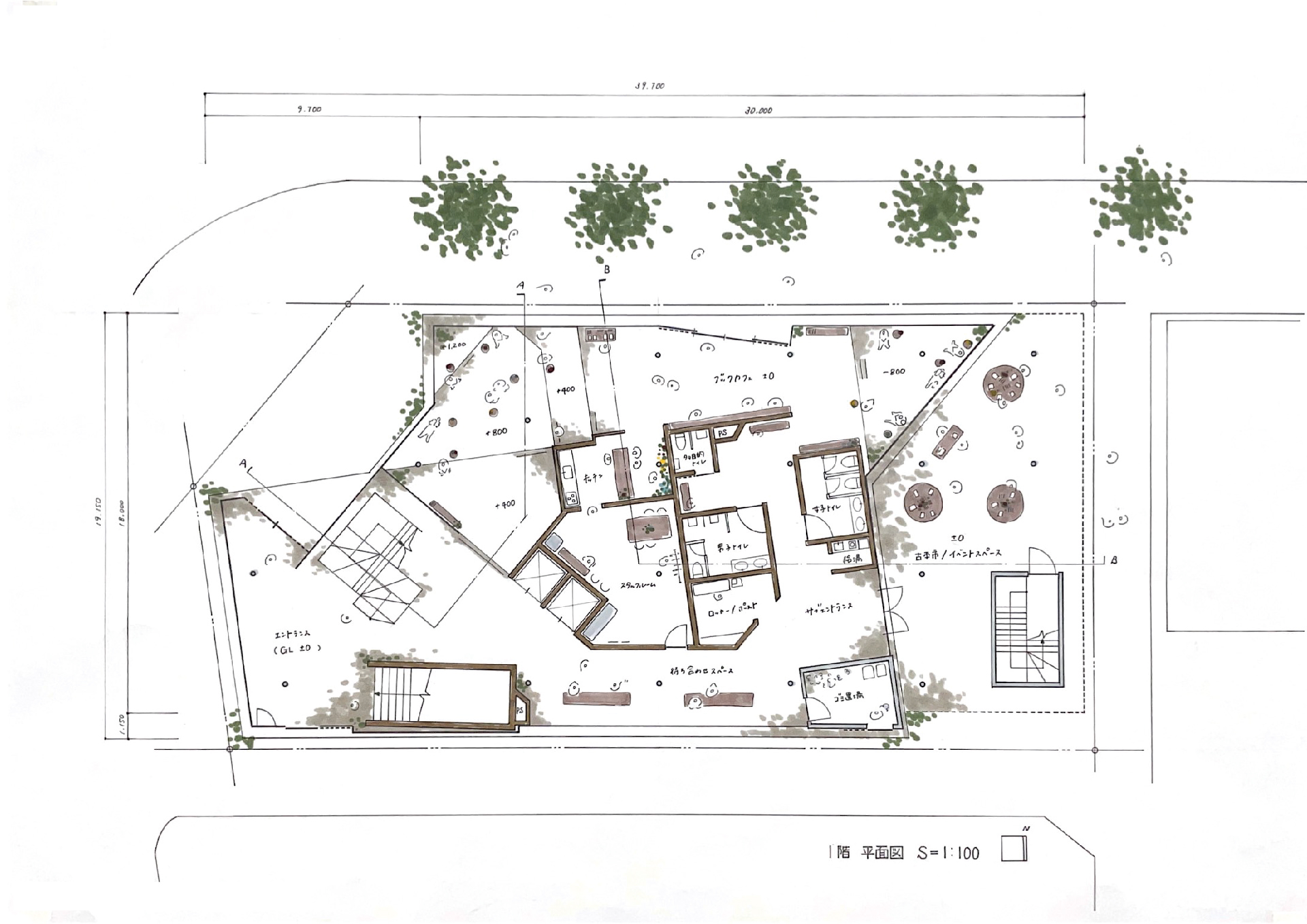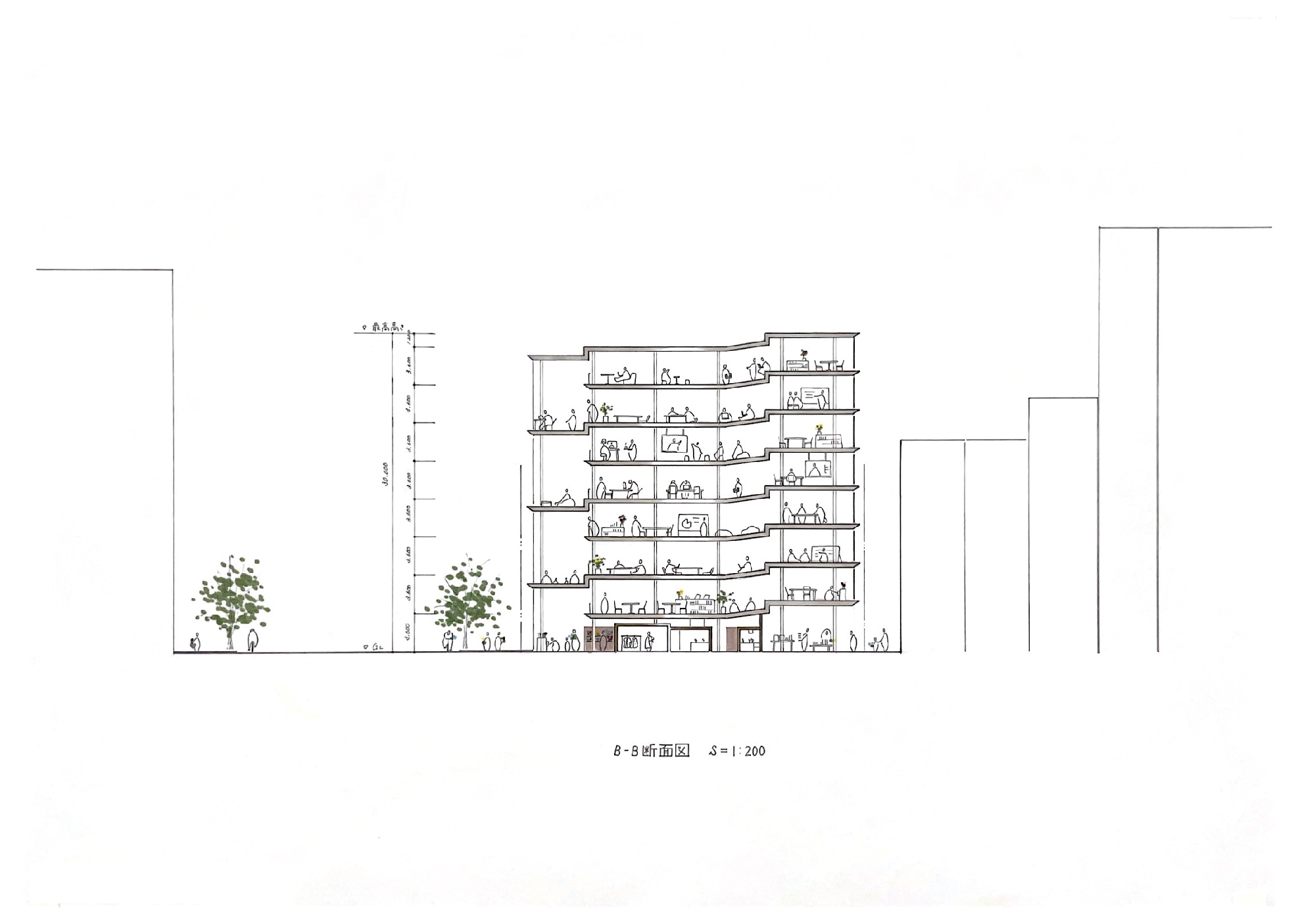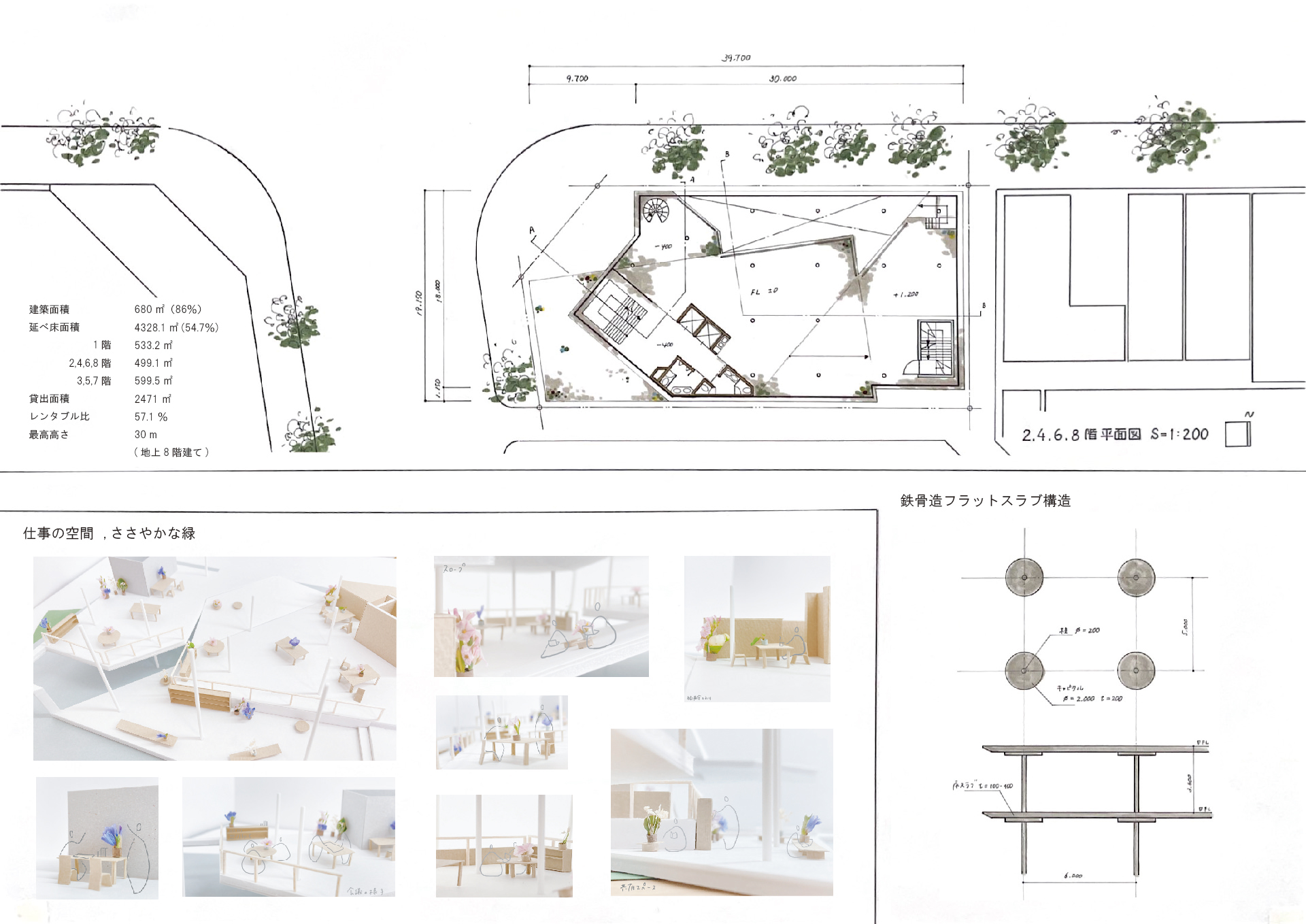 1階のブックカフェには、花が並ぶ棚を設えている。周辺の花屋で発生したロスを読書やコーヒーのお供に、活用していく。スラブには僅かな窪みがあり、そこには雨や土が溜まる。屋上緑化や街路樹は、大きな力で環境改善を進めてくれるが、その反面、自然は徐々に遠い存在となってしまう。建築から一輪の花をもって、或いは花束を抱えて、街に出ていく姿を想像してみてほしい。小さな緑や色とりどりの花が街から街へ揺らめいているだろう。
