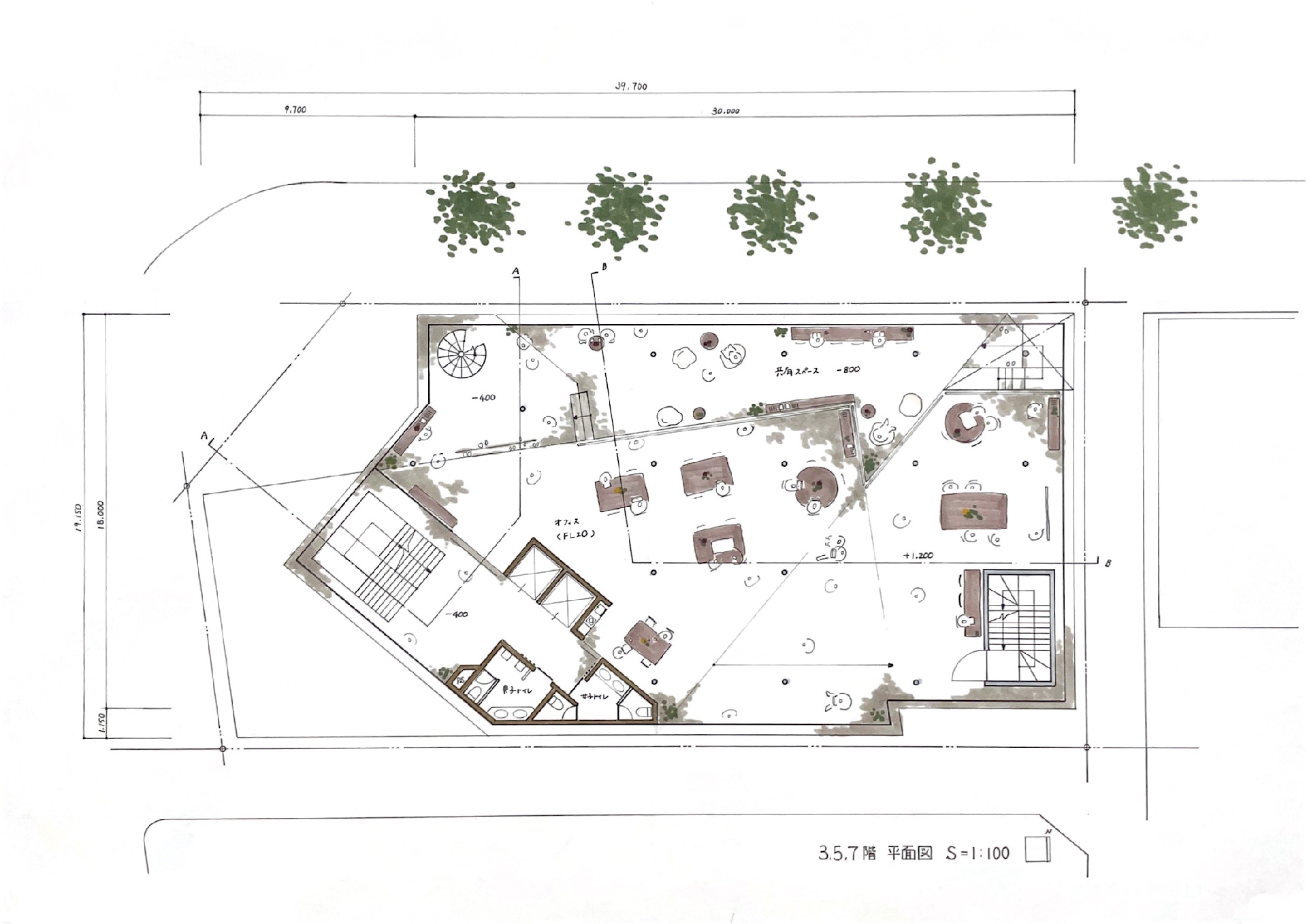 敷地は靖国通りと白山通りの交わるところに位置する。南側には神保町特有の細い路地があり、駐車場の古本市やカレー店の行列など人々の振る舞いは実に多様だ。本案では、30m×20mほど(文庫本の200倍の長さ)の面を3枚、それぞれ敷地線に合わせた角度に振り、これを重ねて1フロアとしている。空気的に一繋がりであるものの、家具スケールの段差とスロープが場面を切り替え、場にあった振る舞いを促す。色々なポーズで仕事をこなす姿は、街の様子と重なっていく。