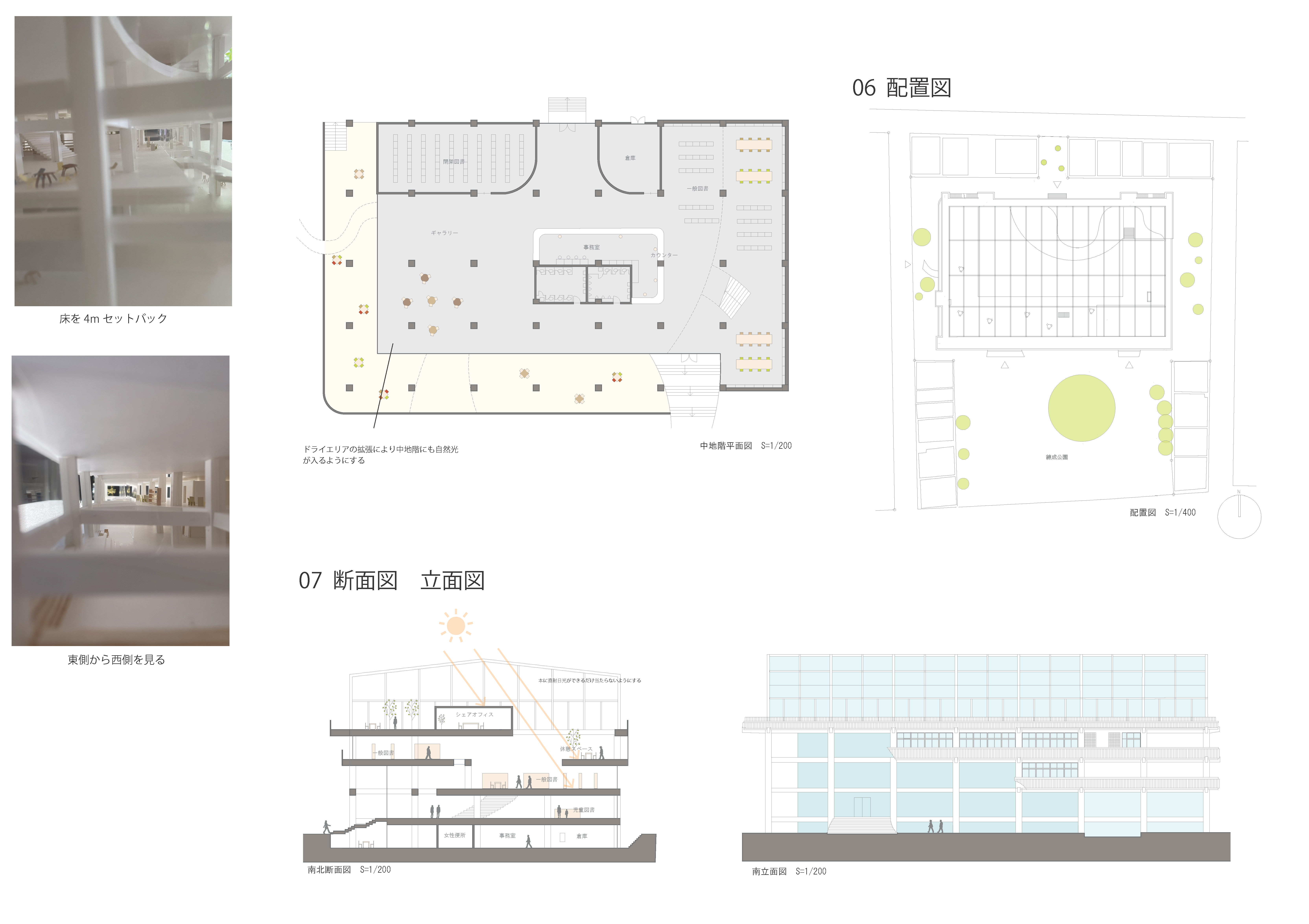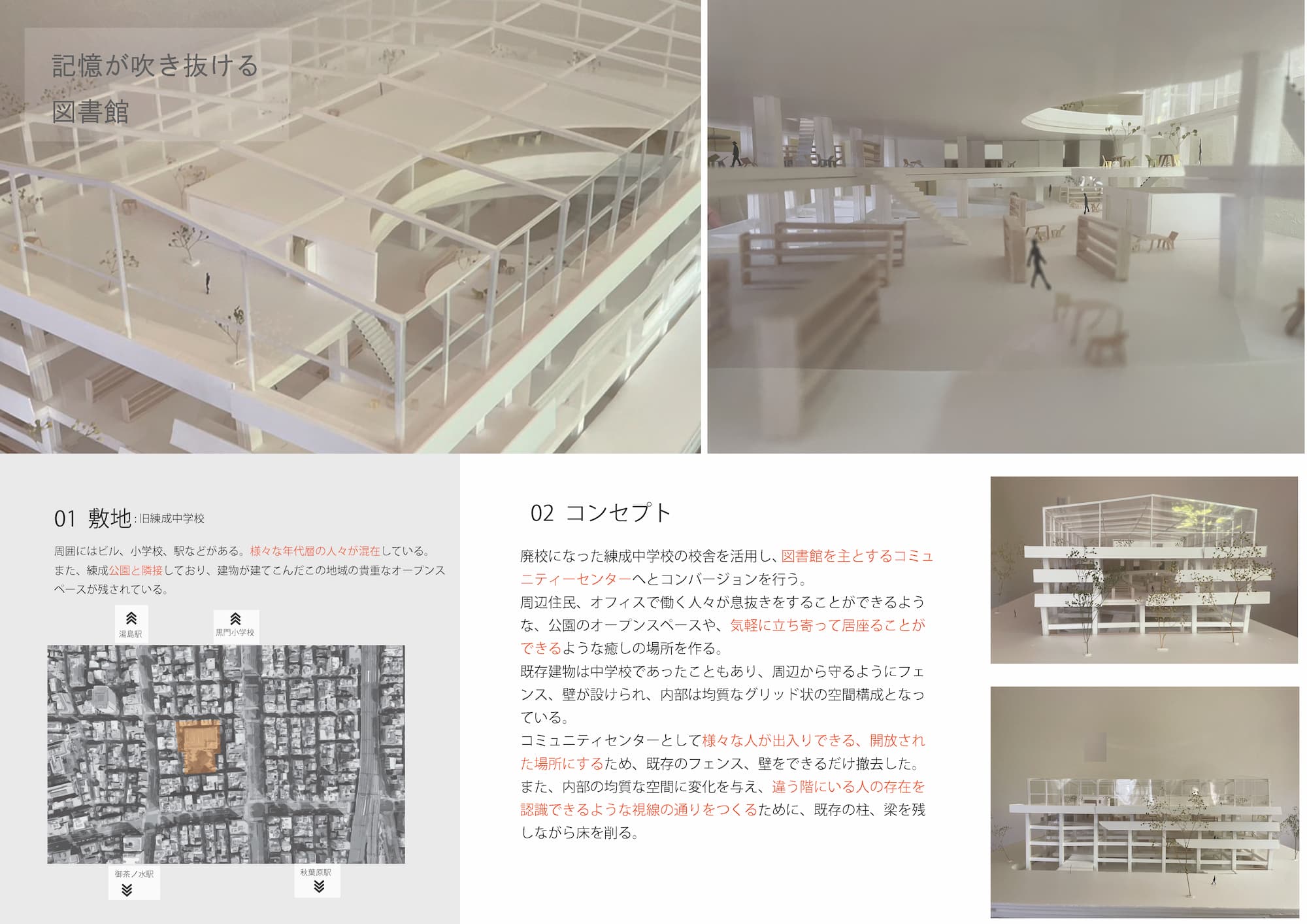 練成中学校の敷地の特徴は、駅や大通りの賑やかな場所の近くにあるという反面、大通りから一歩外れると、ビルやマンションなどの建物が建て込んでおり、対象敷地はそれらの建物に囲まれている。そのため、周辺住民、オフィスで働く人々が息抜きをすることができるような、公園のオープンスペースや、気軽に立ち寄って居座ることができるような癒しの場所を作り、残していくことが必要なのではないか?と考えた。気軽に立ち寄ることもでき、長く居座ることもできる図書館を主としたコミュニティー施設を提案する。