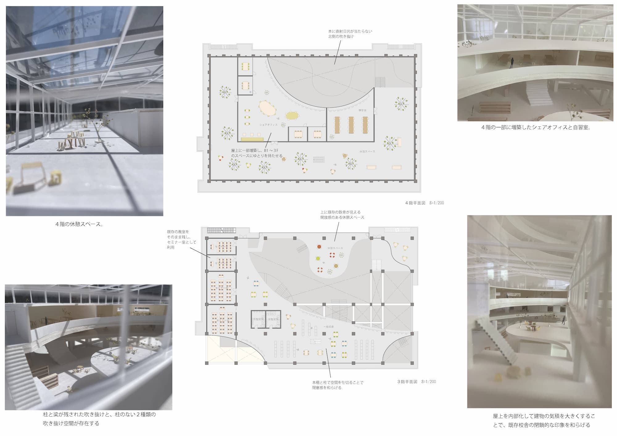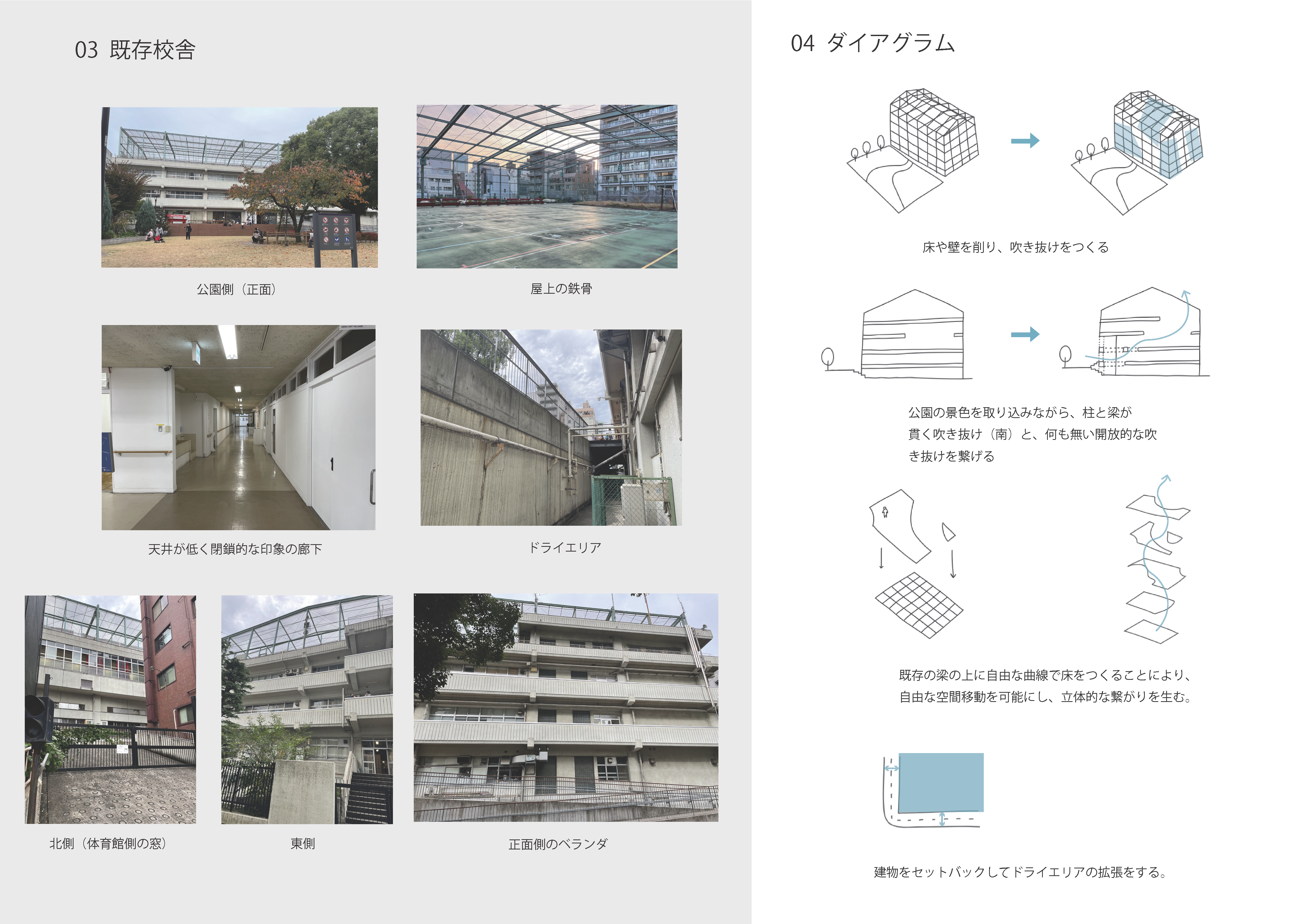 既存建物は中学校であったこともあり、周辺から守るようにフェンス、壁が設けられ、内部は均質なグリッド状の空間構成となっている。