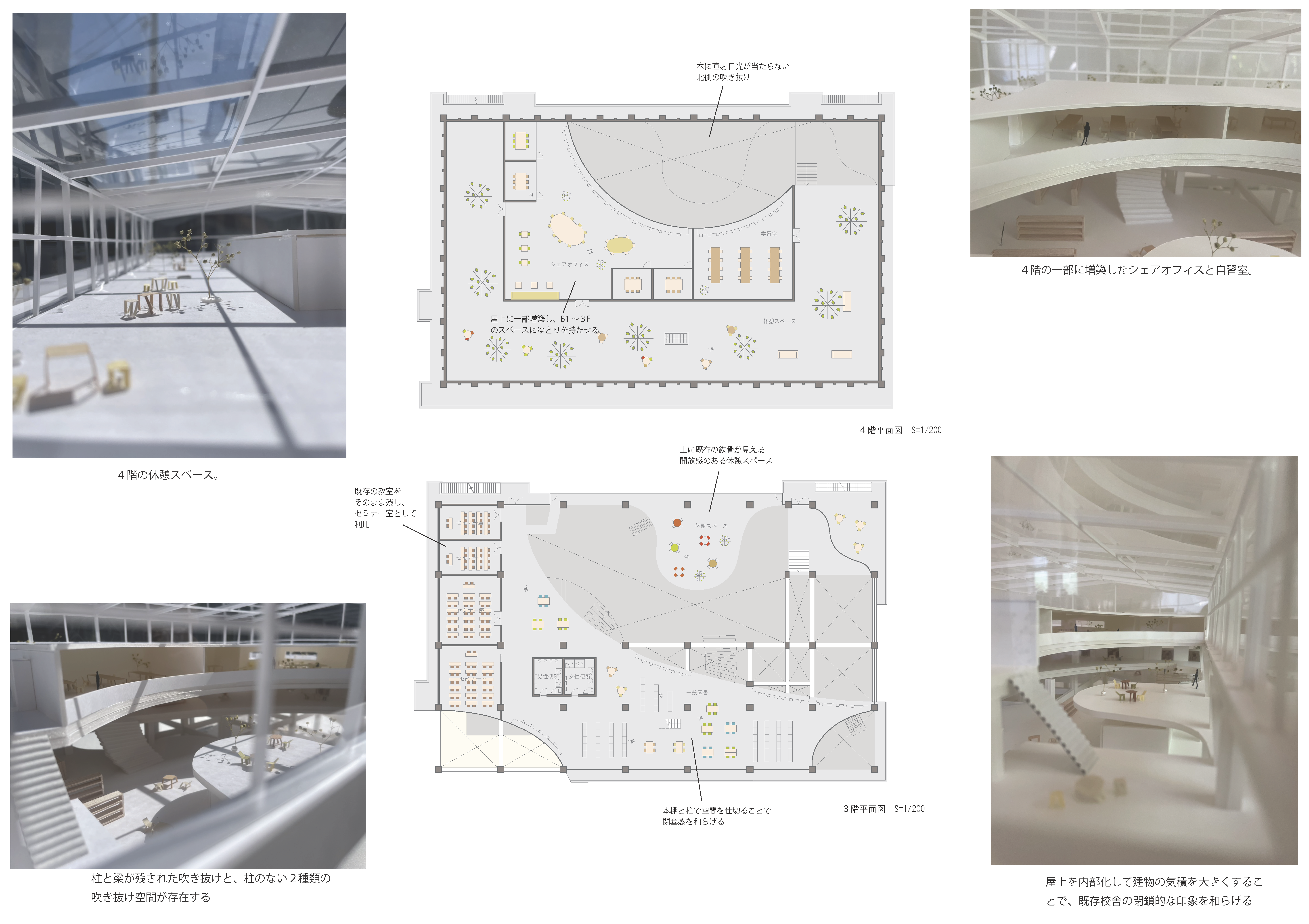 コミュニティセンターとして様々な人が出入りできる、開放された場所にするため、既存のフェンス、壁をできるだけ撤去した。また、内部の均質な空間に変化を与え、違う階にいる人の存在を認識できるような視線の通りをつくるために、既存の柱、梁を残しながら床を削る。