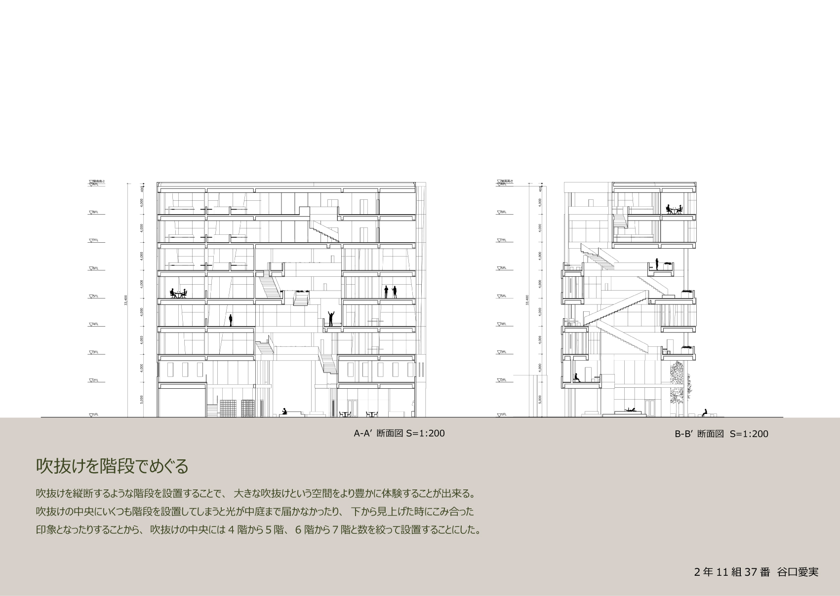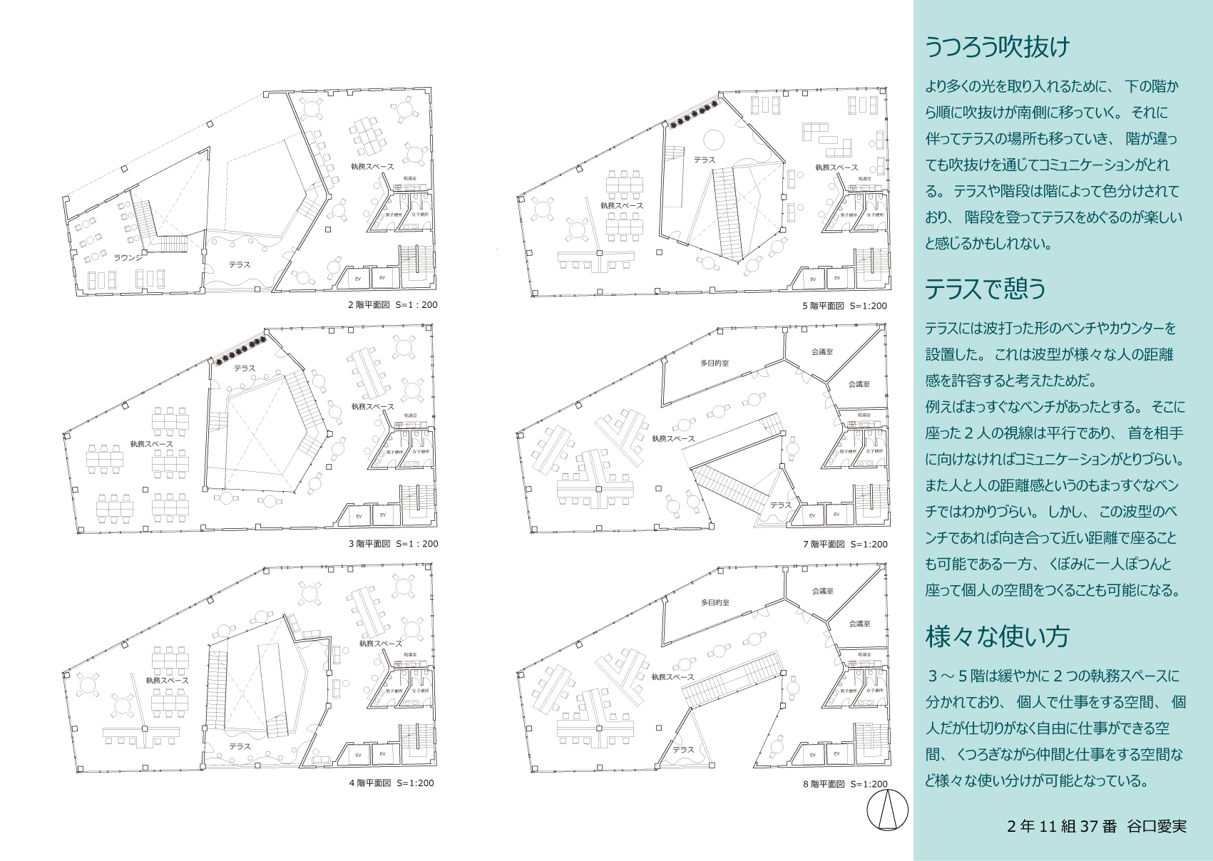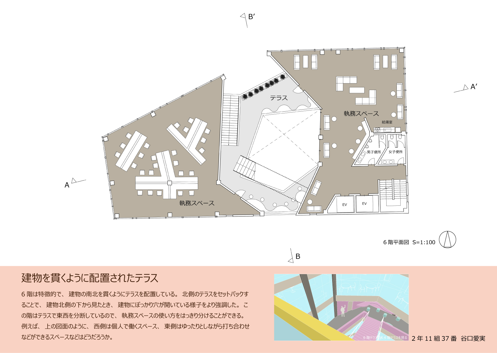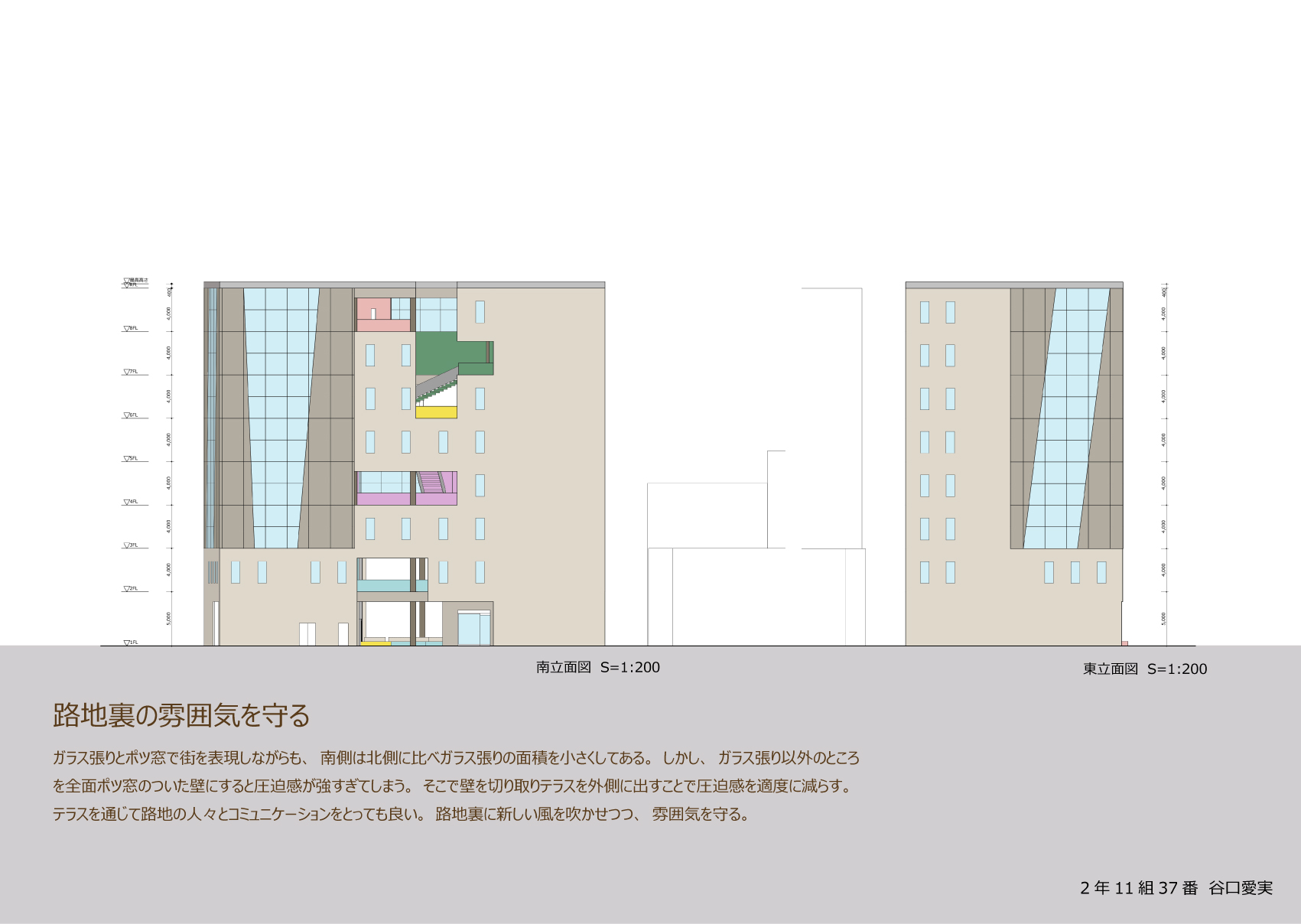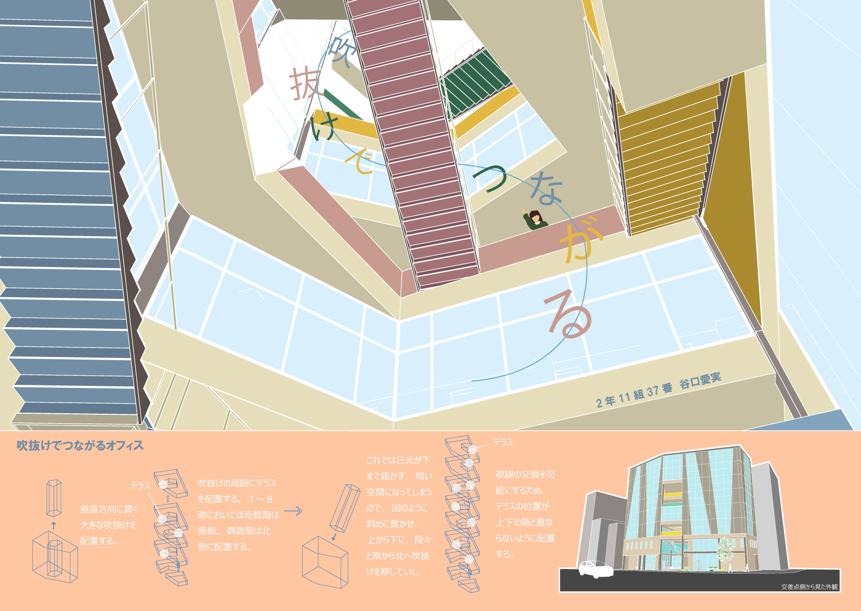 そこで、街の広場となるオフィスを提案する。人と人とのつながりをテーマに、建物中央の大きな吹抜けを介したコミュニケーションを図る。これにより階層を超えた交流や訪問者との交流を深められ、新たなアイデアが生み出されるきっかけとなるだろう。吹抜けの周りに建物内外を繋ぐテラスを配置することで、コミュニケーションの輪が建物内だけに限定されず、周囲に広がっていく。また、立体的な空間に新しい色彩を取り入れ、カラフルにすることで、空間を多様化させる。街の要素の寄せ集めである外装の中にカラフルなテラスが垣間見えることで、街に調和しながらも新しさをもたらす。