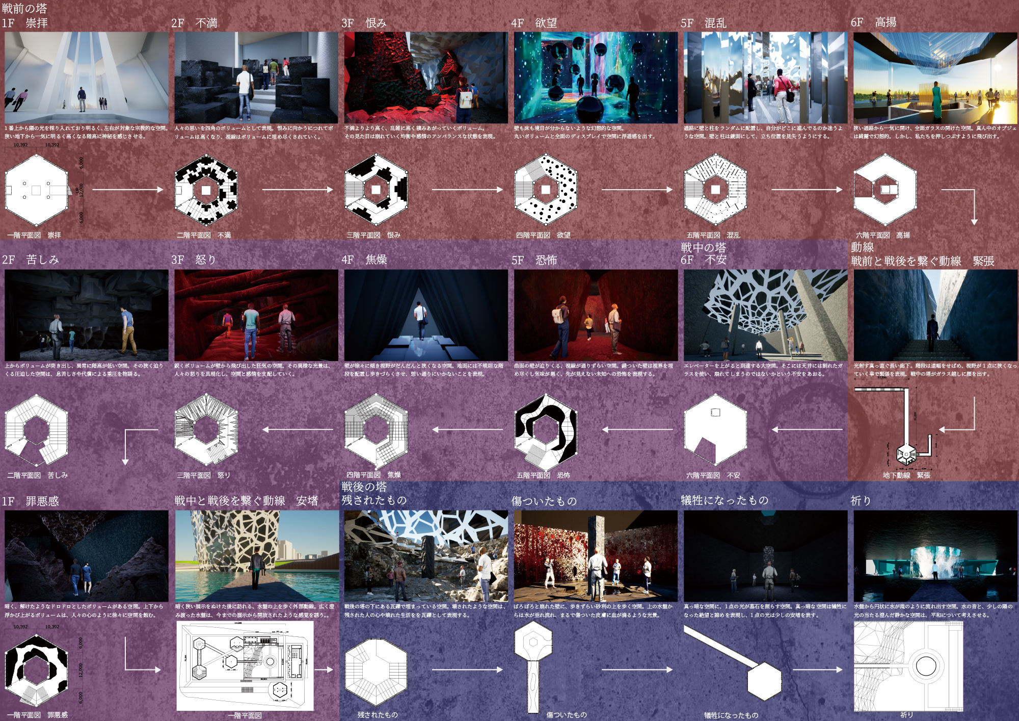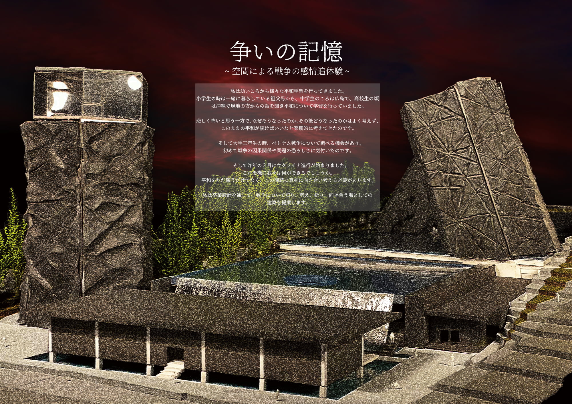 対象敷地の特徴を生かすため、大人から子供まで誰もが興味を持ち、体験談や写真を使わない、建築の空間だけで戦争の恐ろしさを体験させる今までにない新たな平和学習施設を提案する。