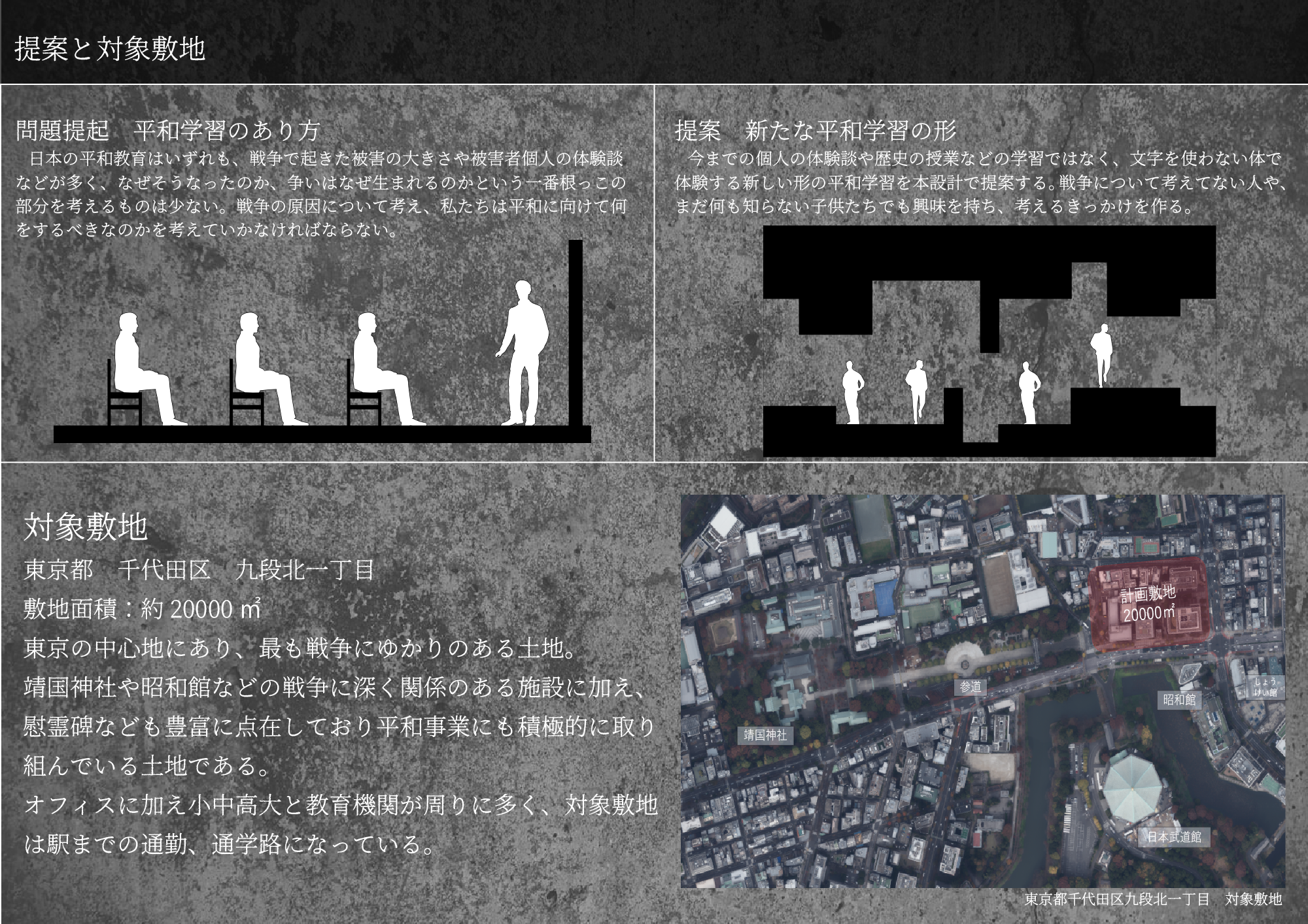 本制作では戦争の記憶が色濃く残る東京都・千代田区の九段下を敷地に選定した。周りには教育機関が多く立地しており、対象敷地は駅までの通学路にもなっている。