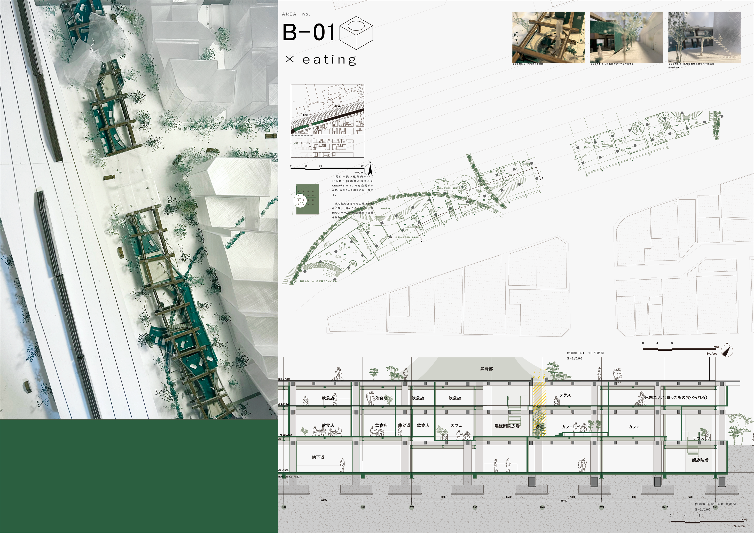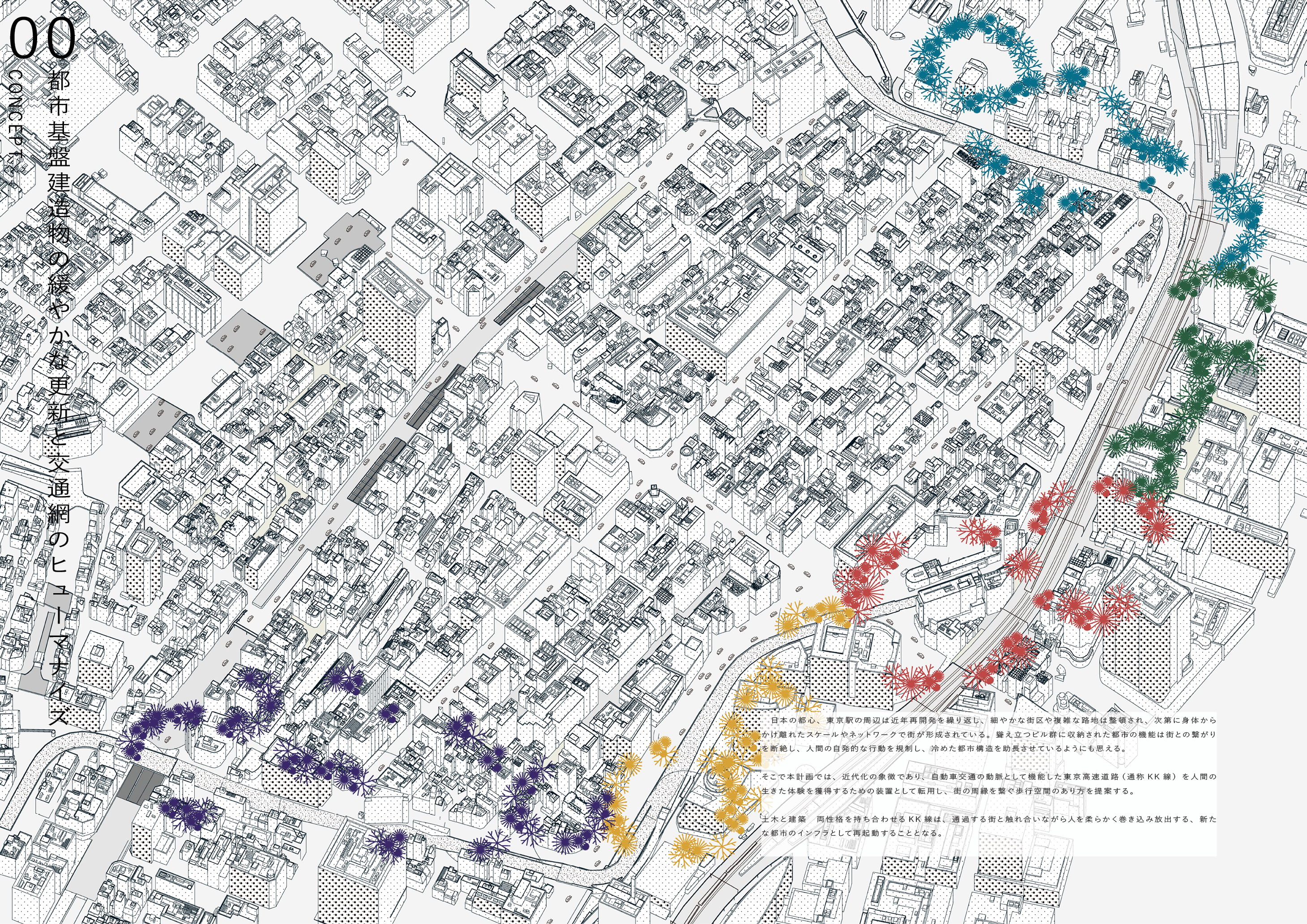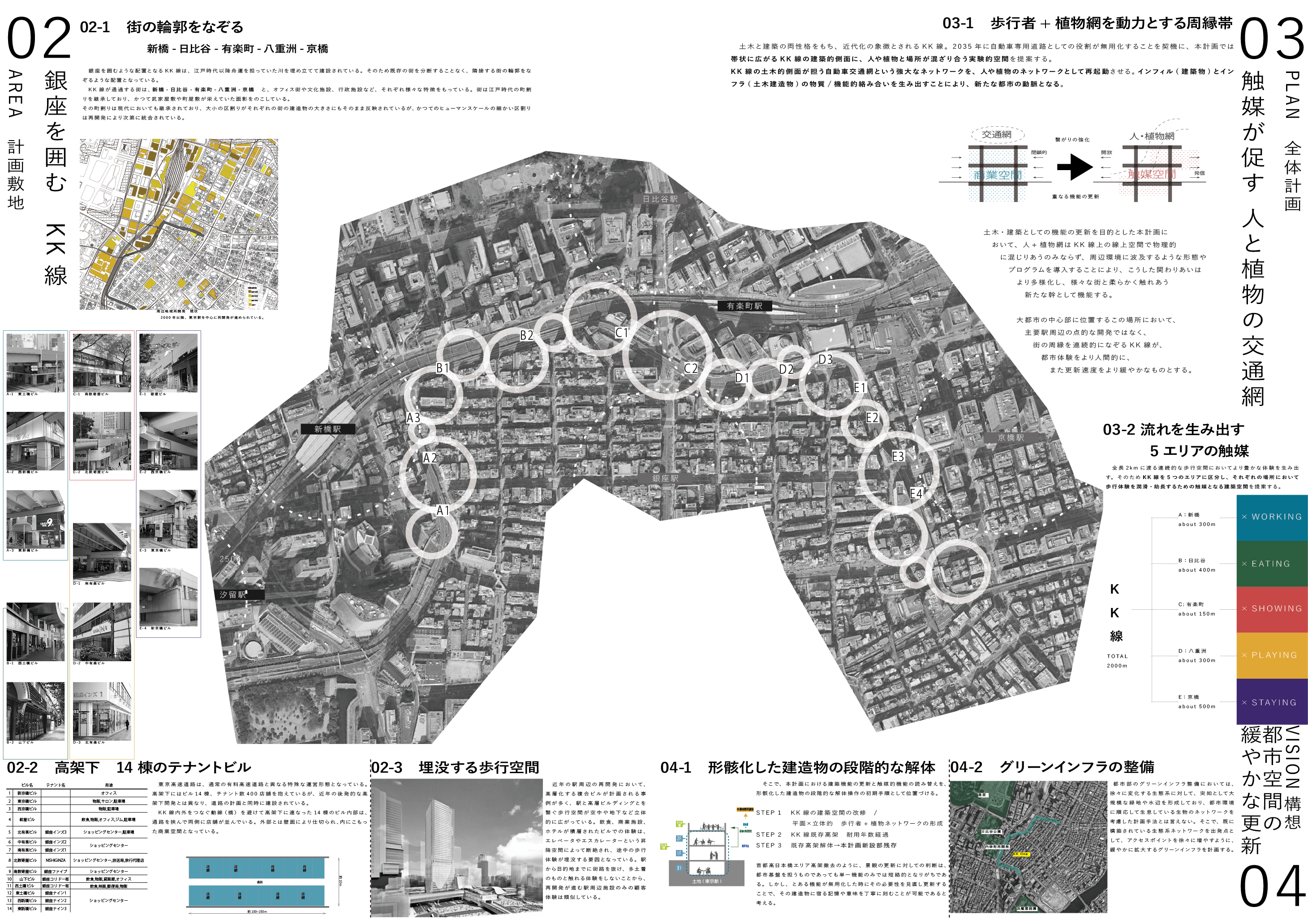 本計画では2035年に自動車専用道路としての役割が無用化することを機に、自動車交通網を支える機能を有していたKK線を、人や植物の繋がりを支える基盤として再起動させることを目的とする。隣接する街の延長として計画した滞在/創造/食などの異なる性質をもつ5つのエリアの建築は、歩行者の回遊性を促す触媒として機能し、街・人・植物の様々な出会いのきっかけを生み出す。