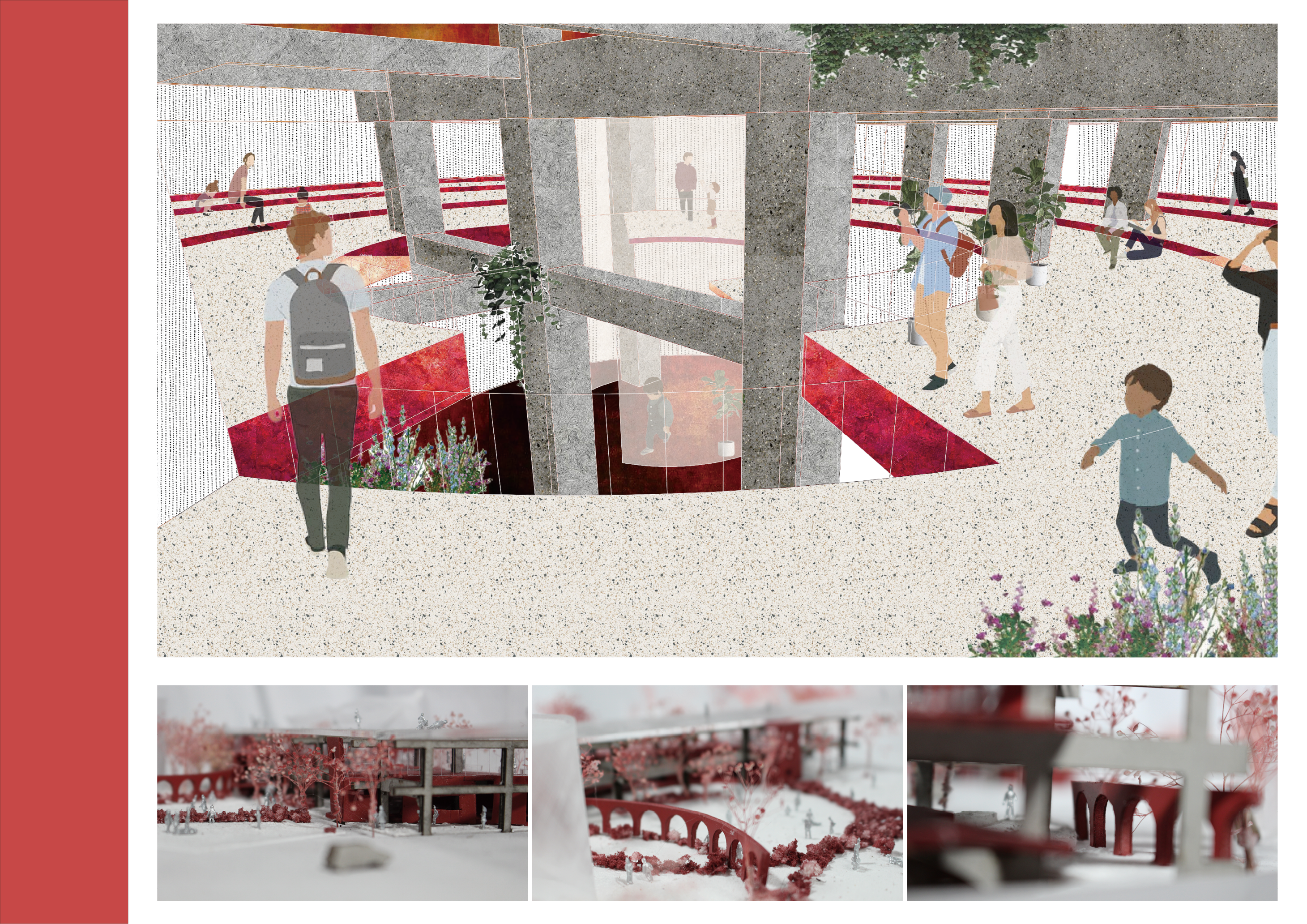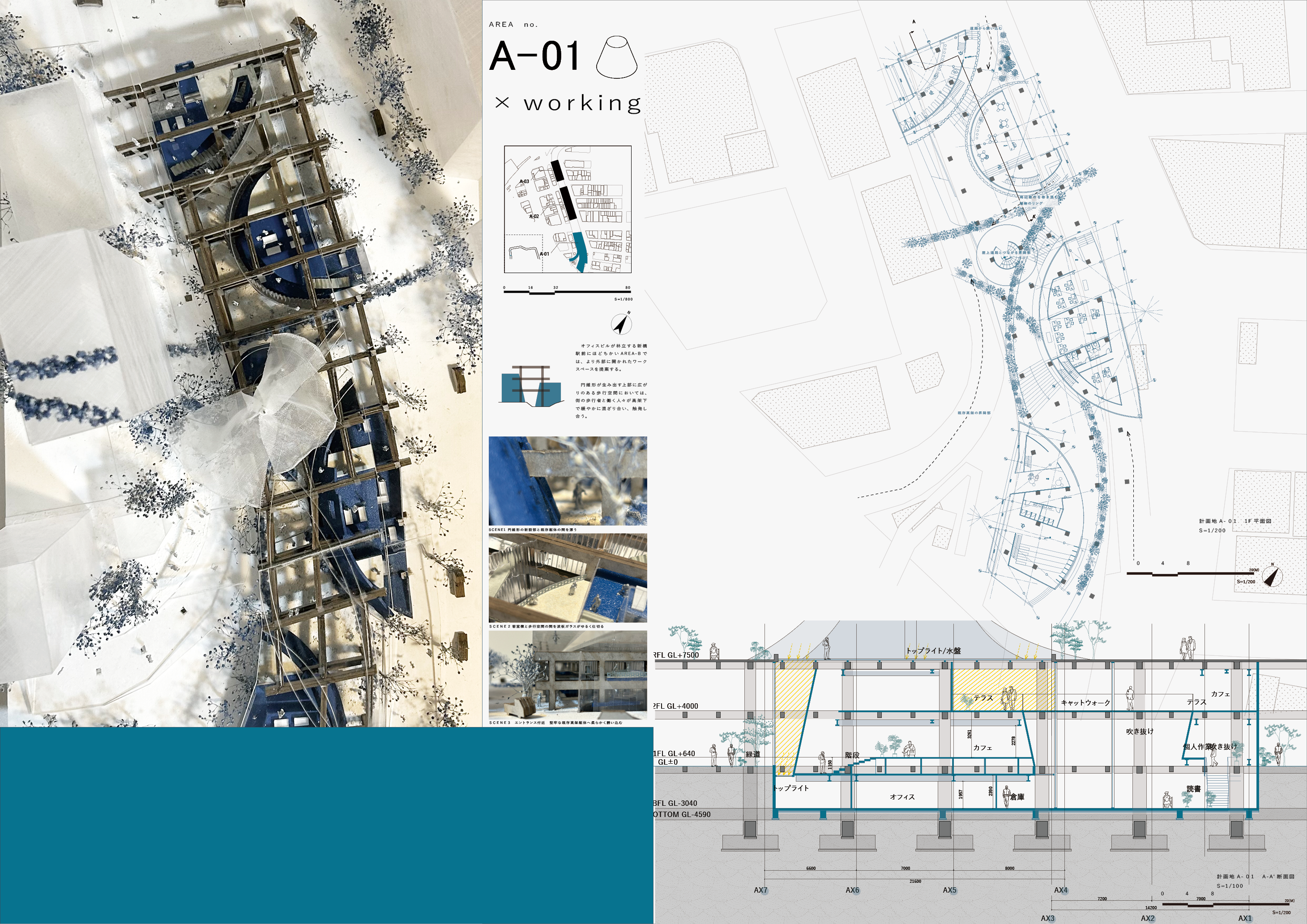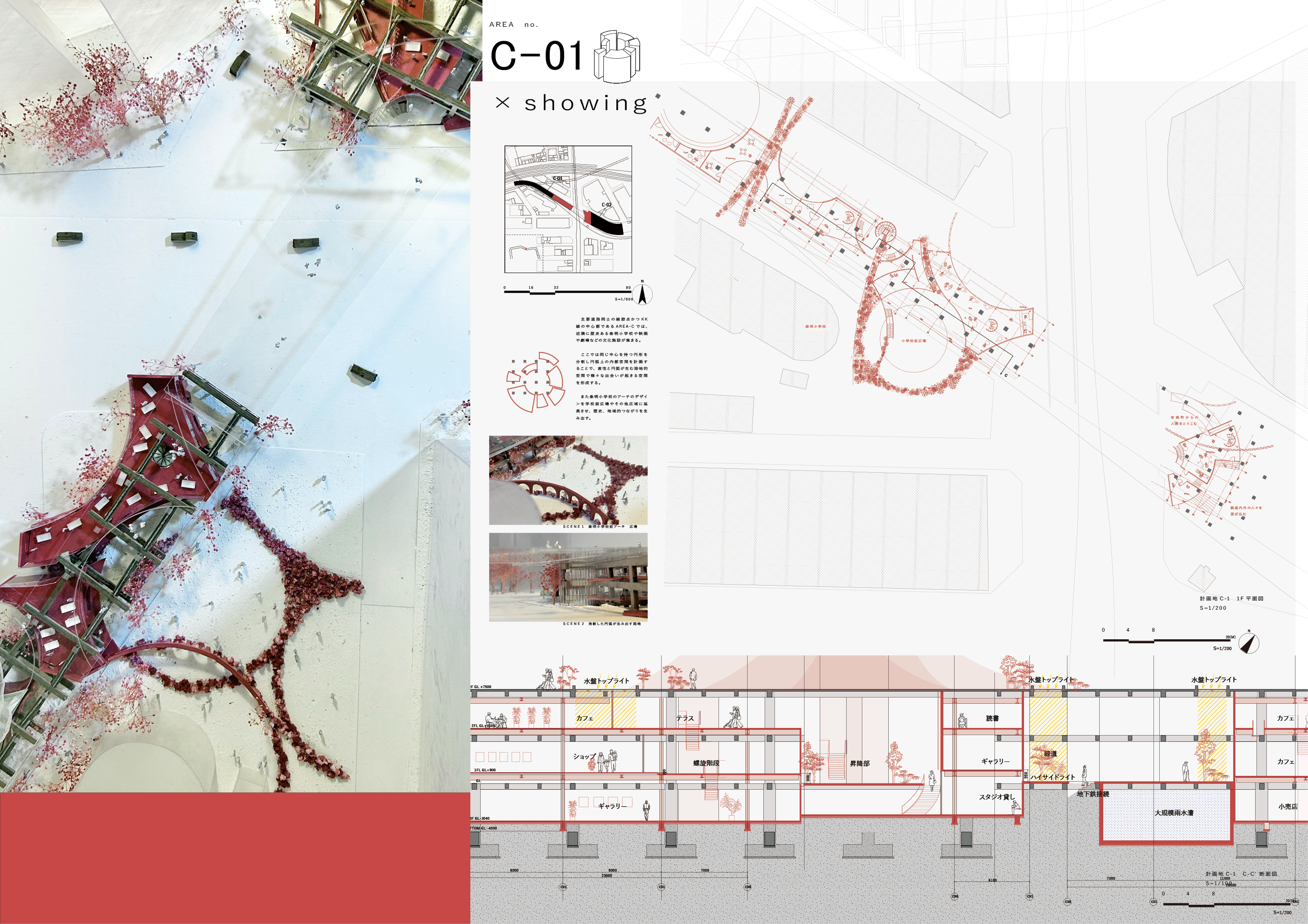 本計画では2035年に自動車専用道路としての役割が無用化することを機に、自動車交通網を支える機能を有していたKK線を、人や植物の繋がりを支える基盤として再起動させることを目的とする。隣接する街の延長として計画した滞在/創造/食などの異なる性質をもつ5つのエリアの建築は、歩行者の回遊性を促す触媒として機能し、街・人・植物の様々な出会いのきっかけを生み出す。