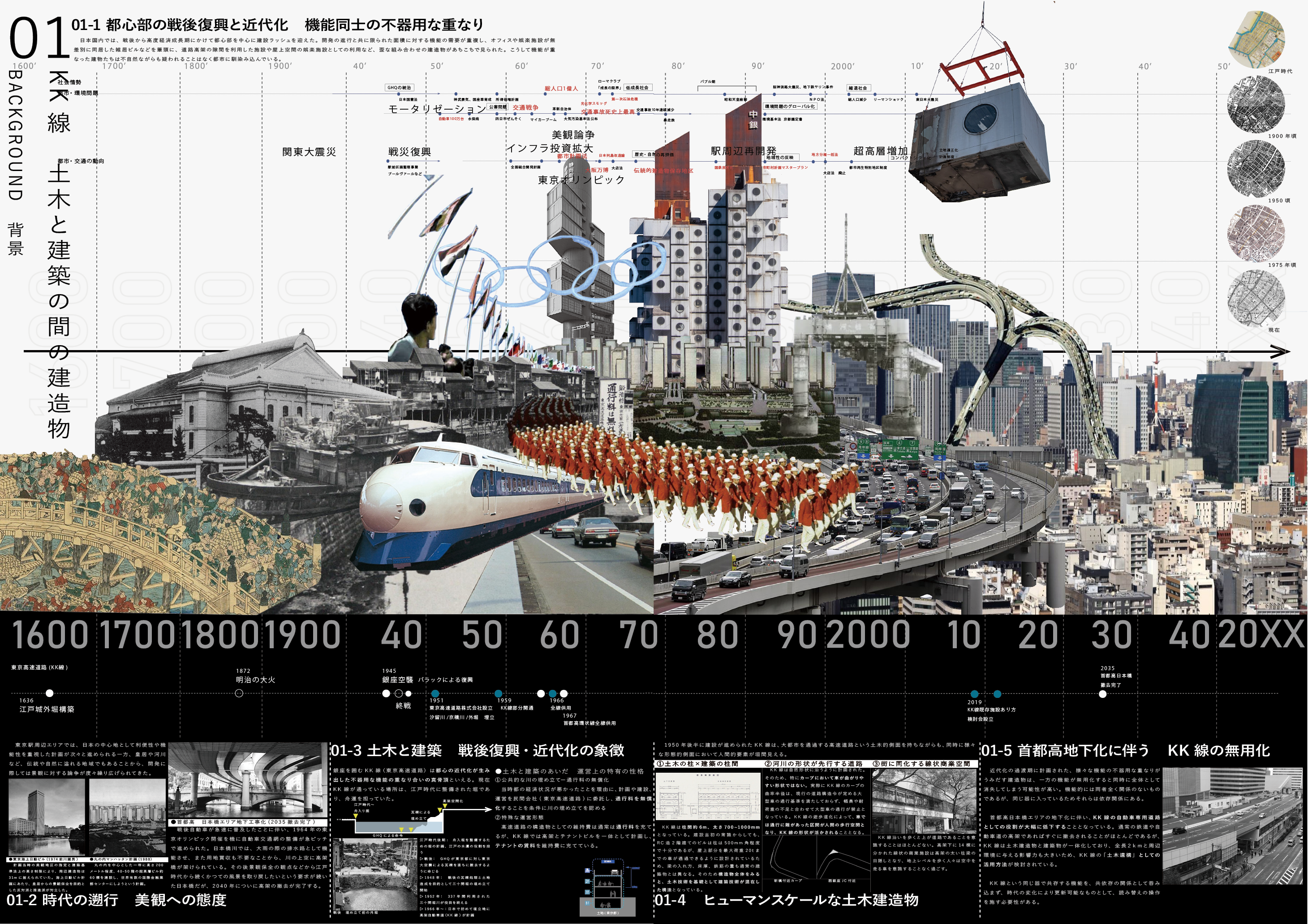国内では、戦後から都心部を中心に建設ラッシュを迎え、限られた面積に対する機能の需要が重複し、歪な組み合わせの建造物が各地で見られるようになった。中でも銀座を囲むように敷かれている東京高速道路(KK線)は、近代化の最中に生まれた建造物で、土木と建築の両性格を持つ。