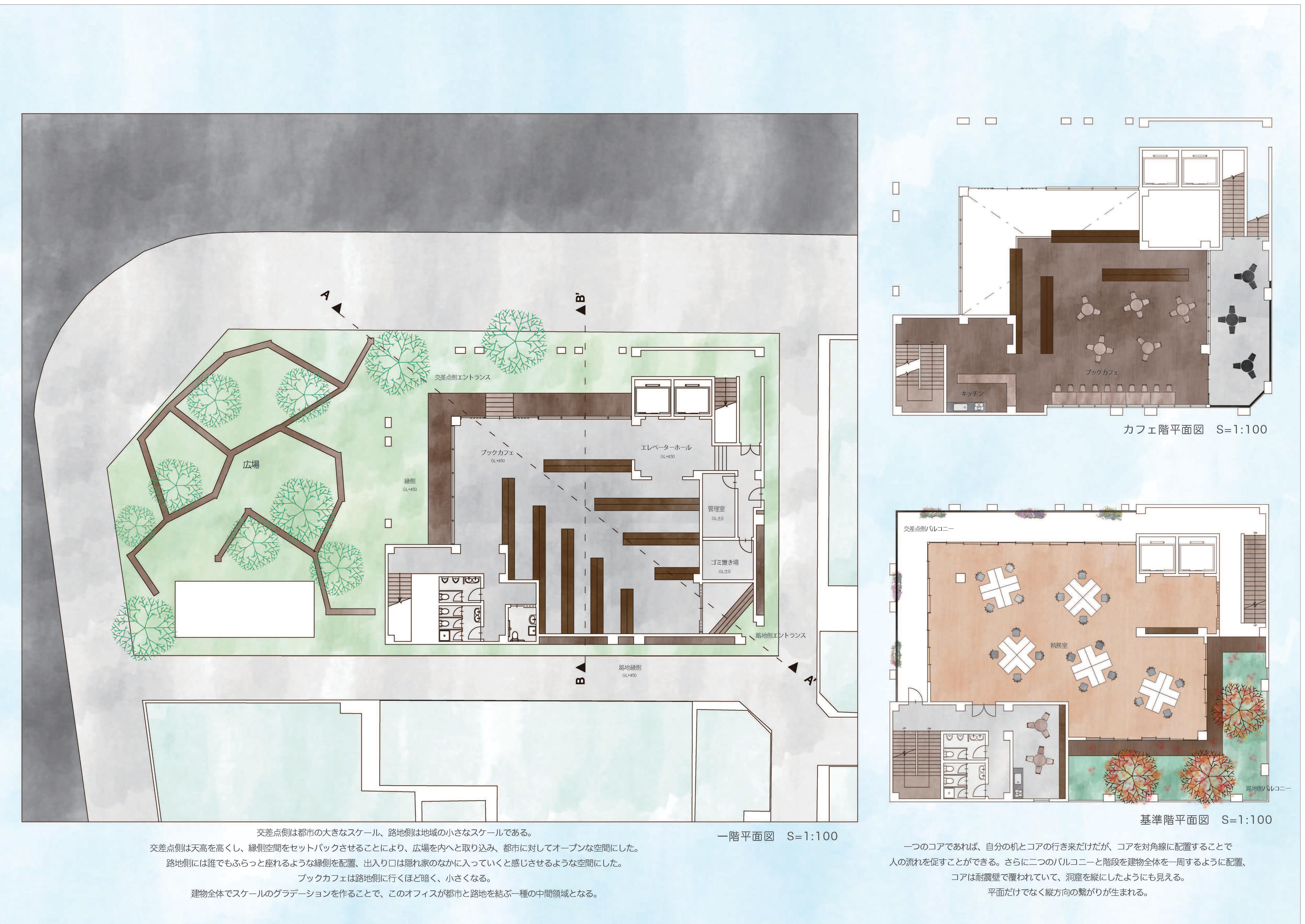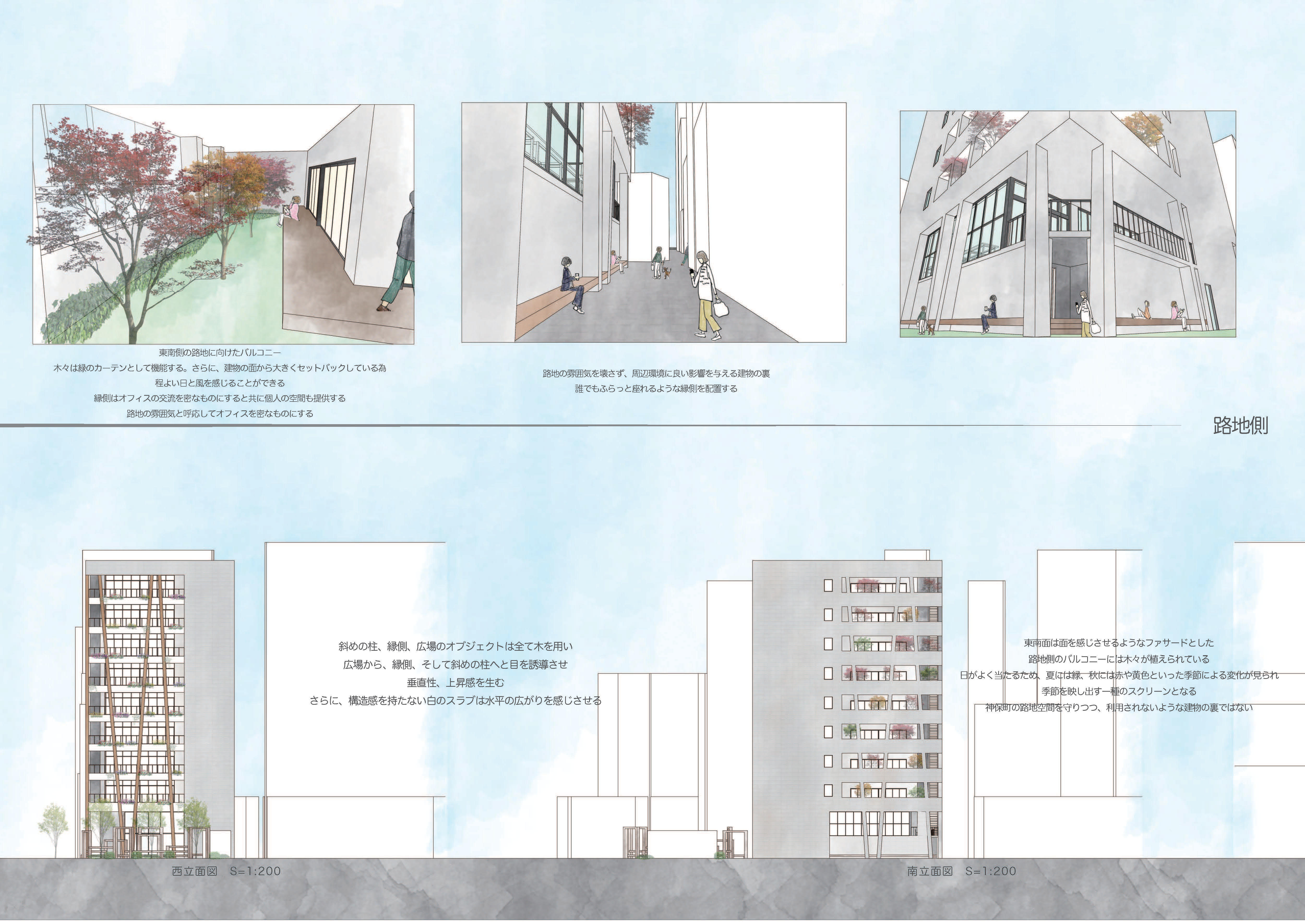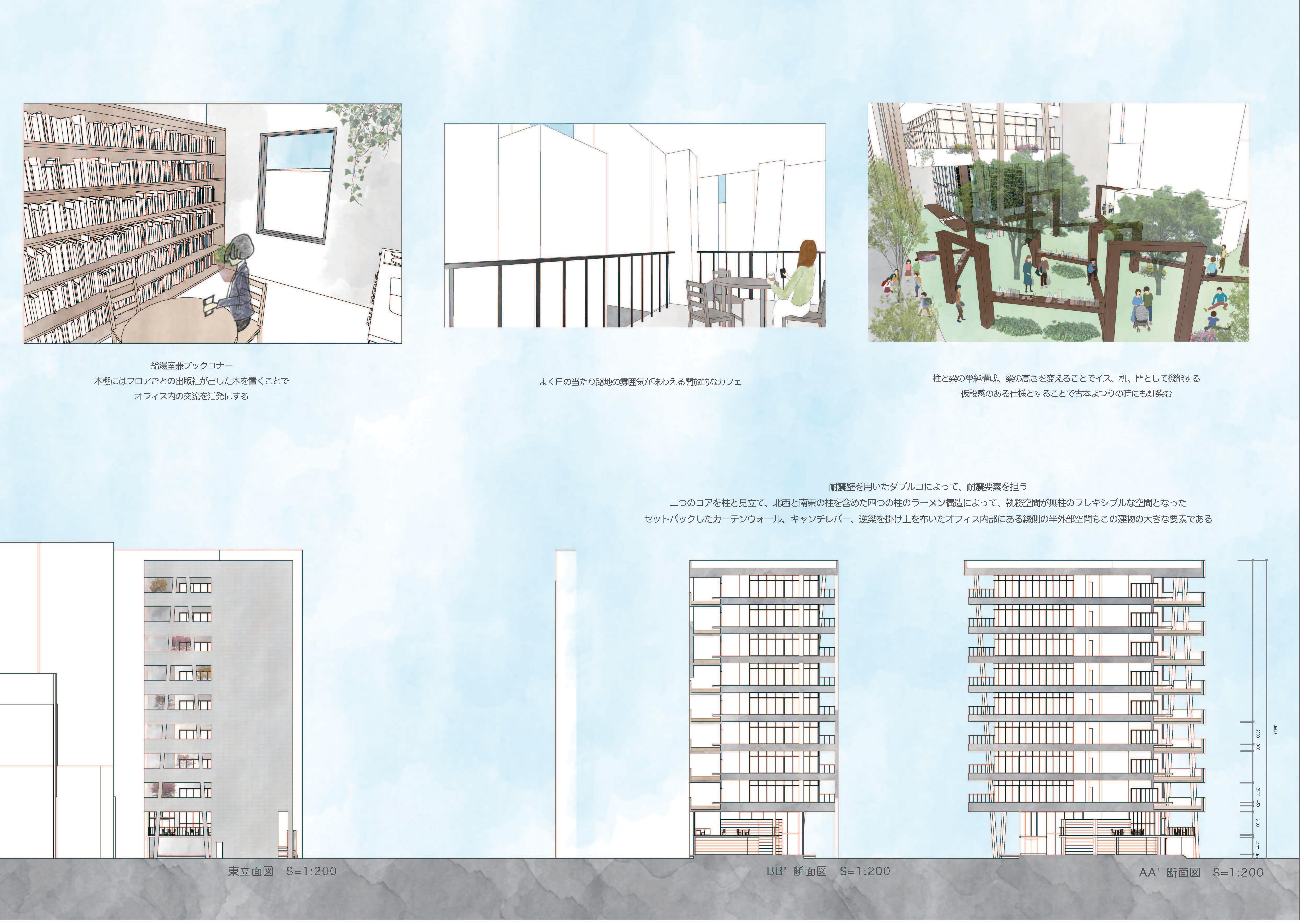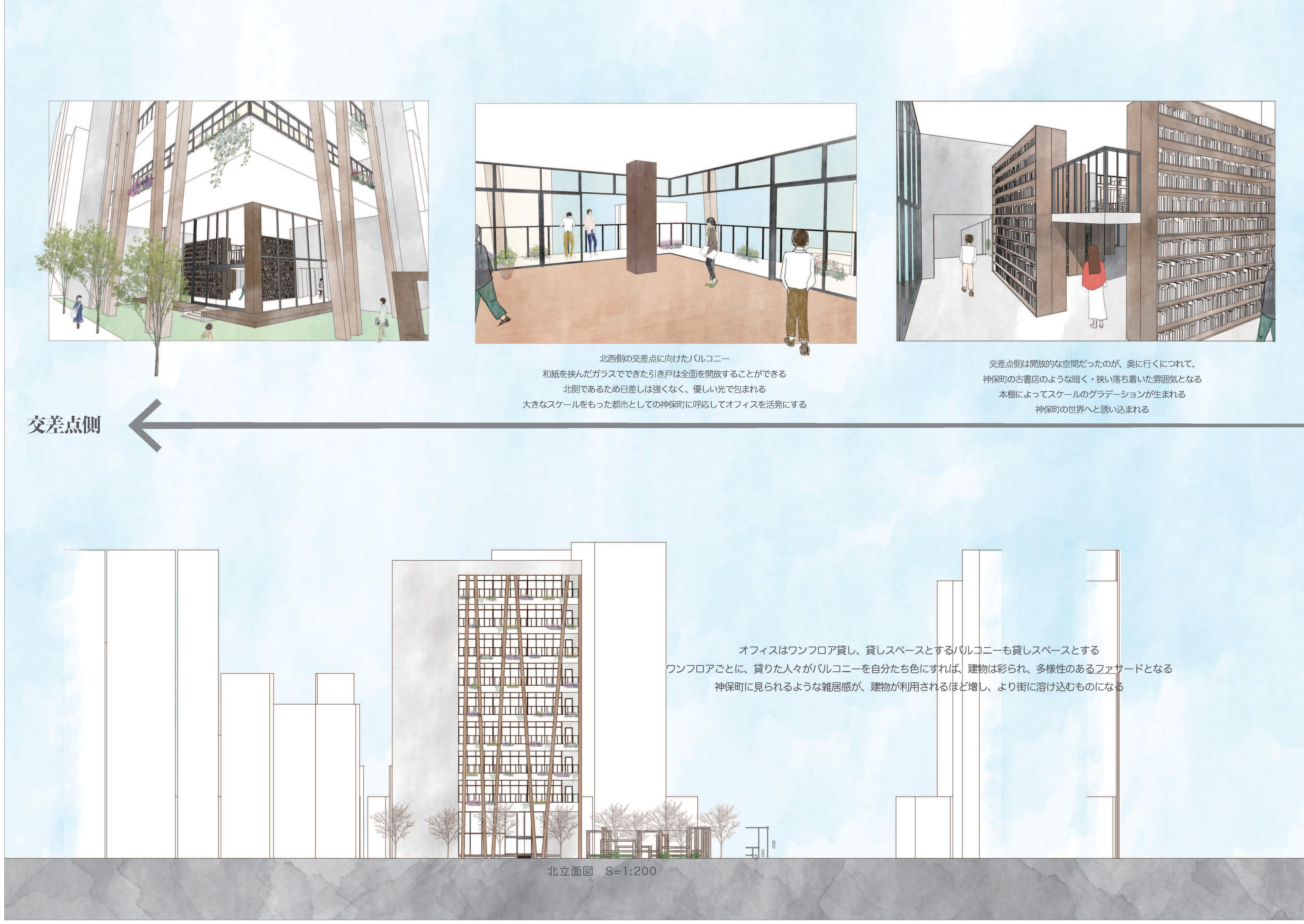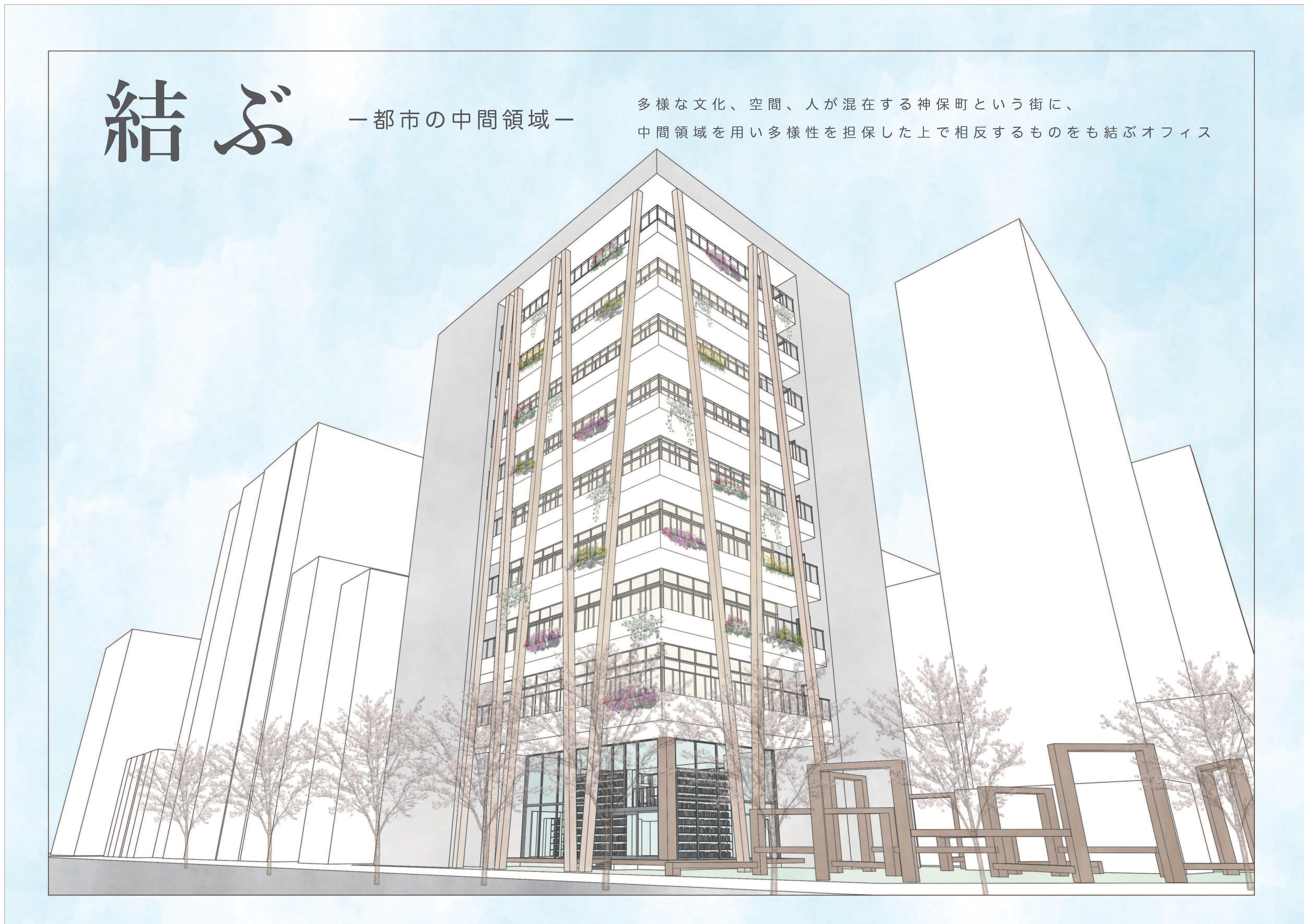 交差点と路地空間をグラデーショナルに繋ぐブックカフェ、鳥居をイメージさせるオフィスの外観、それに呼応した広場のオブジェクト。オフィスを取り囲むように配置された縁側。大きなスケールと小さなスケールの仕掛けによって中間領域と化したこのオフィスは神保町の全ての要素を受け入れ、特異な差を結ぶ媒体となる。さらに、受容された要素はオフィス内外の人の営みによって変化するバルコニーのアレンジや建物内から漏れ出す光としてオフィスのファサードに現れる。それにより、このオフィスは神保町を発信する媒体にもなる。