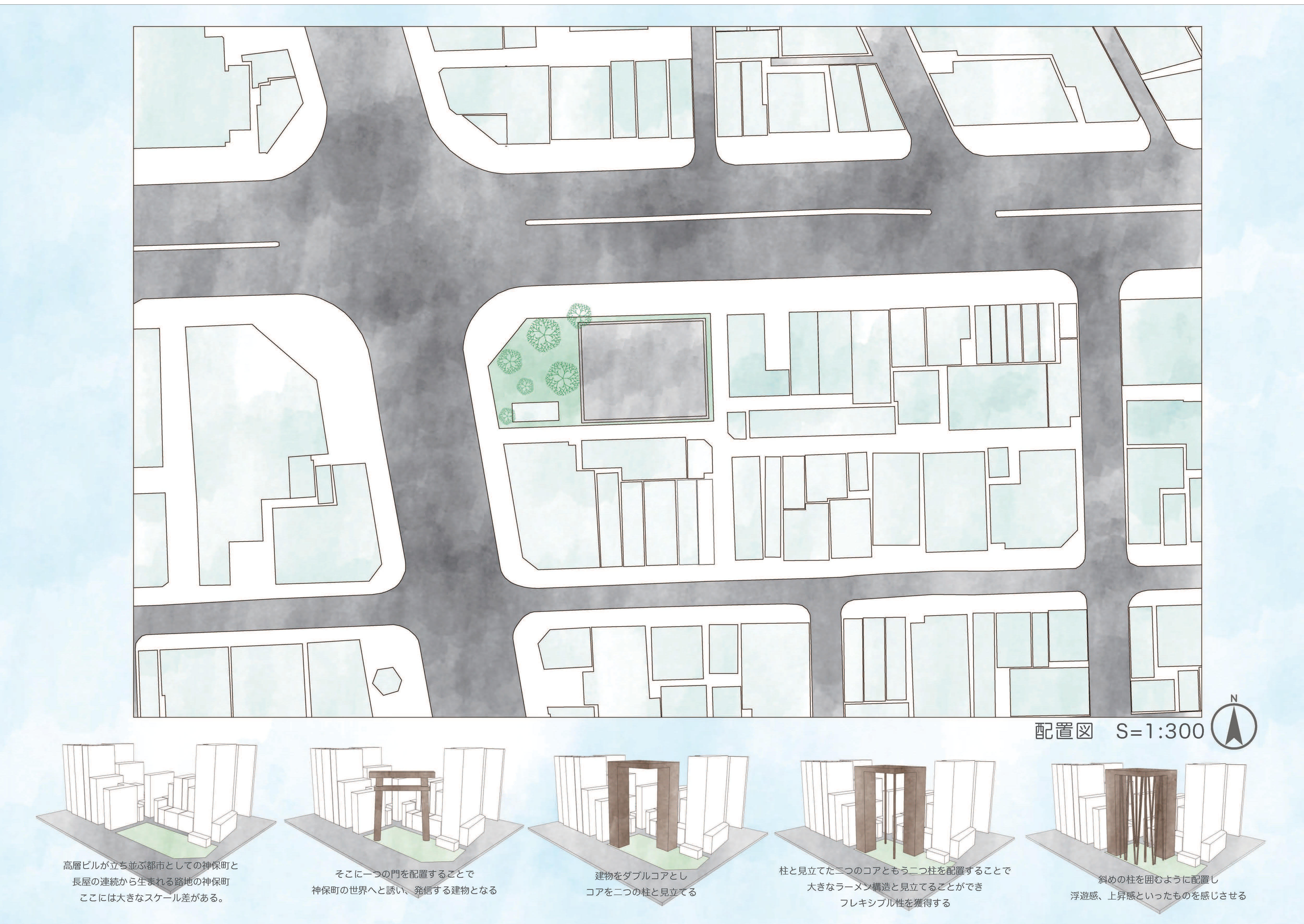 大都市としての大きなスケールを持った大通りと文化を守り続けてきた長屋の形式が連続する小さなスケールを持った路地。仕事として訪れる人や本やカレーといった趣味のために訪れる人、もしくは、異なる都市から都市への移動のために訪れる人がいる。 このように、多様な文化、空間、人といった要素が混在し、さらには相反しさえする神保町という街に、私は、中間領域を置いてみようと考えた。